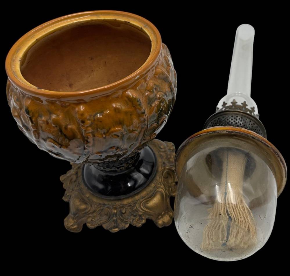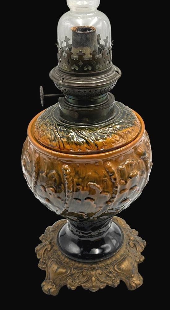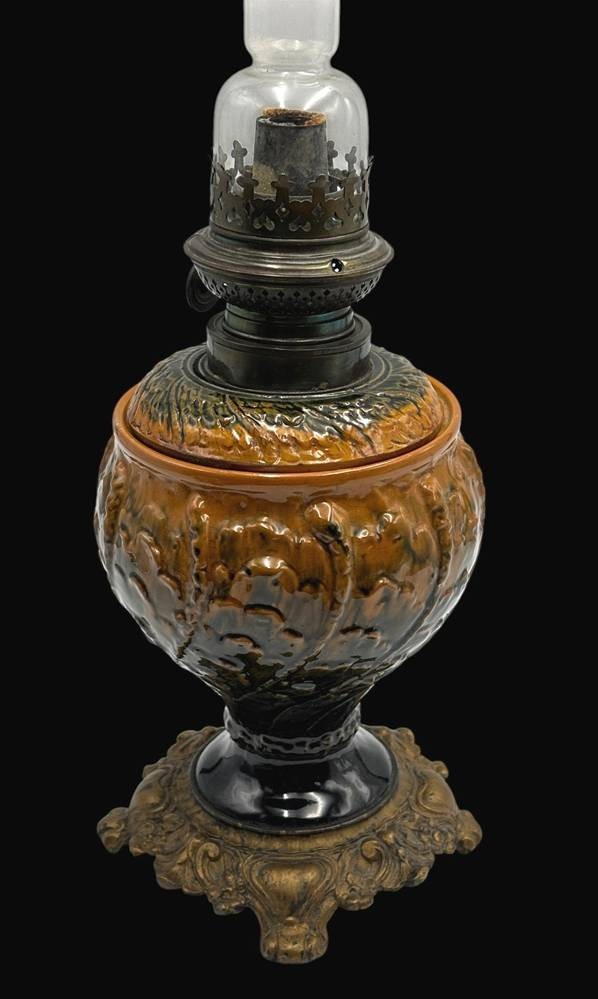 Petroleumlampe mit Fayence-Behälter, H-35 cm, ohne Zylinder, mit H-52 cm