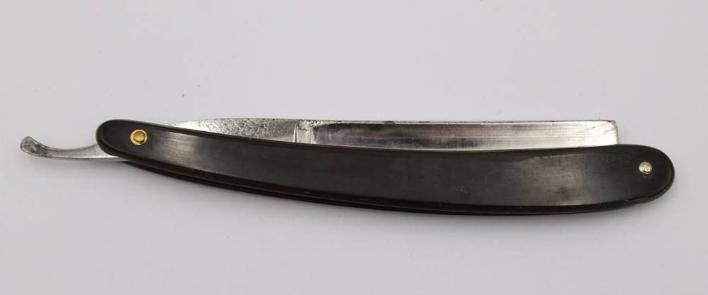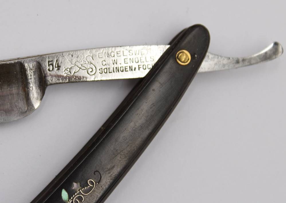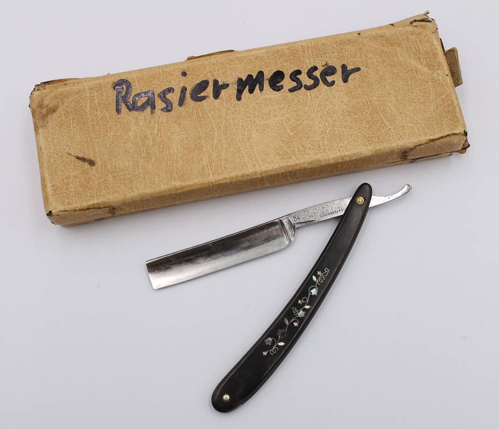 Rasiermesser um 1900, Perlmutteinlagen, sowie Streichleder, Karton mit starken Altersspuren, ca. L-zusammengekl. 13,5cm [1]