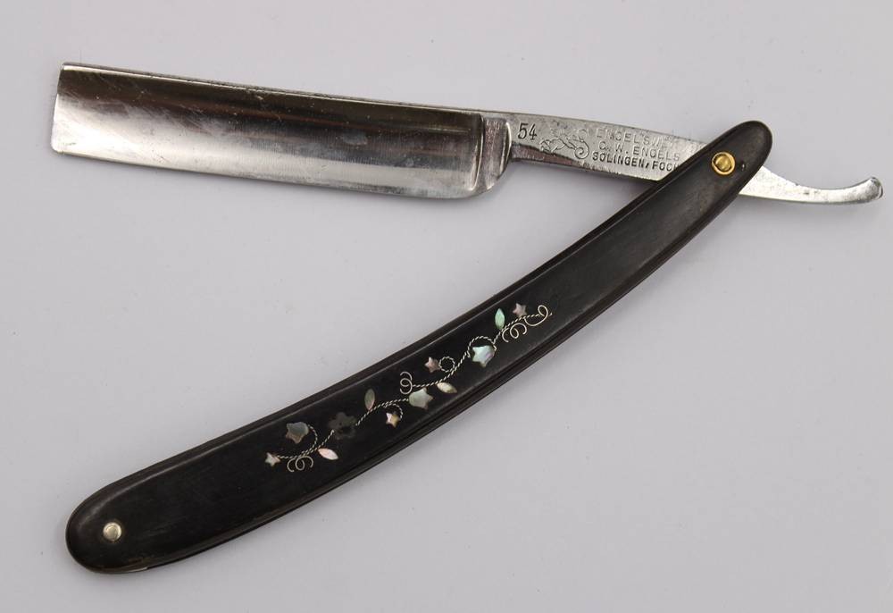 Rasiermesser um 1900, Perlmutteinlagen, sowie Streichleder, Karton mit starken Altersspuren, ca. L-zusammengekl. 13,5cm