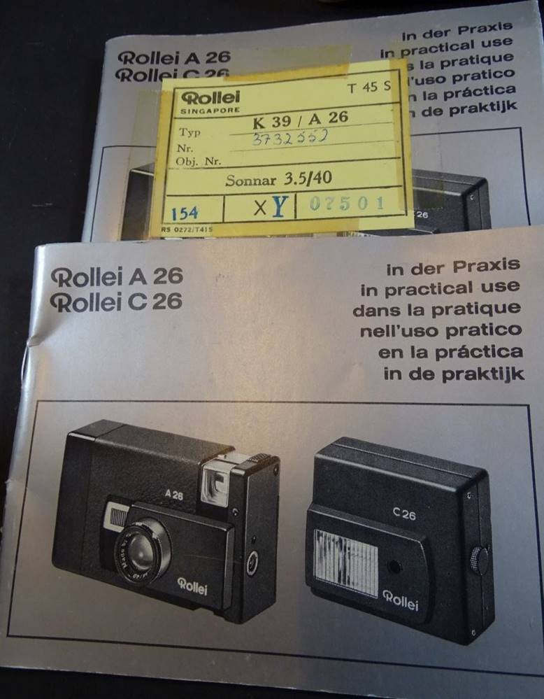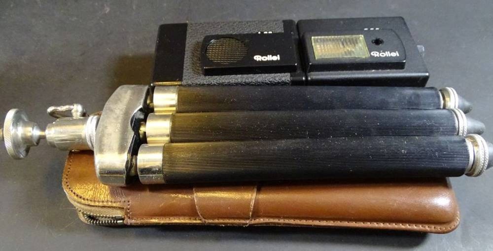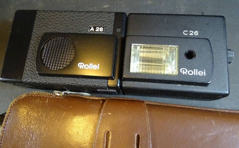ROLLEI A 26 Analogkamera und C26 Blitzgerät mit Bedienungsanleitungen und Stativ in Lederhülle [1]