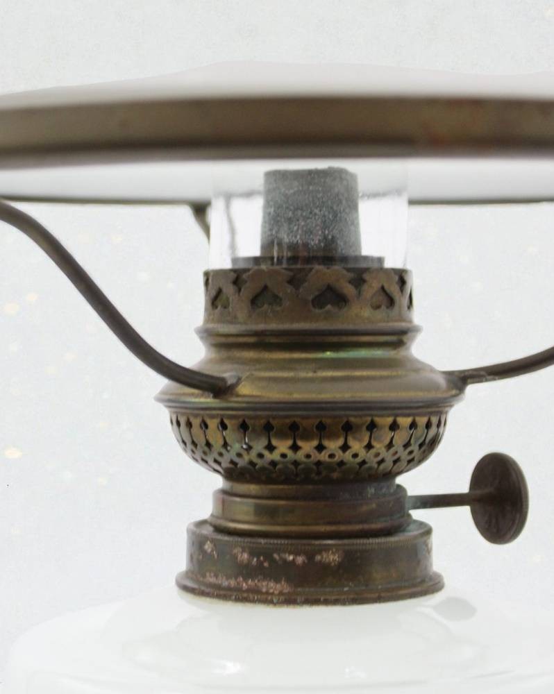 schöne Petroleumlampe um 1900, Korpus opakes Milchglas, Schirm weißes Glas mit floraler Bemalung, sehr gute Erhaltung, ca. H-46,5cm [1]