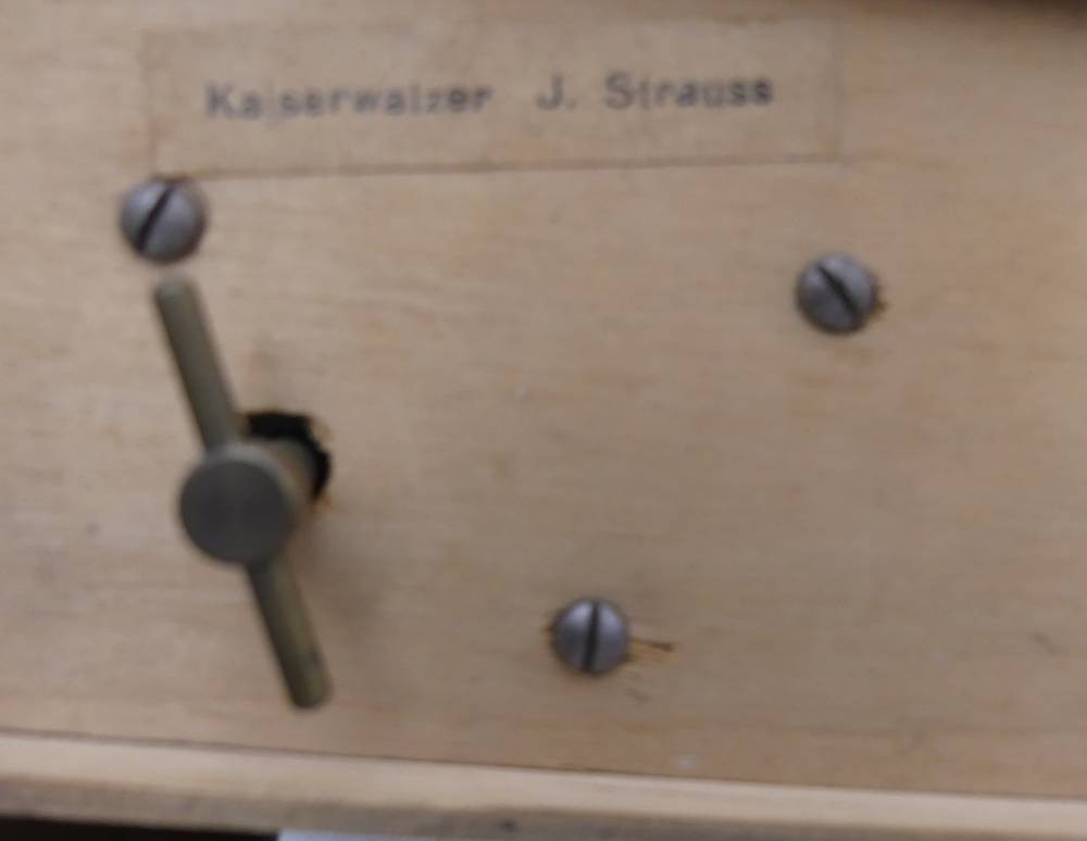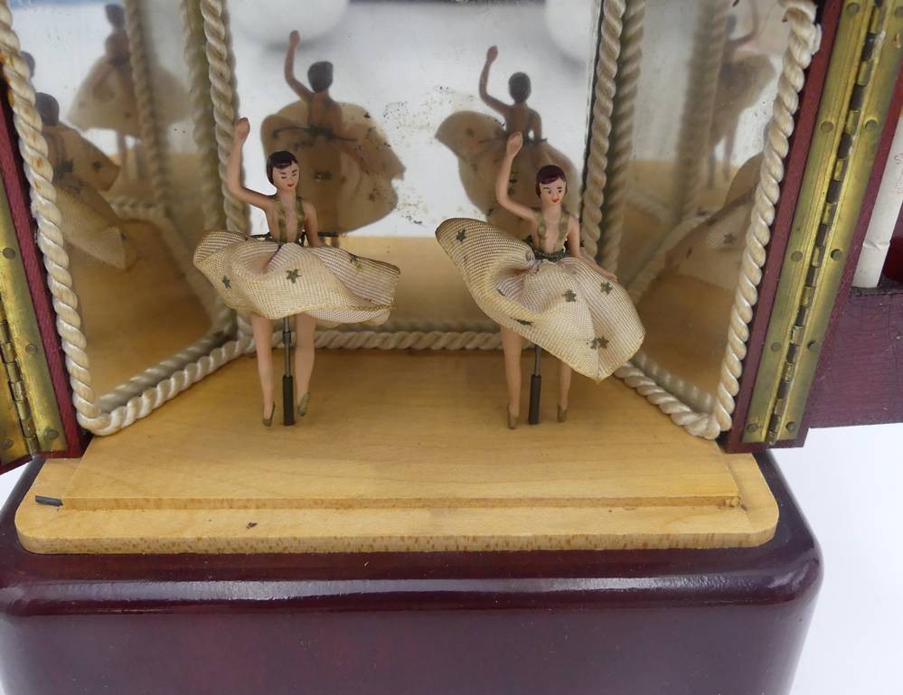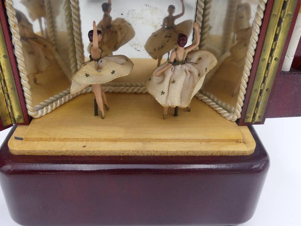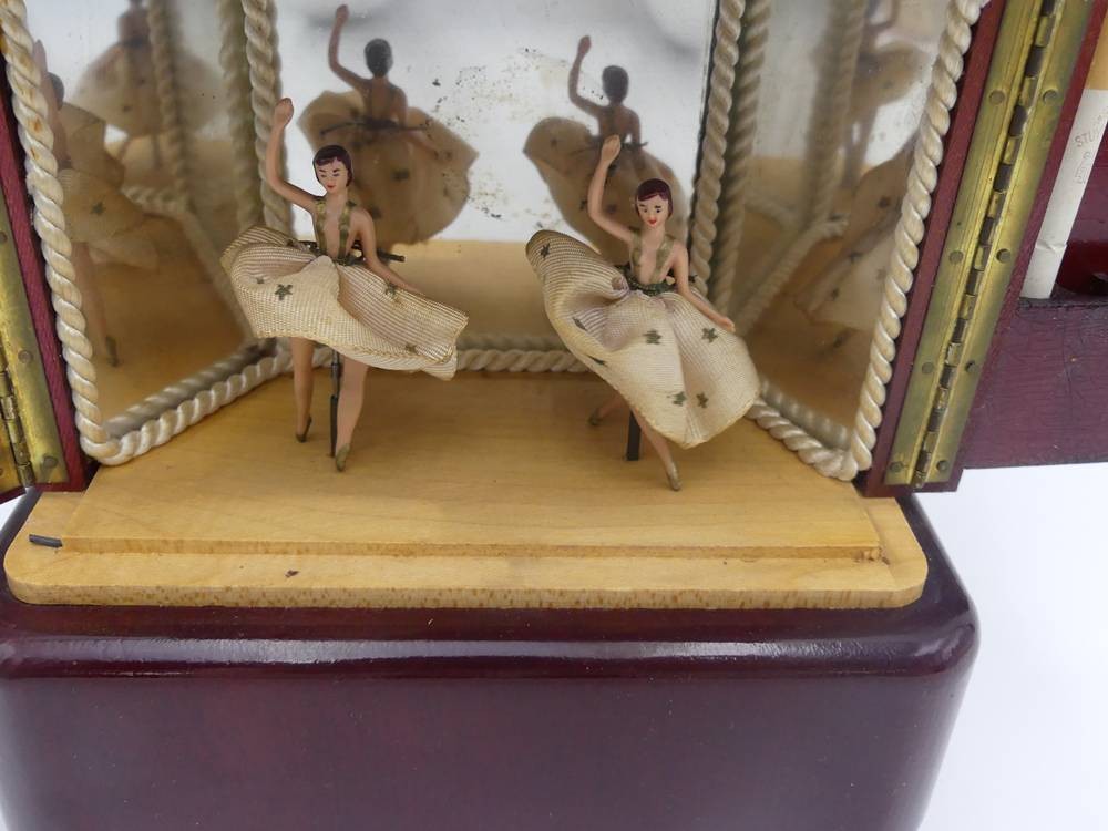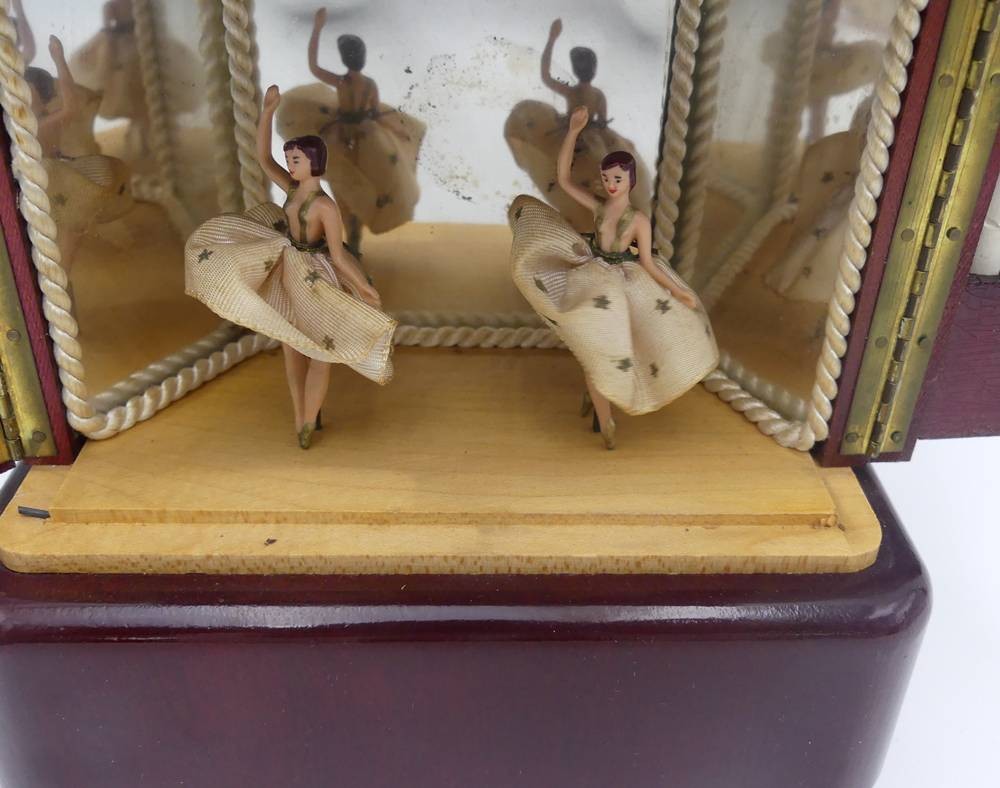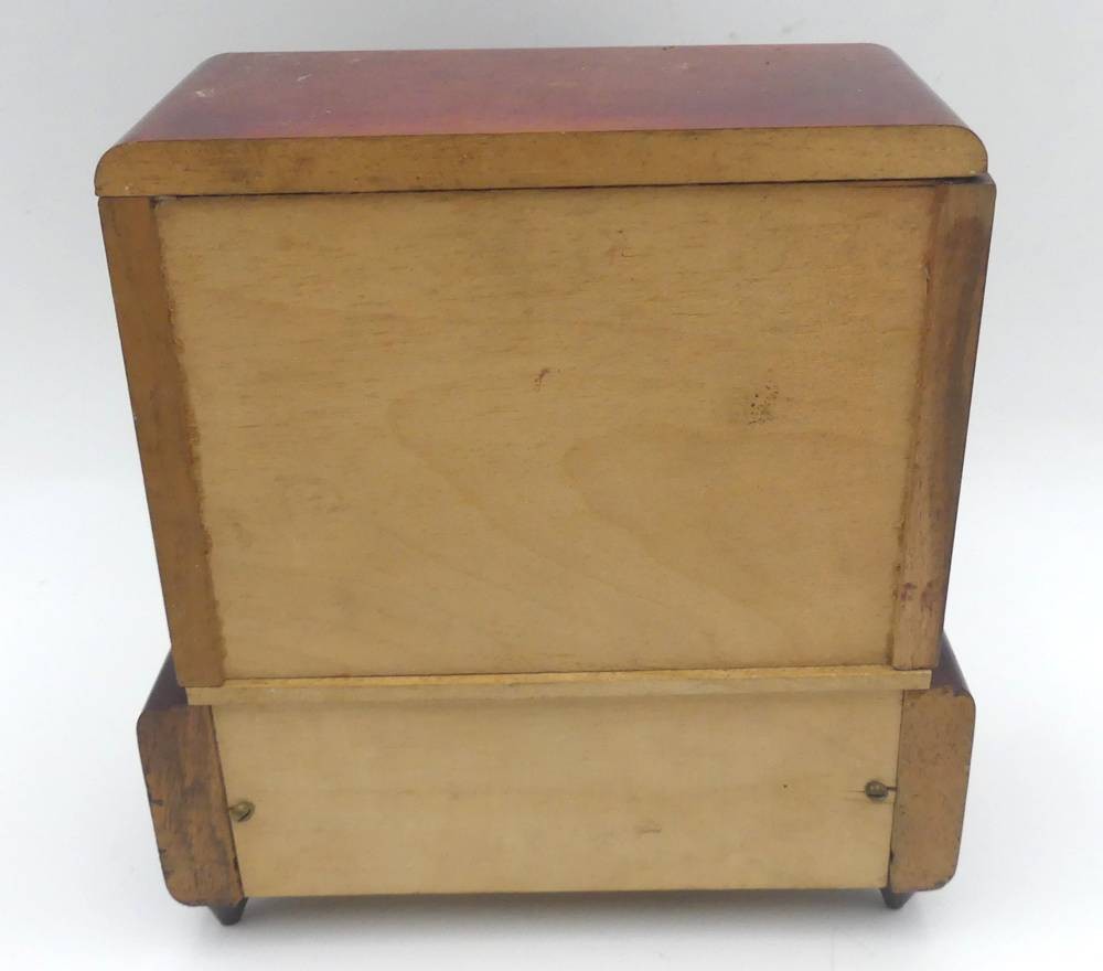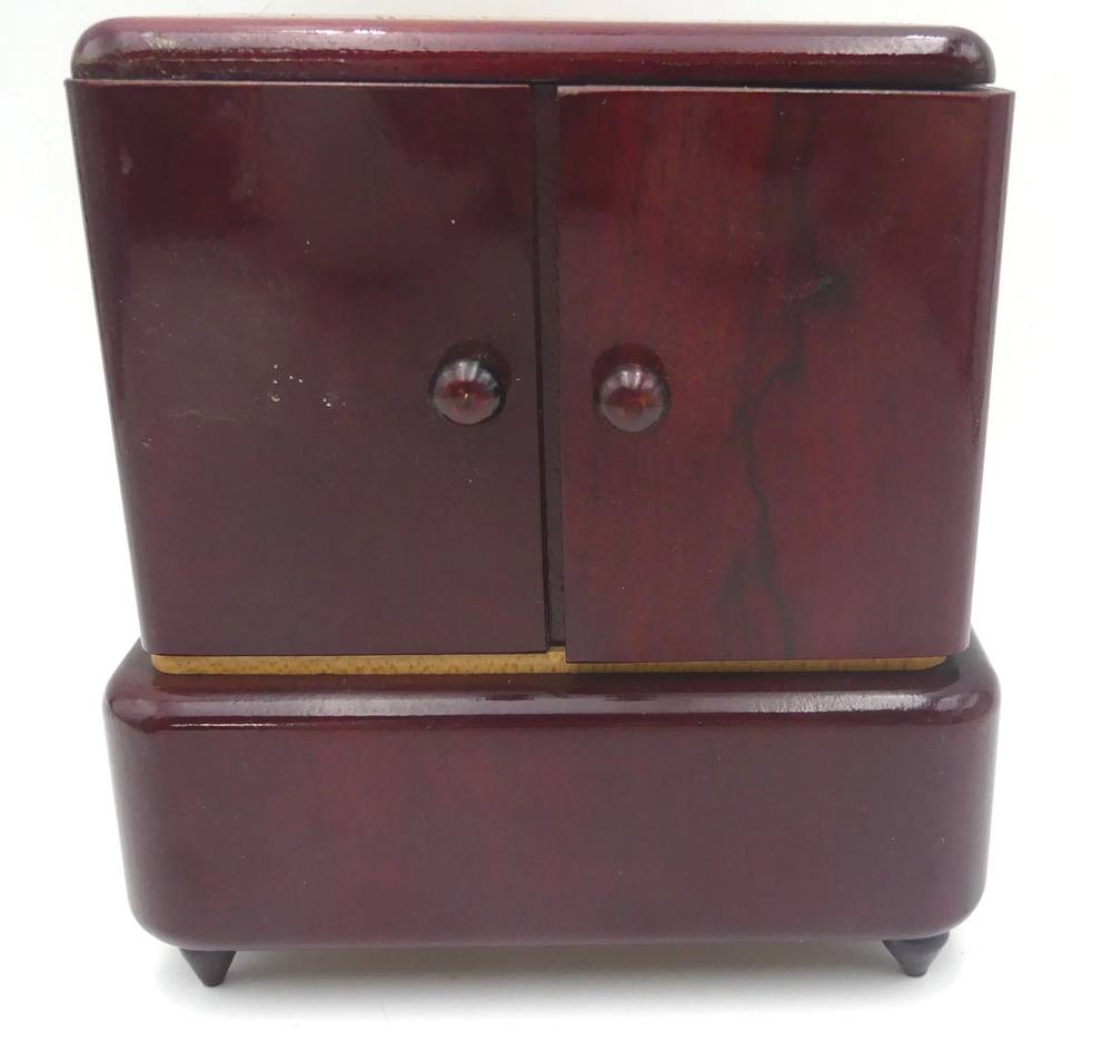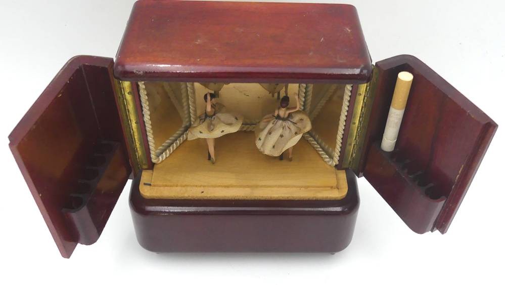 Spieluhr in Form eines 30/50-er J. Schrankes als Zigarettenhalter, mit 2 Tänzerinnen, Werk läuft, H-17 cm, 16x8 cm [1]
