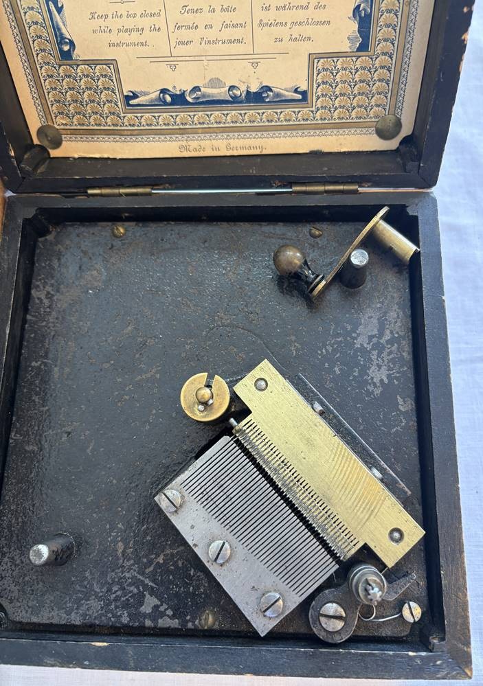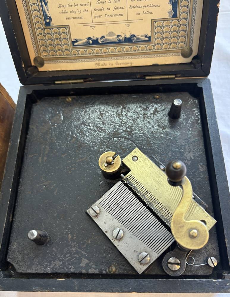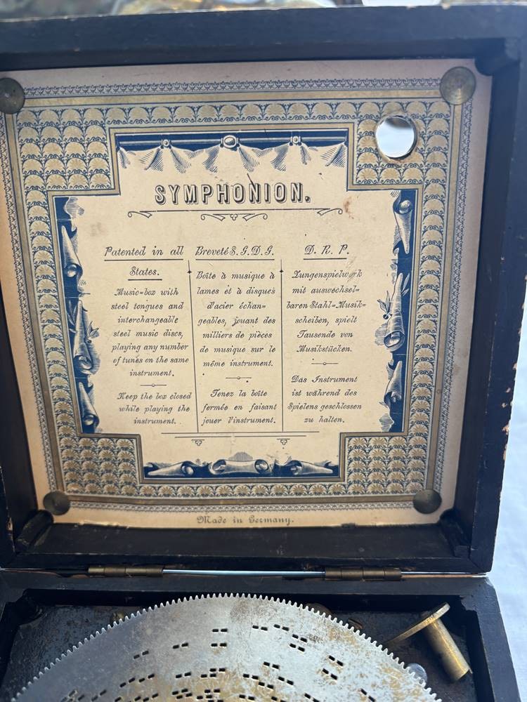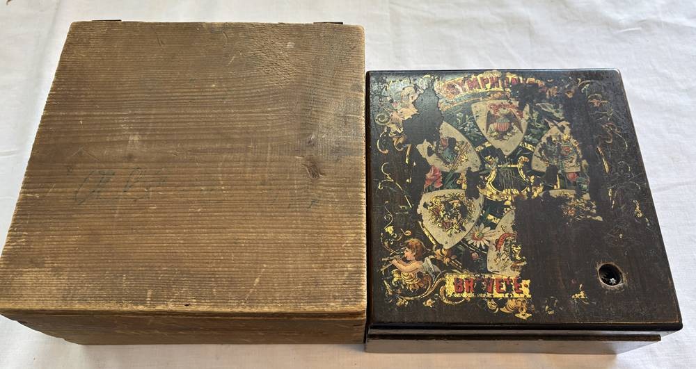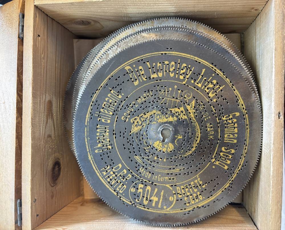 Spieluhr "Symphonion" in Holzkasten,ca. 16x16 cm anbei Holzkasten mit 29 Blechplatten, D-15 cm, Werk steht?? [1]