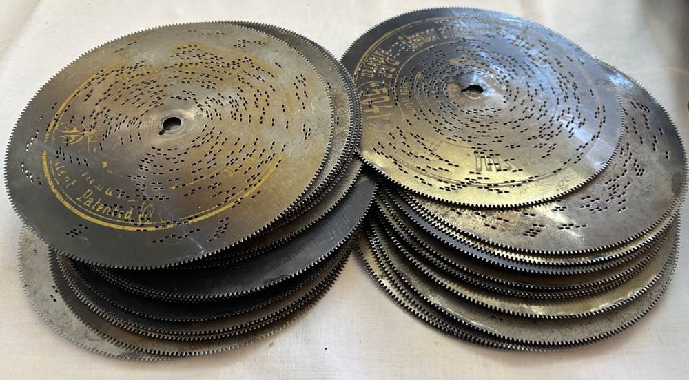 Spieluhr "Symphonion" in Holzkasten,ca. 16x16 cm anbei Holzkasten mit 29 Blechplatten, D-15 cm, Werk steht??