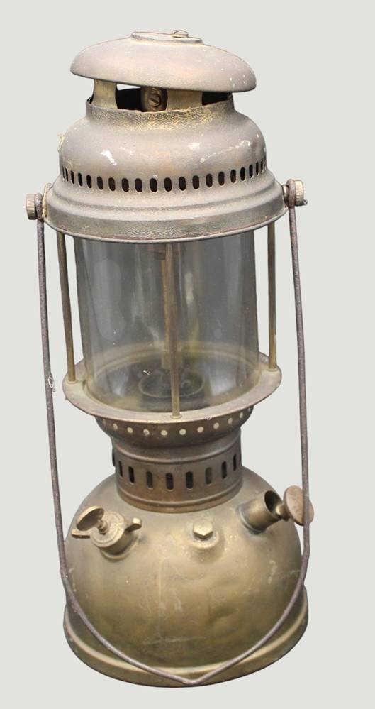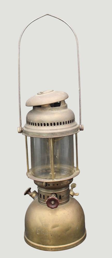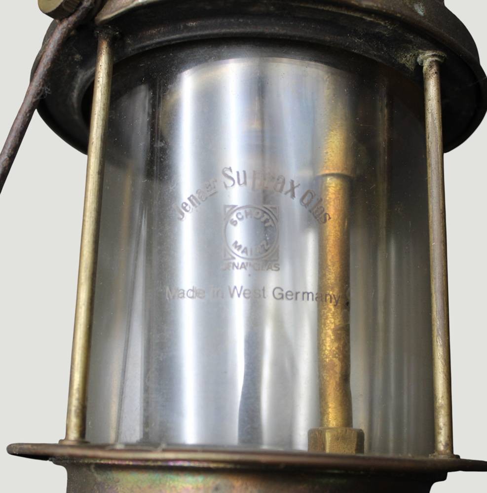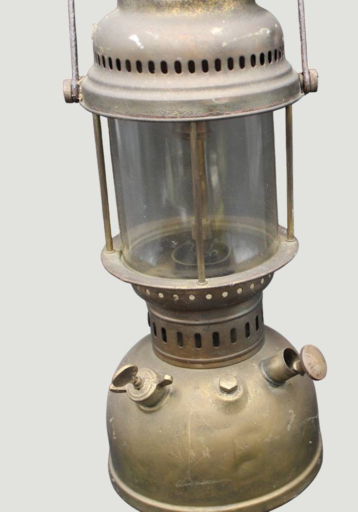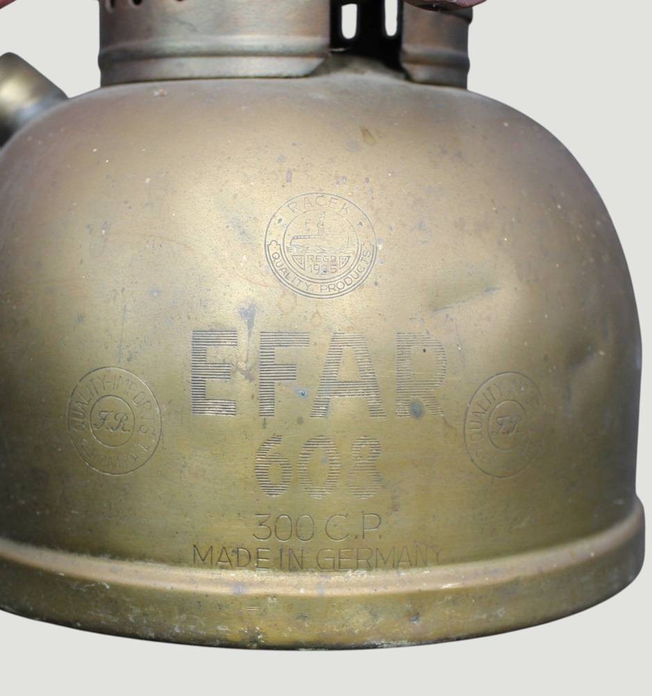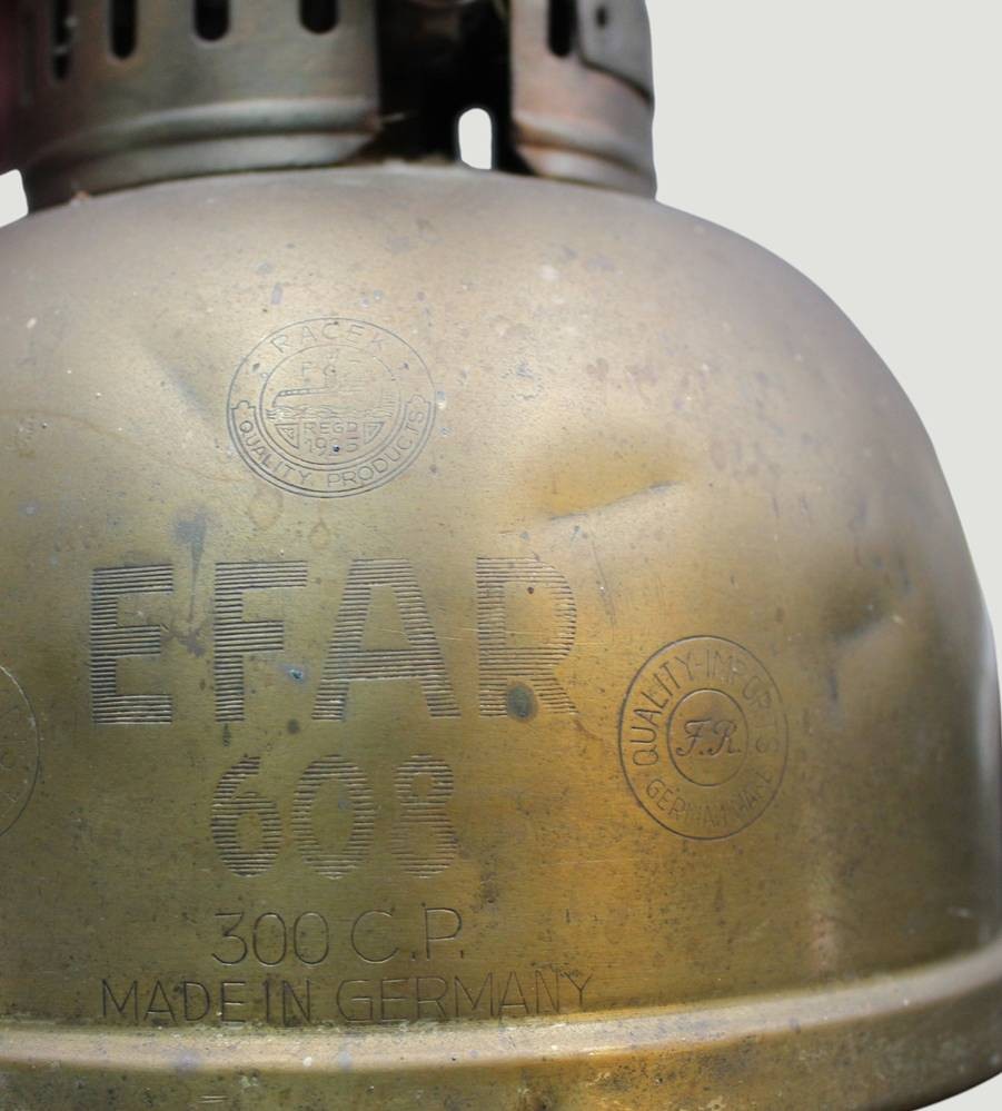 vintage Petroleumlampe "EFAR 608"in Petromax-Form, mit Jenaer Glasschirm, Deckel lose, Messing, H-ca. 40 cm [1]