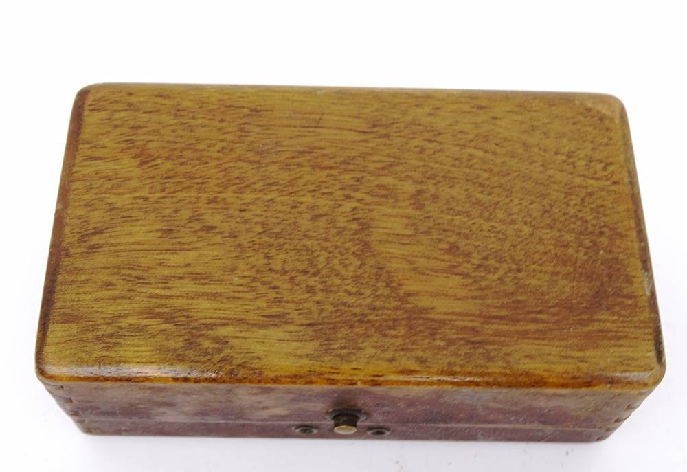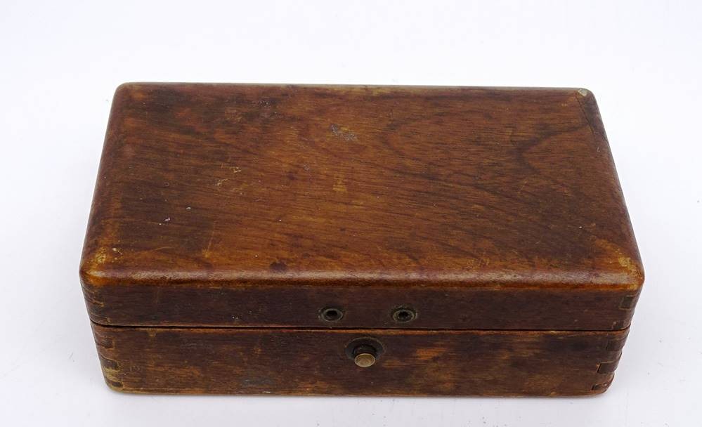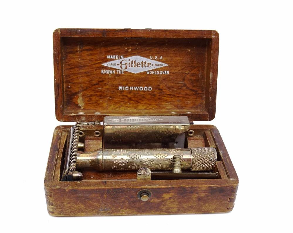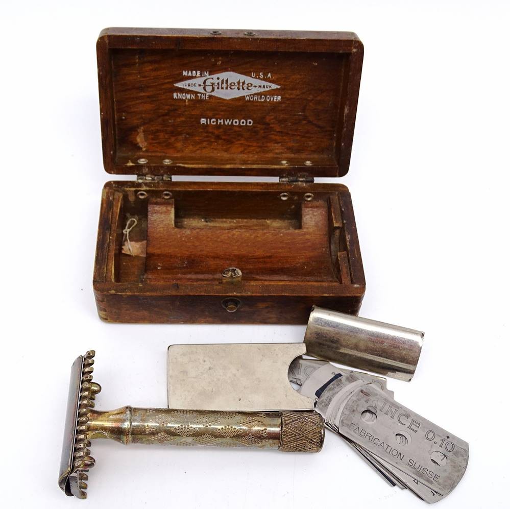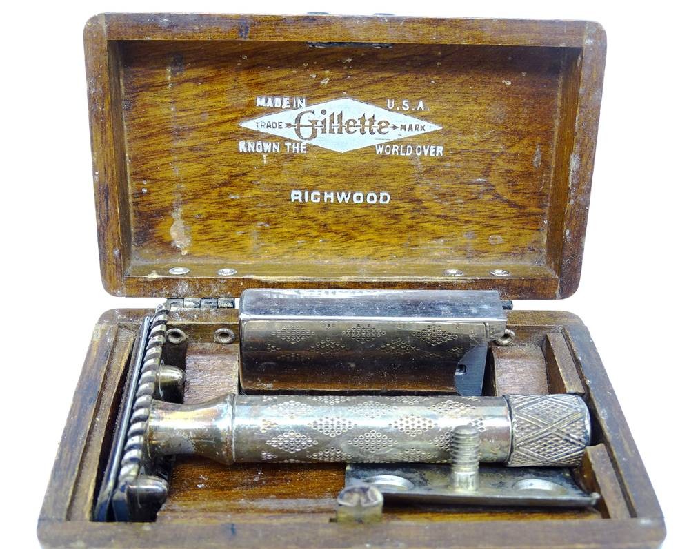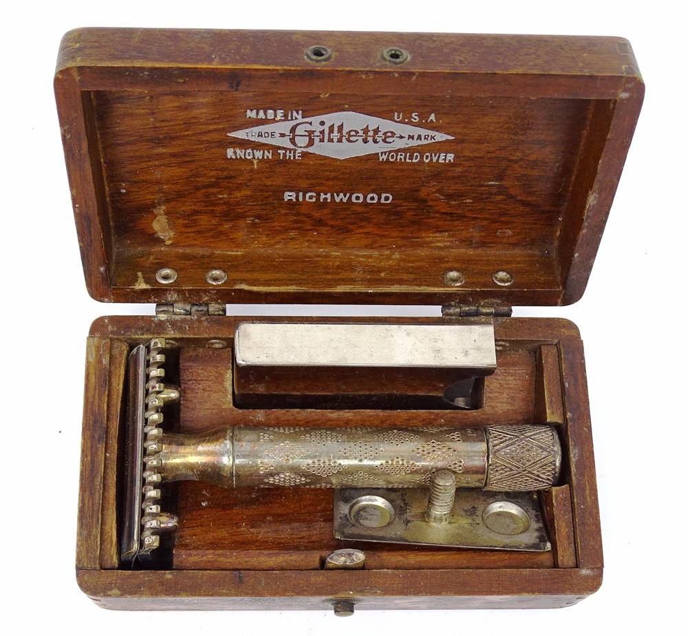 Vintage Rasierer der Marke " Gillette " Made in U.S.A. mit Zubehör in einer kleinen Holzschachtel Maße: 9,5 x 5,5 x 3,5 cm [1]