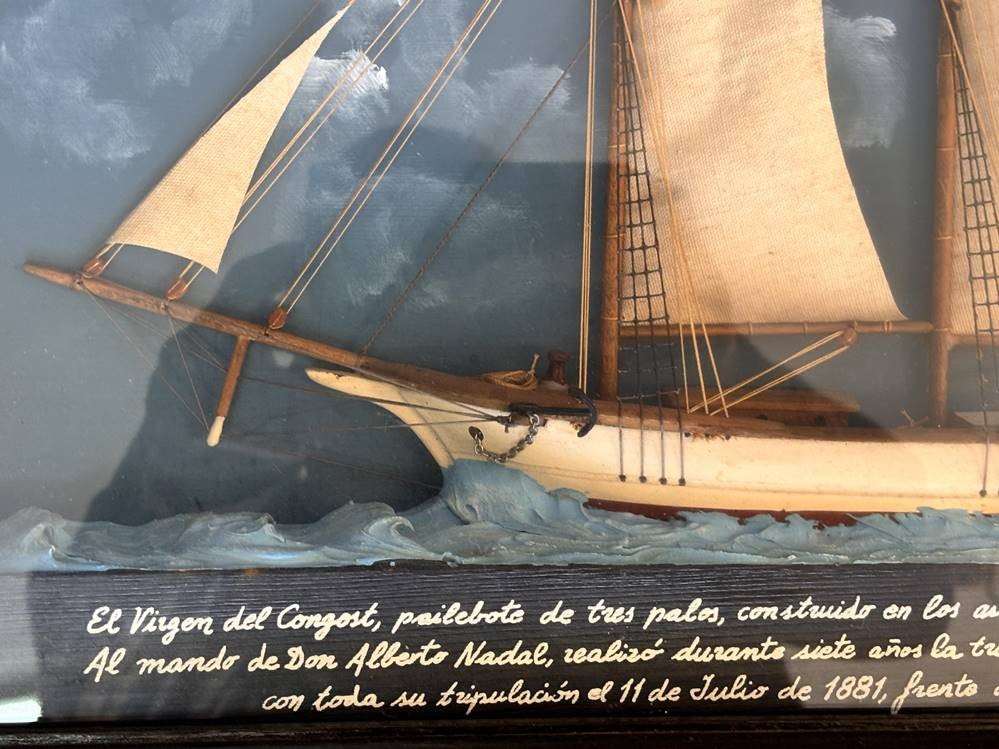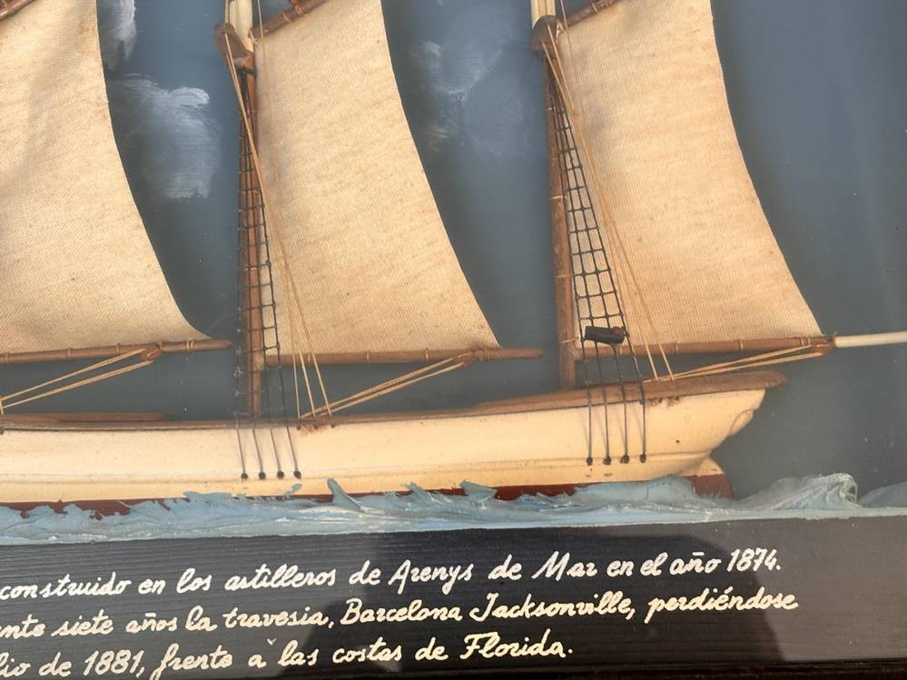 Wandvitrine mit Halbmodell eines Frachtseglers von 1874, spanisch beschriftet, 38x50 cm [1]