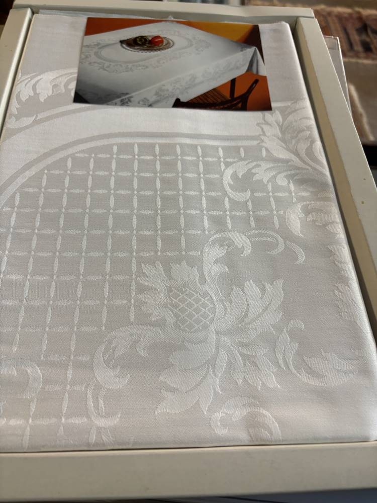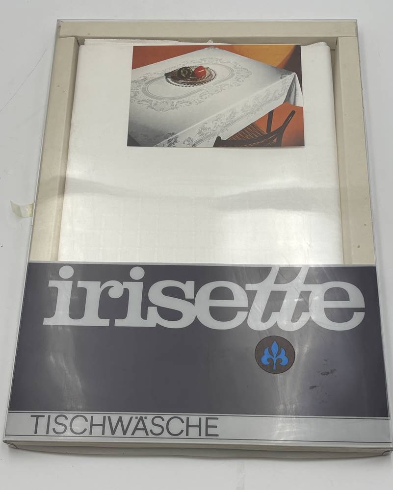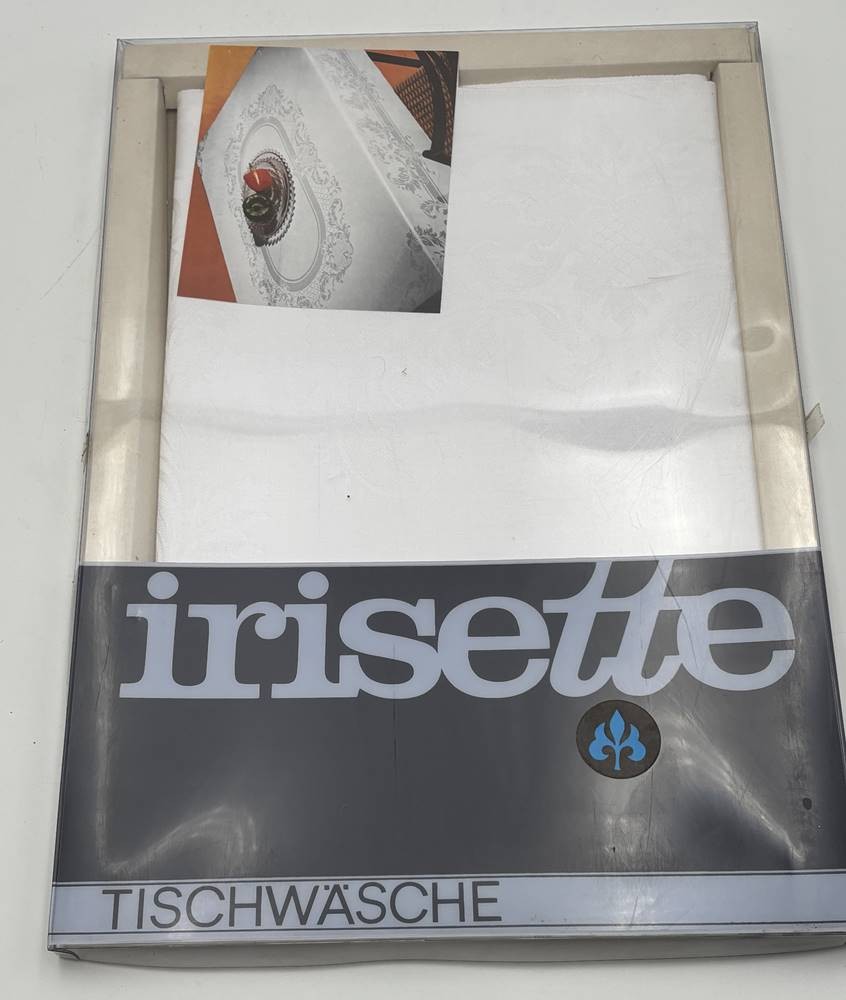2 orig. verpackte vintage Aussteuer Tischtücher "Irisette" Menu 9128 , 130x160 cm, wohl Leinendamast, 60/70-er Jahre [1]