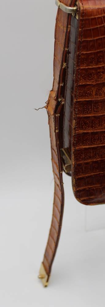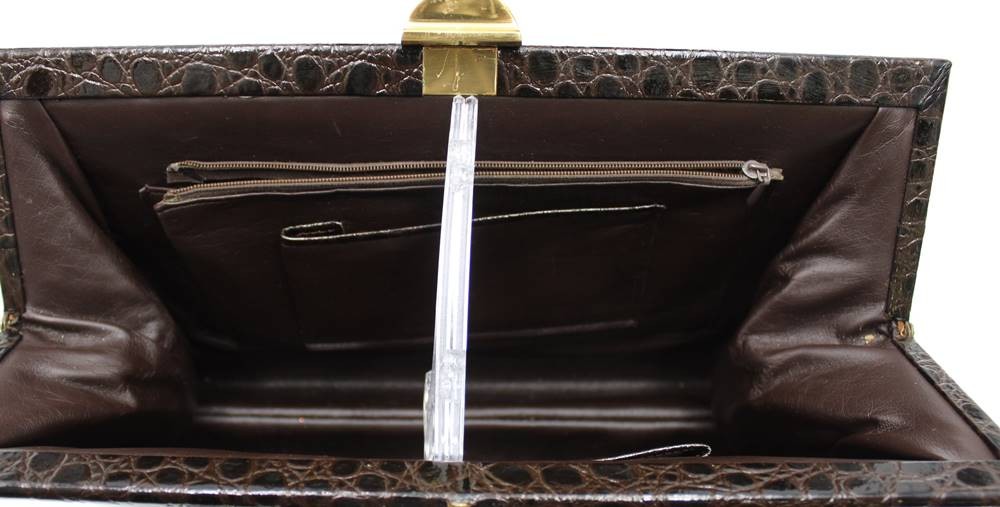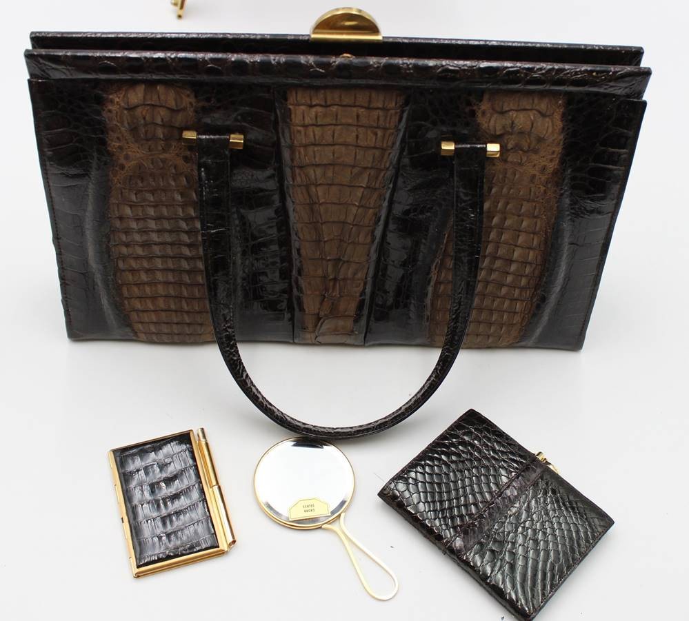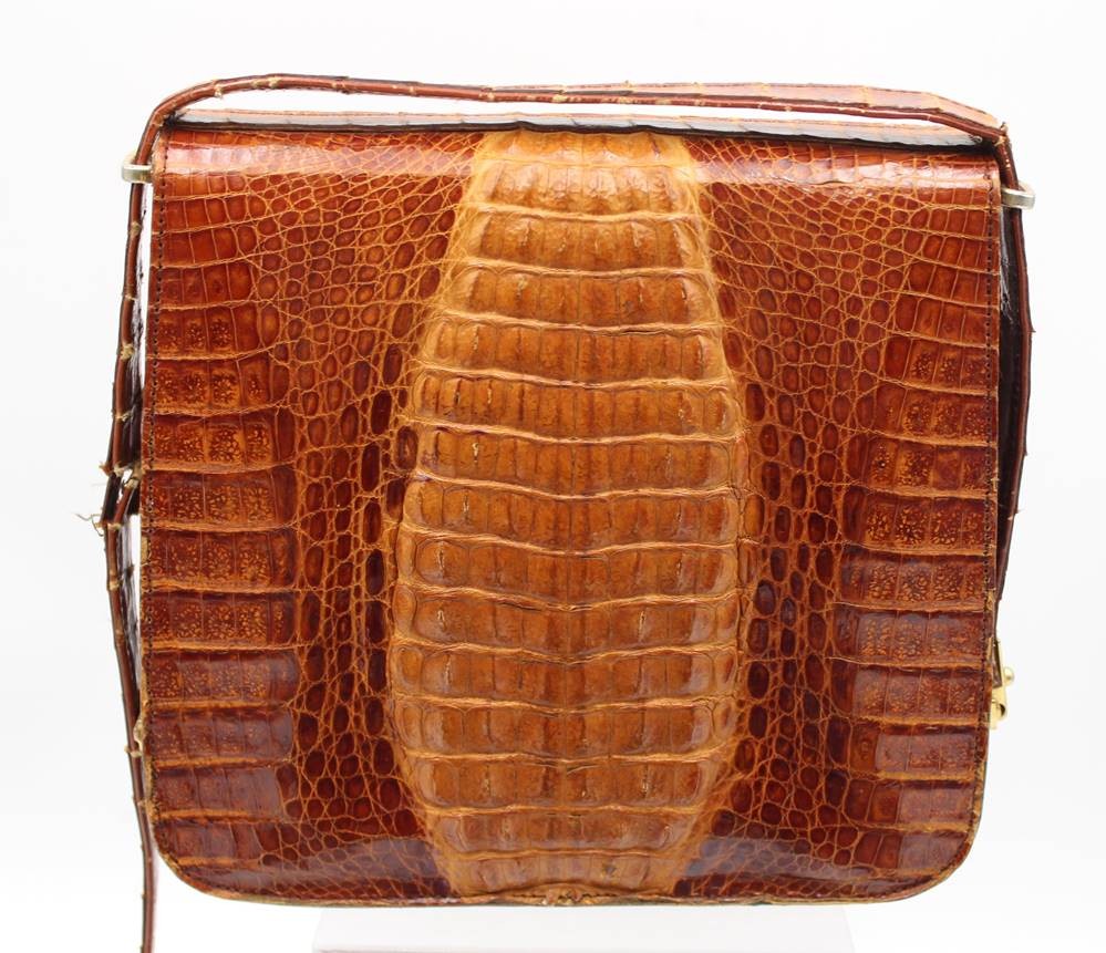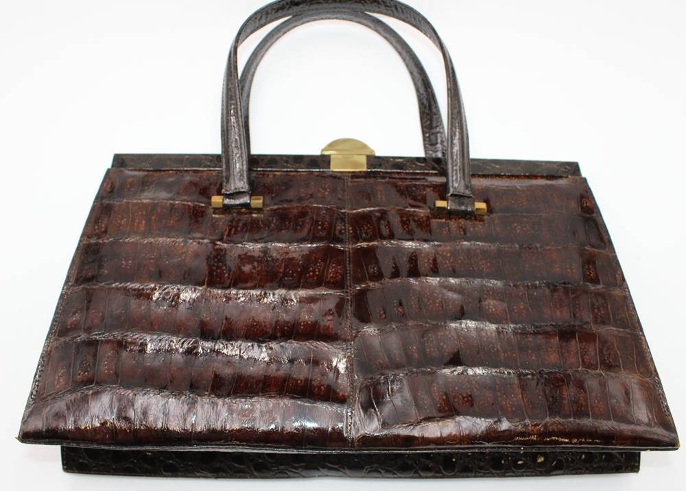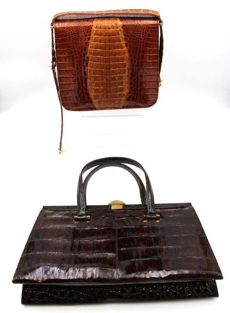 2x div. Kroko-Damenhandtaschen, älter, 1x Riemen gerissen, sonst leichte Gebrauchsspuren, ca. 22 x 23cm und 23,5 x 34cm. [1]