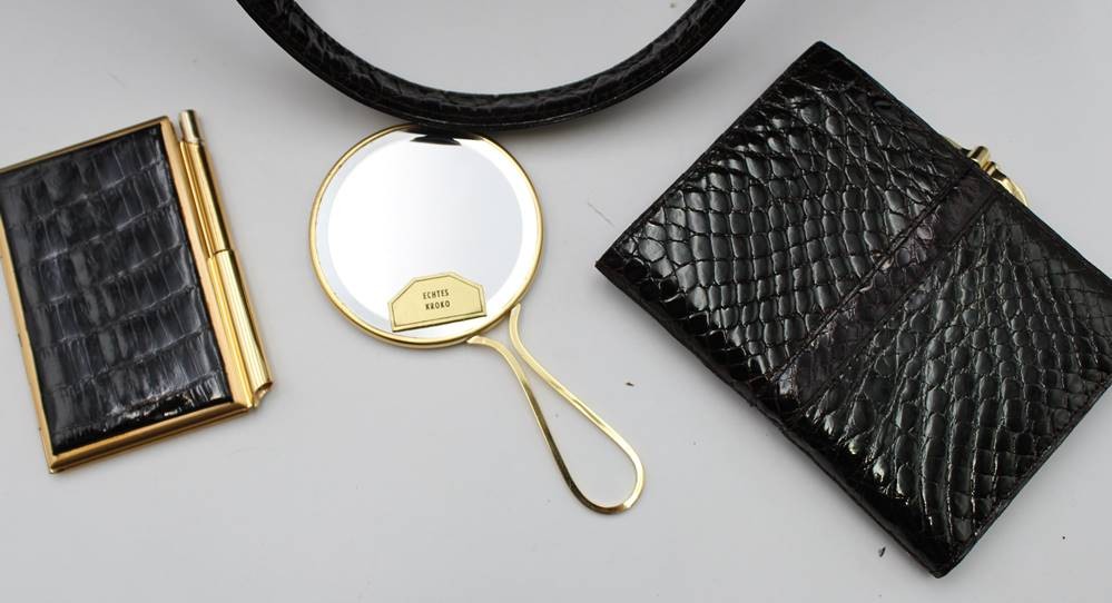 2x div. Kroko-Damenhandtaschen, älter, 1x Riemen gerissen, sonst leichte Gebrauchsspuren, ca. 22 x 23cm und 23,5 x 34cm.