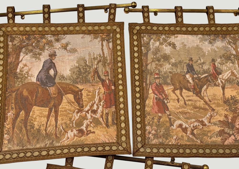 3x kl. Wandgobelins mit Parforce Jagdszenen, Messingstangen, ca. 31x31 cm [1]
