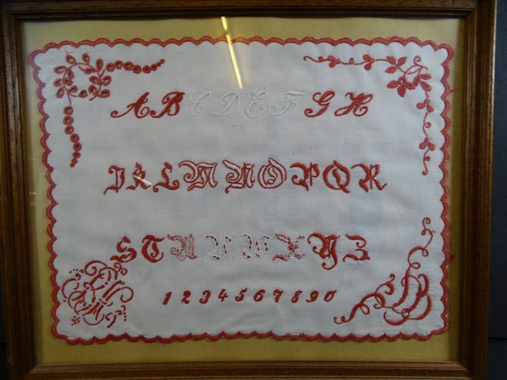 Stickmustertuch, gerahmt/Glas, RG 26x31 cm