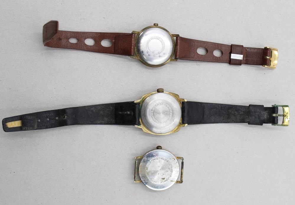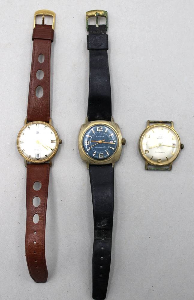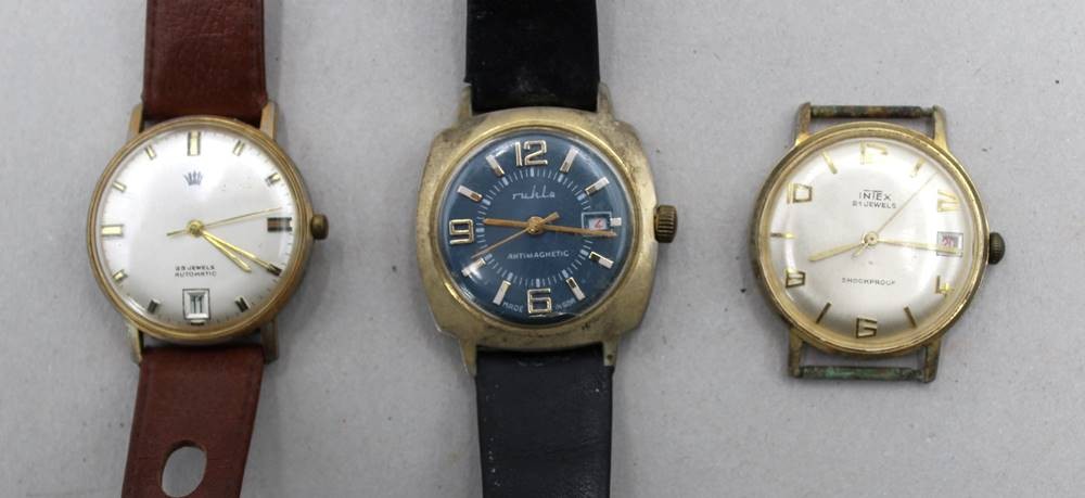 3x div. Vintage-Armbanduhren, RUHLA (steht), Intex (läuft 5 sec. an) und 1x Automatic (läuft), Tragespuren, ca. D-3,5cm