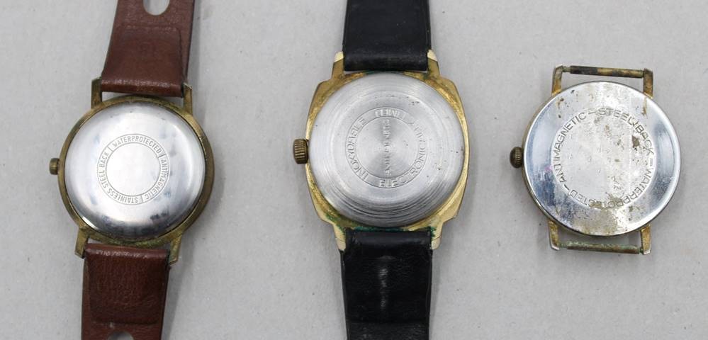 3x div. Vintage-Armbanduhren, RUHLA (steht), Intex (läuft 5 sec. an) und 1x Automatic (läuft), Tragespuren, ca. D-3,5cm [1]