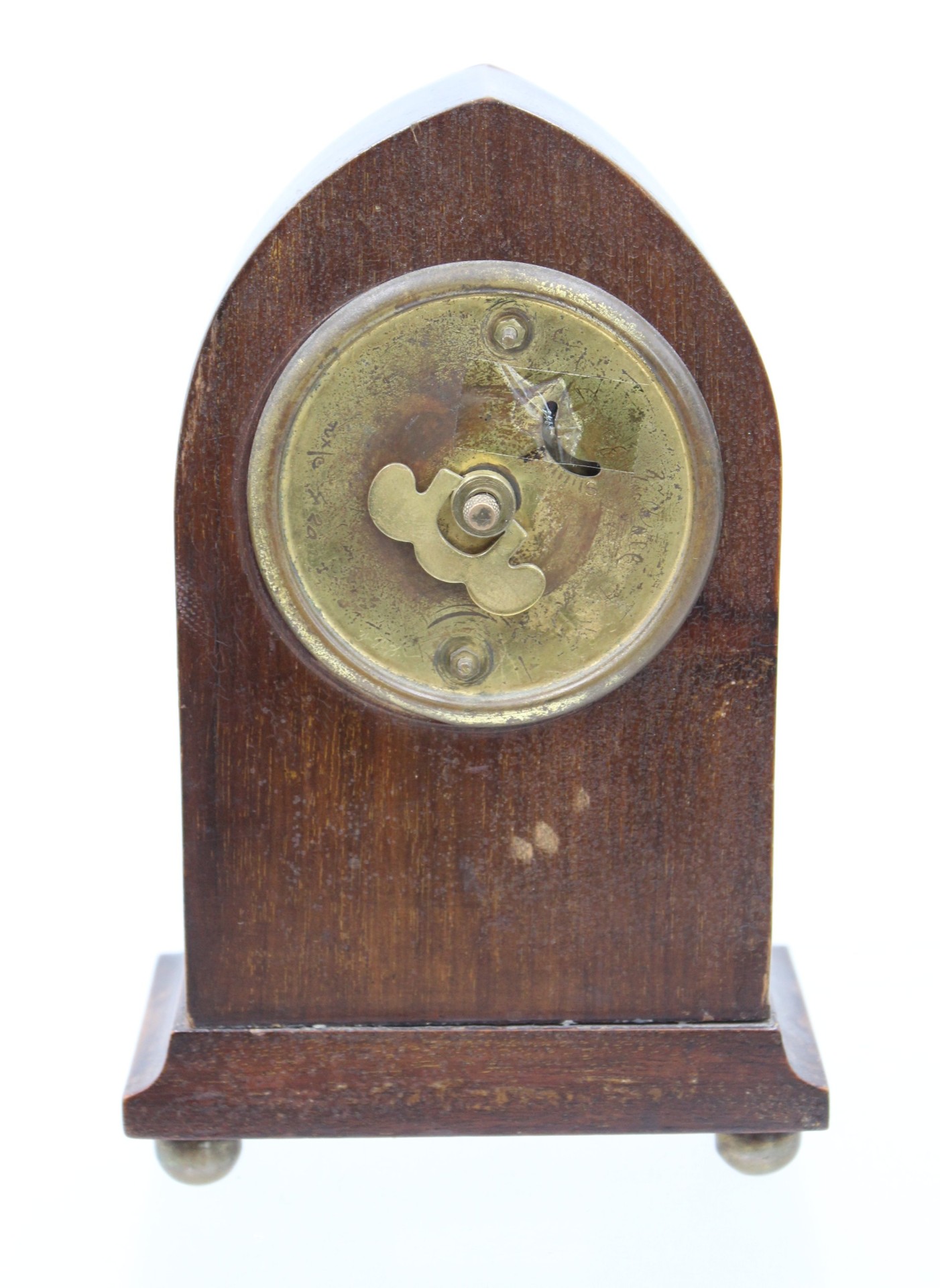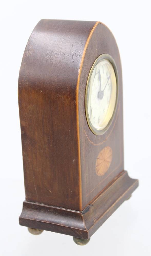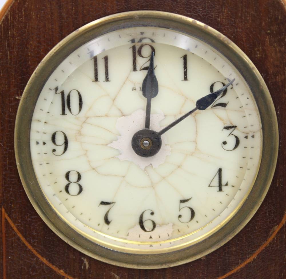 antike Edwardianische Kaminuhr aus Mahagoni mit Intarsien, Ziffernblatt gerissen, Werk überzogen, ca. H-19,5cm B-12,5cm T-7cm [1]