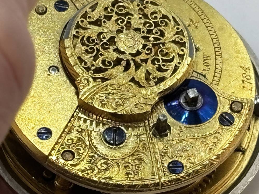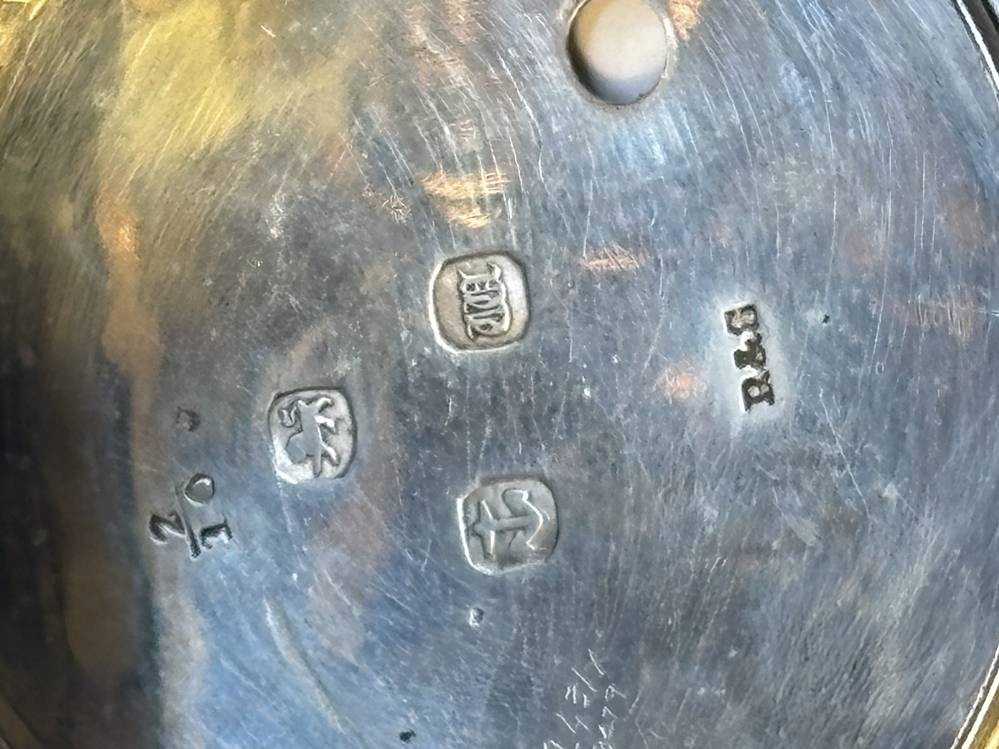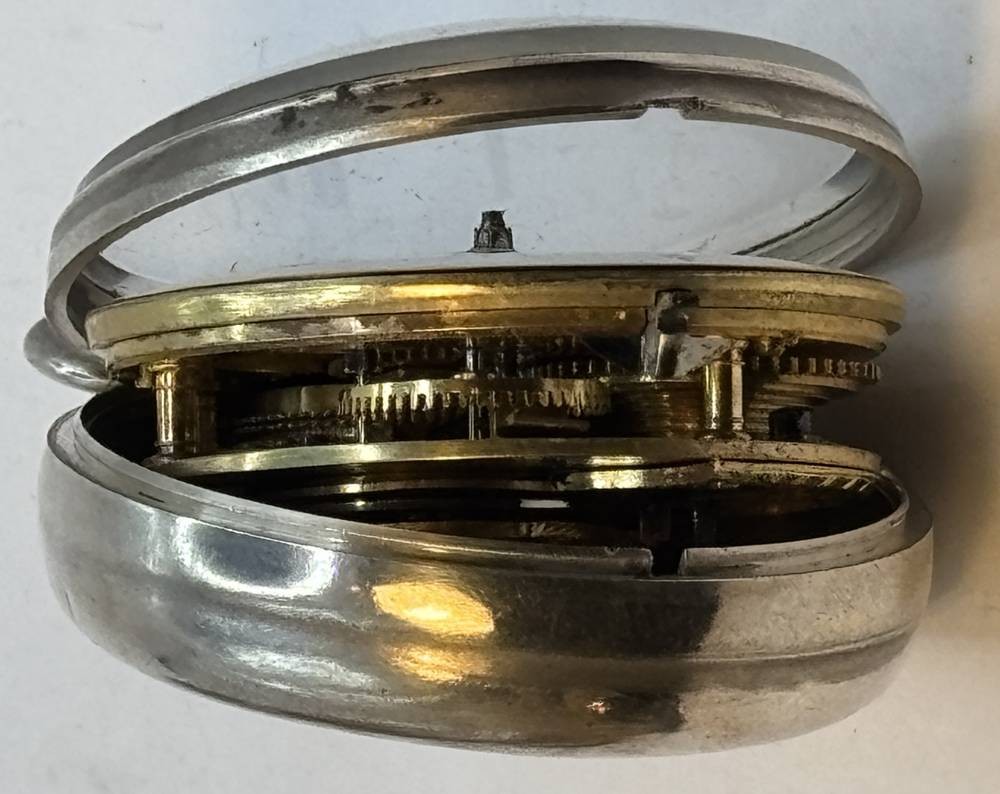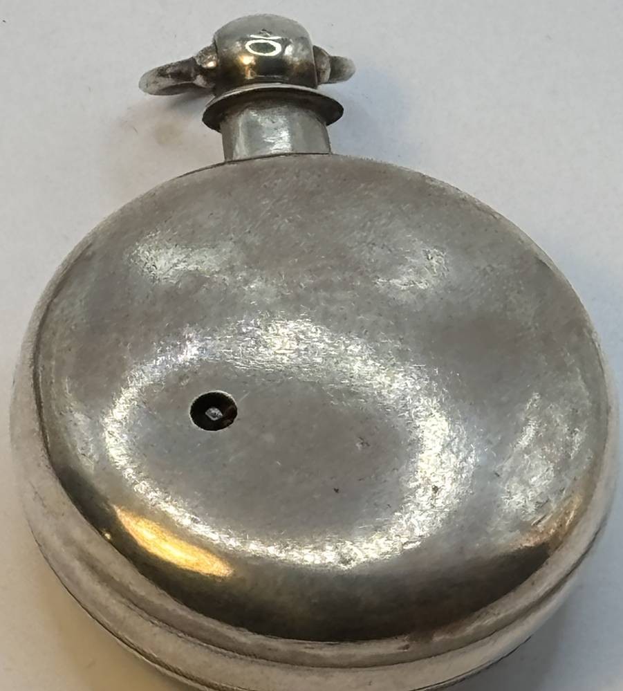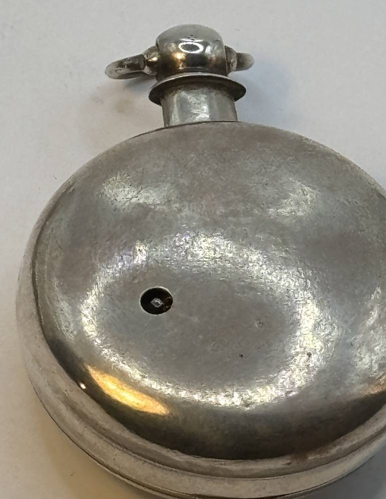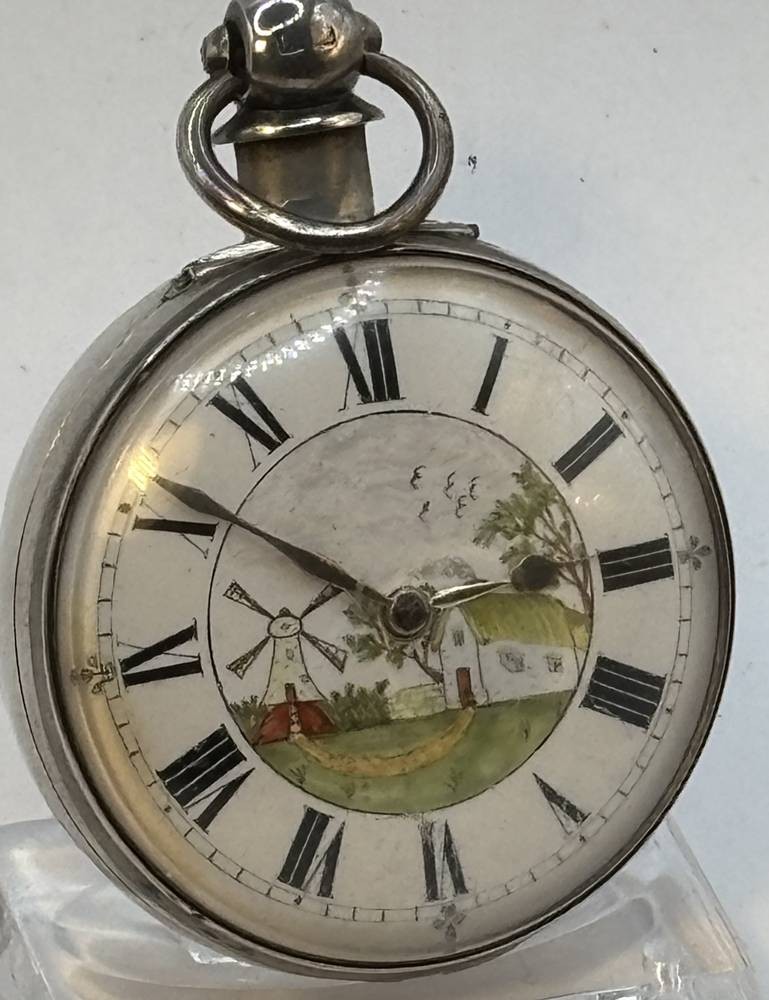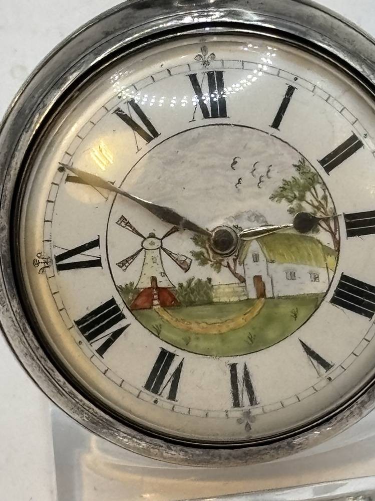 antike Spindeluhr in Silbergehäuse,Emaille-Zifferblatt mit Landschaft mit Mühle, schöner Kloben, sehr guter Zustand, Werk läuft, in Silber Schutzhülle, Birmingham 1845, D-5,5 cm [1]