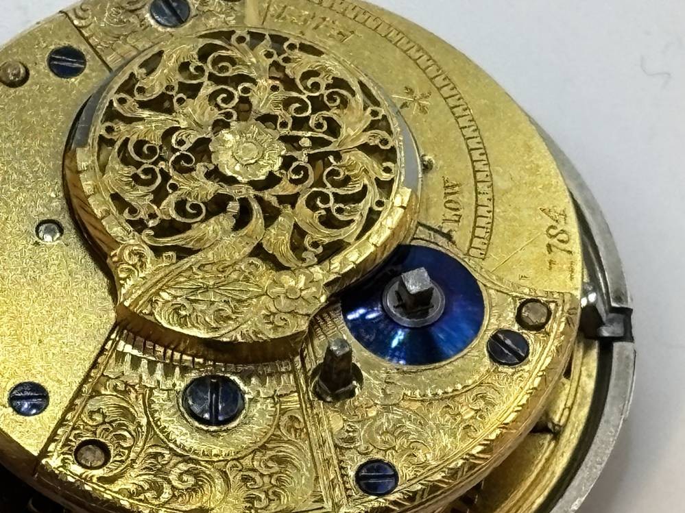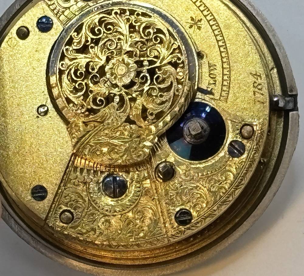 antike Spindeluhr in Silbergehäuse,Emaille-Zifferblatt mit Landschaft mit Mühle, schöner Kloben, sehr guter Zustand, Werk läuft, in Silber Schutzhülle, Birmingham 1845, D-5,5 cm