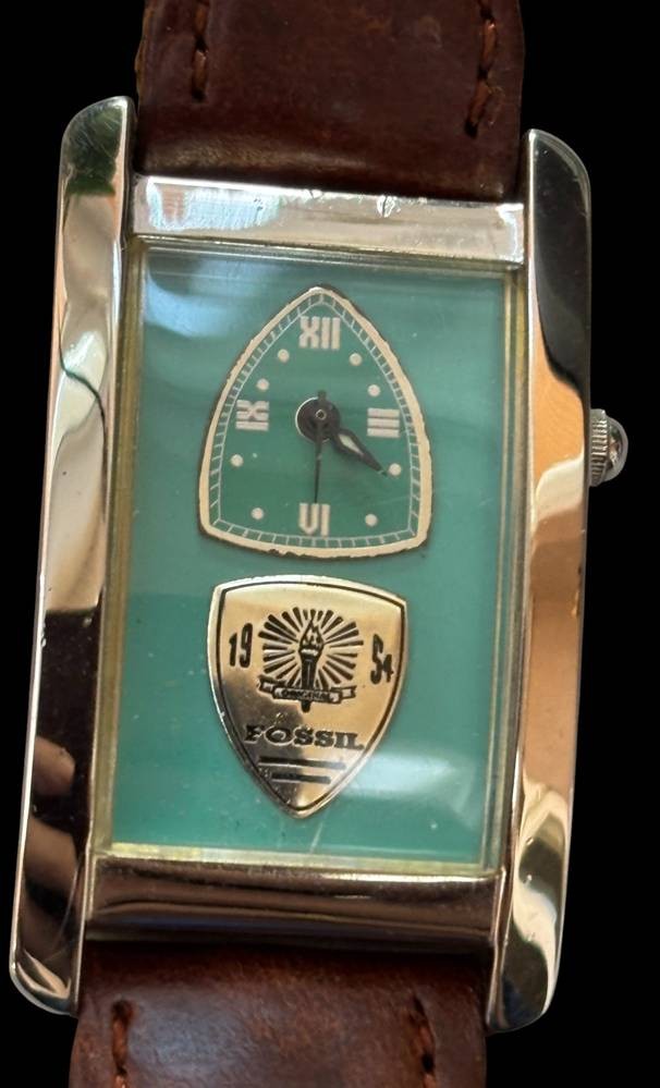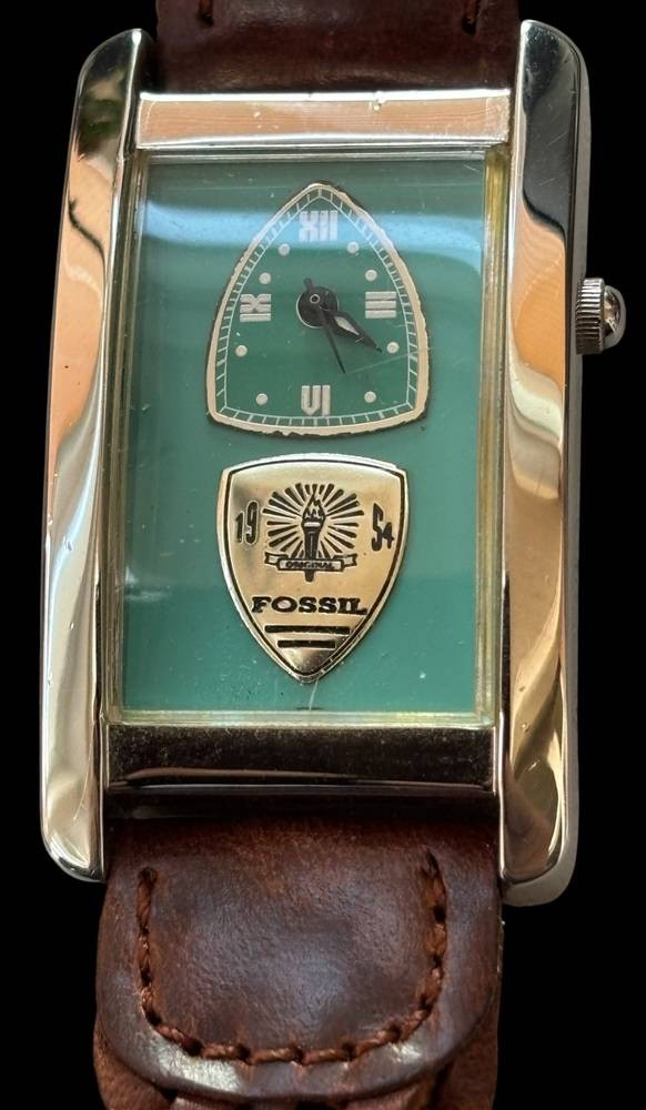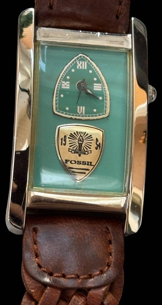 Armbanduhr Fossil in Stahl AG-5611, Unisex, Quartzwerk läuft, braunes geflochtenes Lederband, guter Zustand [1]