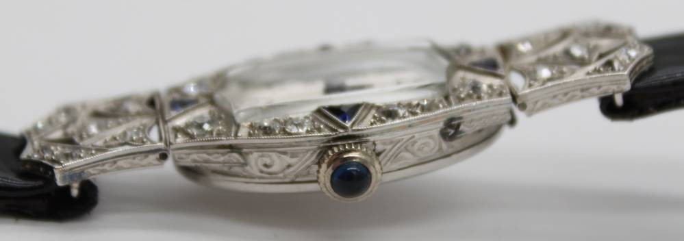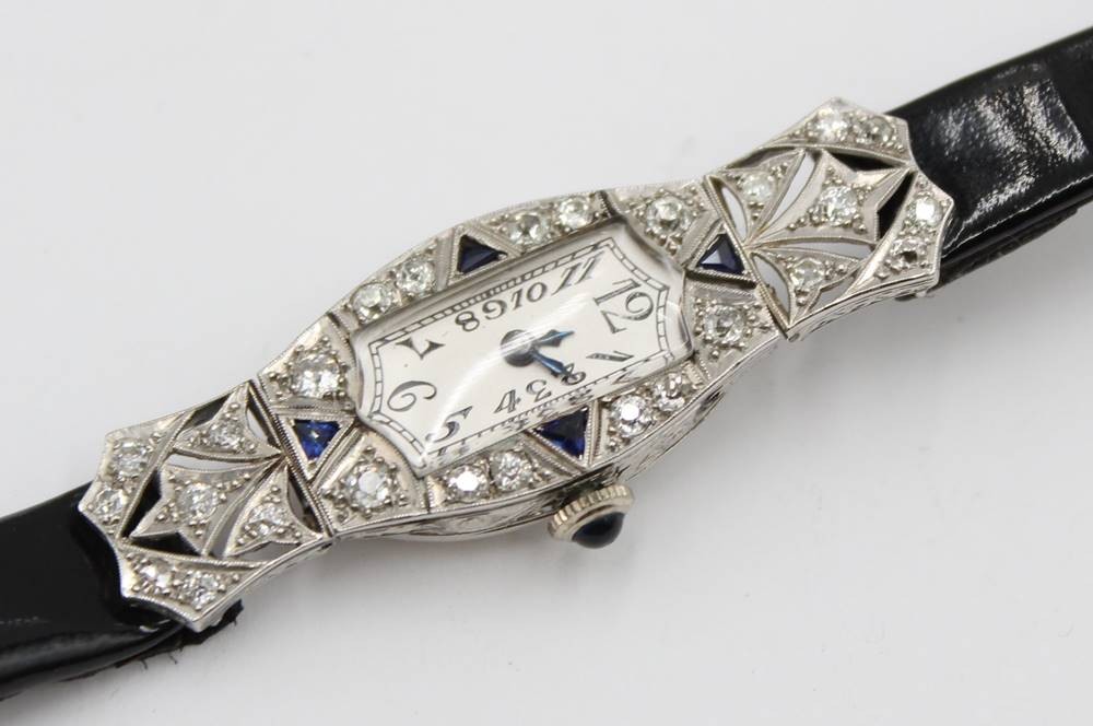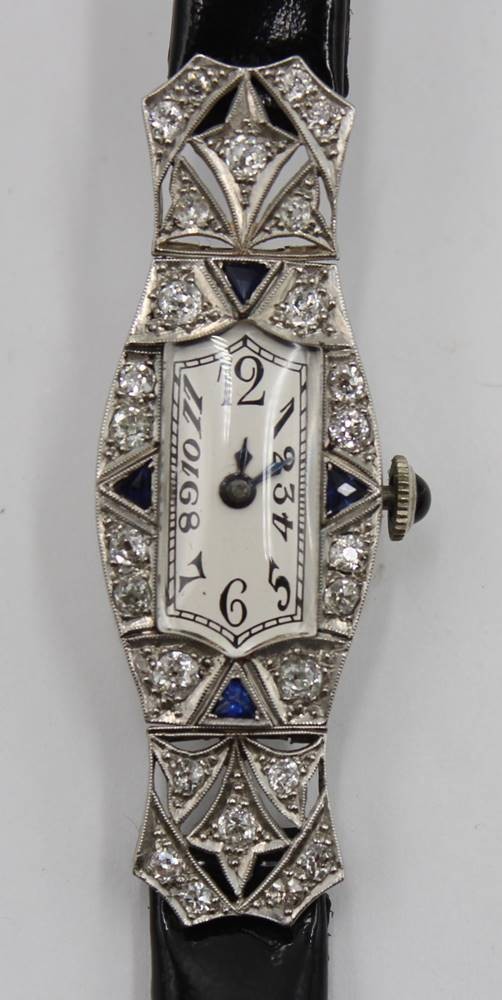 Art-déco-Damenuhr aus Platin mit Diamanten und Saphiren, Werk steht, komplett 17,1gr., ca. 5 x 1,8cm [1]