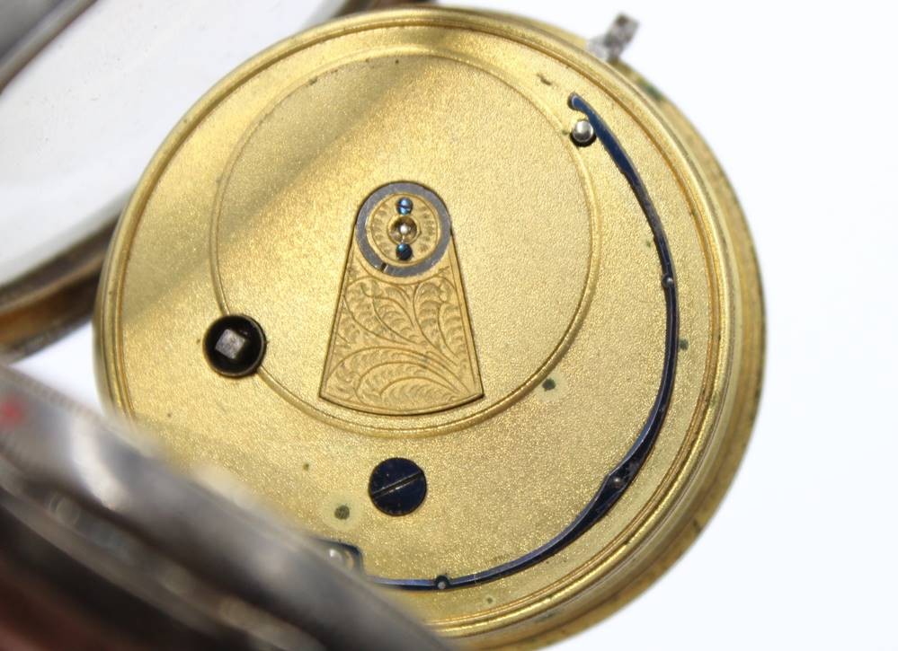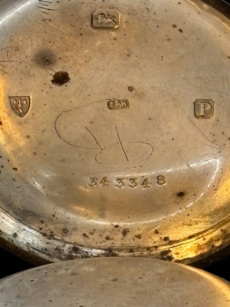 dicke Herrentaschenuhr in Silbergehäuse, Chester 1765, Glas mit Riss, ansonsten guter Zustand, Werk steht, verso Ziermonogramm, 134 gr., D-ca. 5 cm [1]