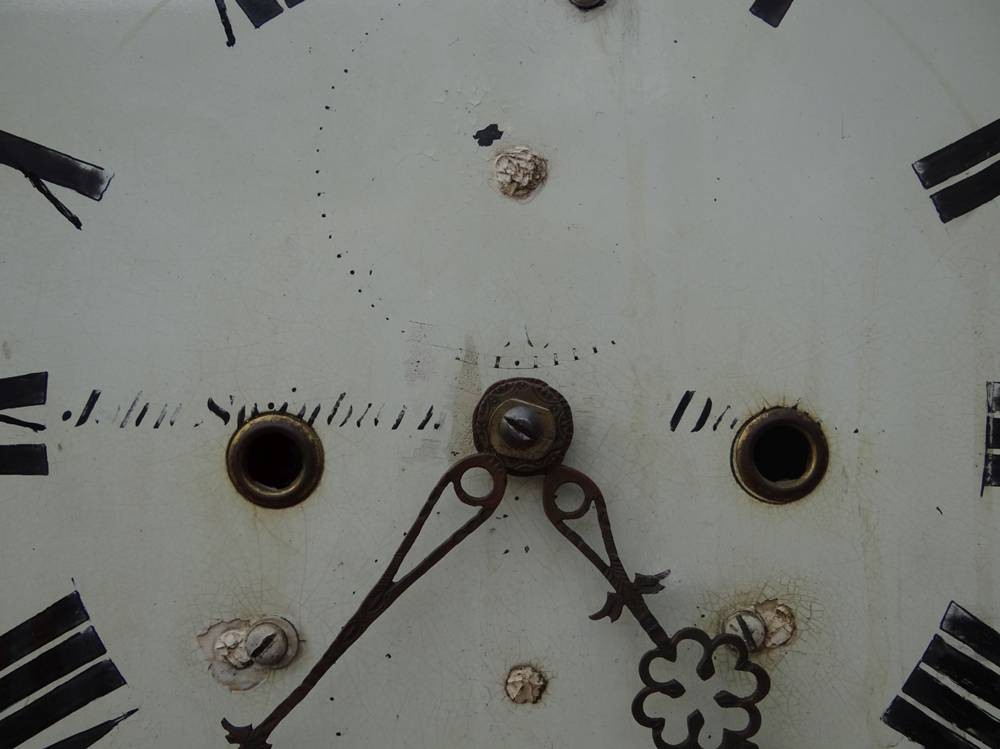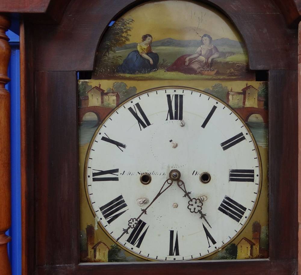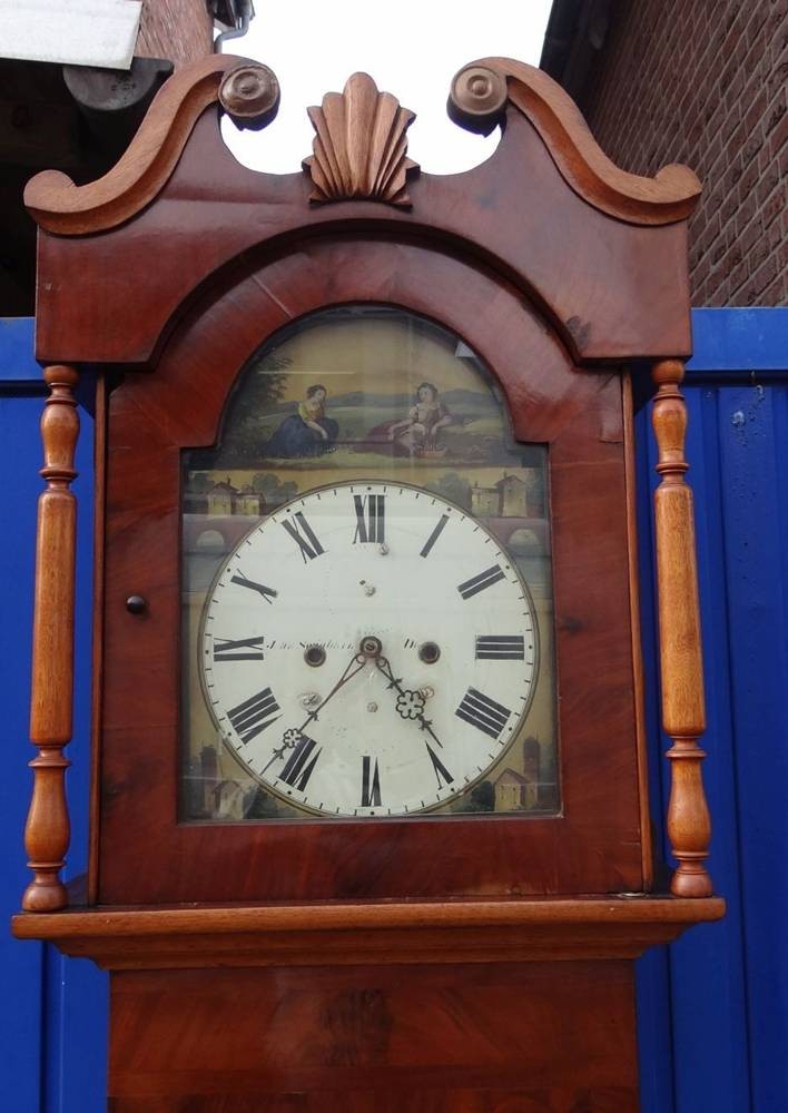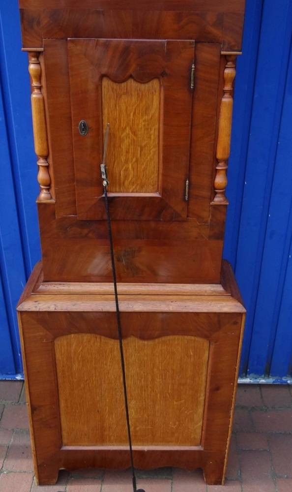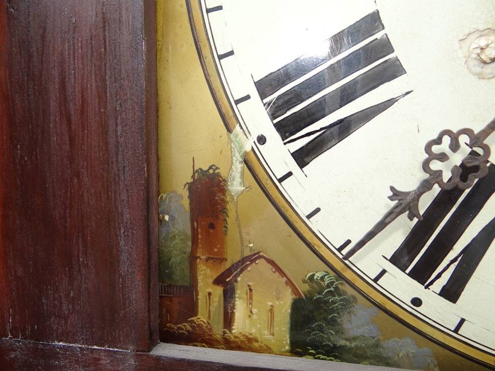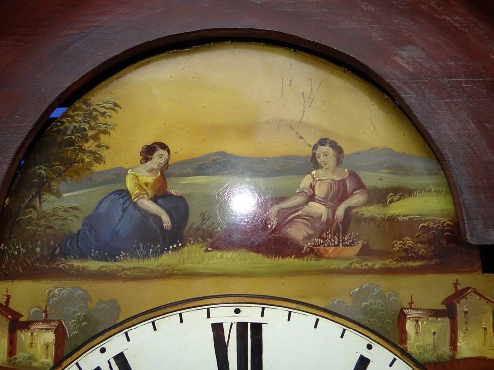 englische Standuhr um 1820 in Holzgehäuse, Metall-Ziffernblatt bemalt, Altersspuren, Werk läuft, H-228 cm, B-59 cm, T-24 cm [1]