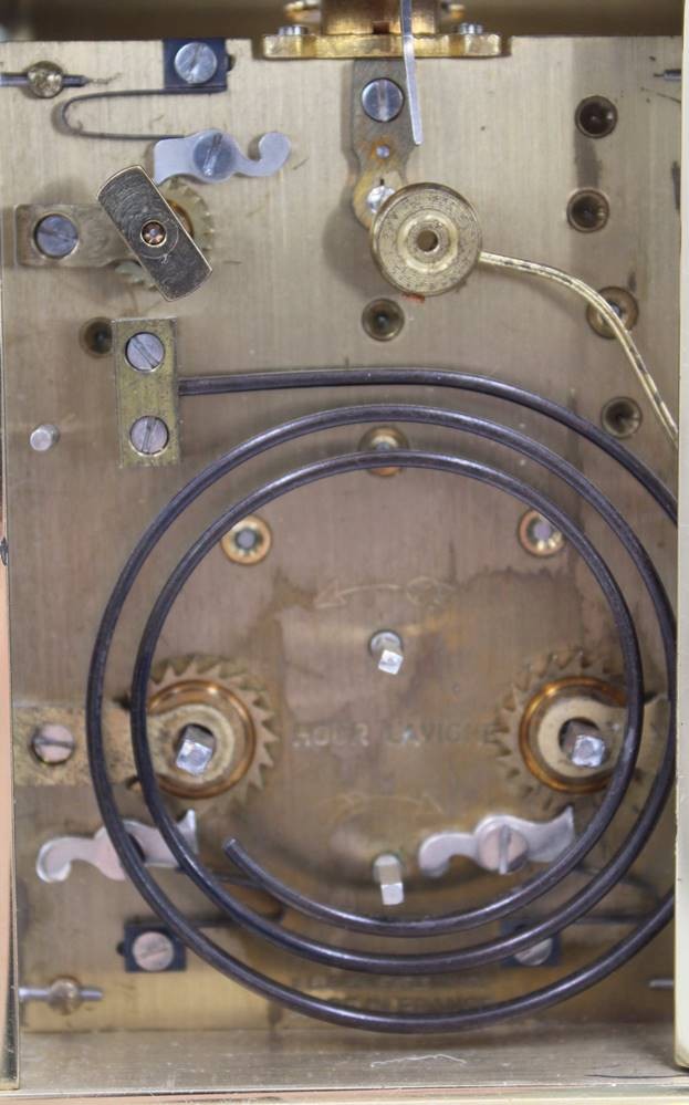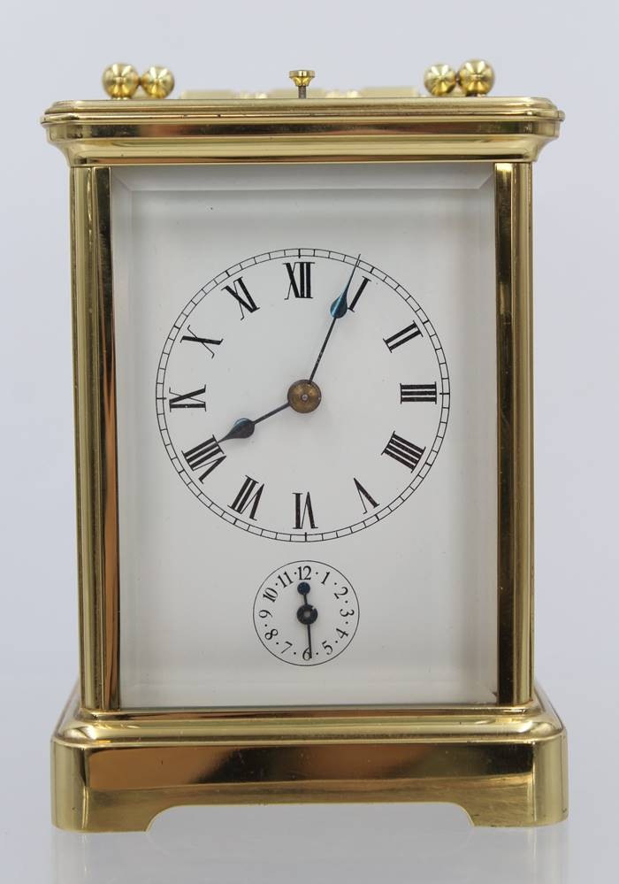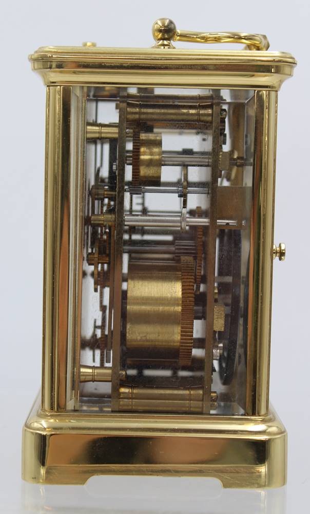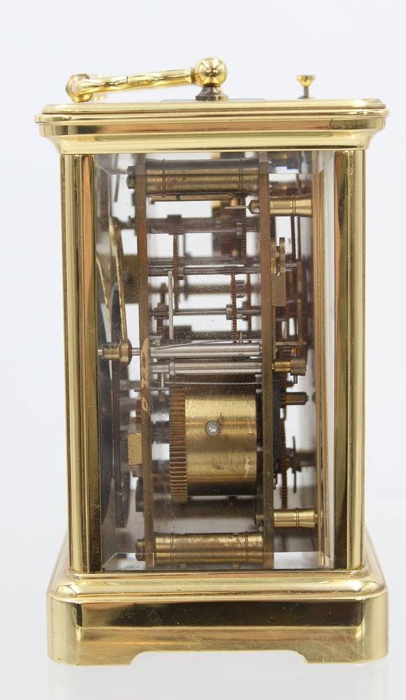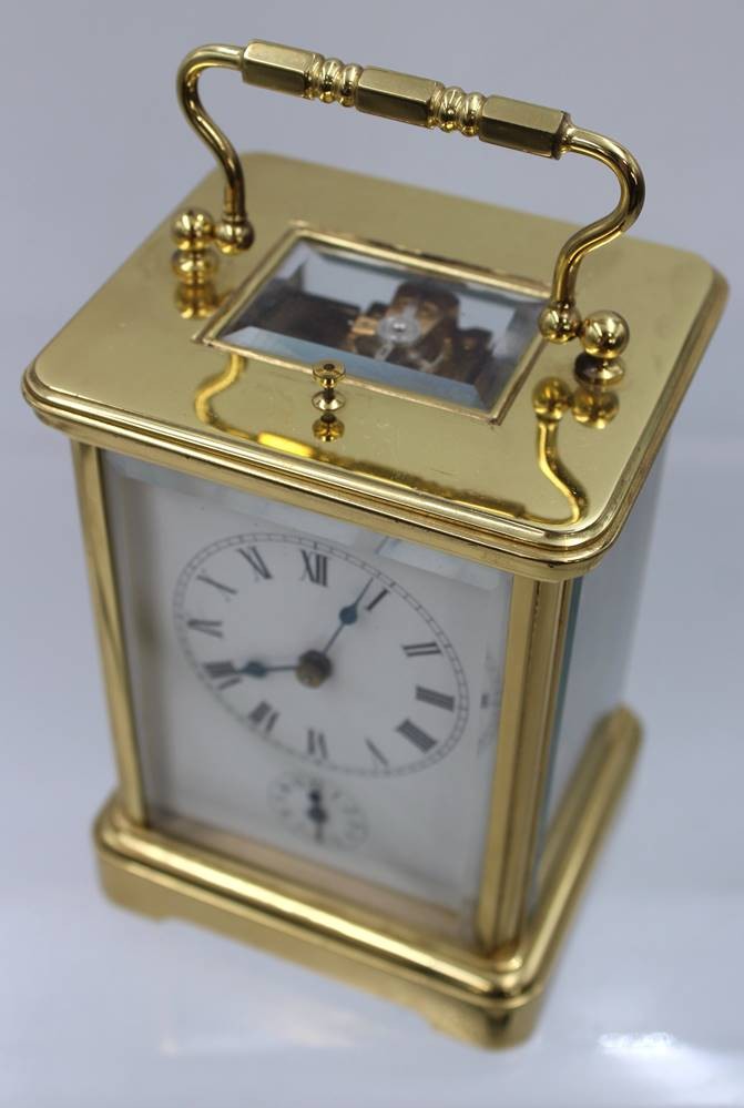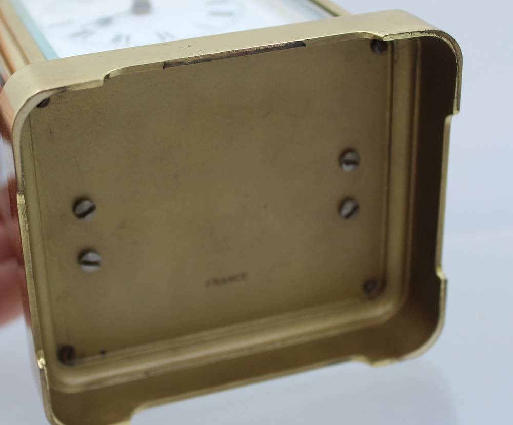 französische Reiseuhr, Messinggehäuse, optisch sehr guter Zustand, Werk steht, es scheint verharzt zu sein, ca. H-14,3cm B-9,8cm [1]