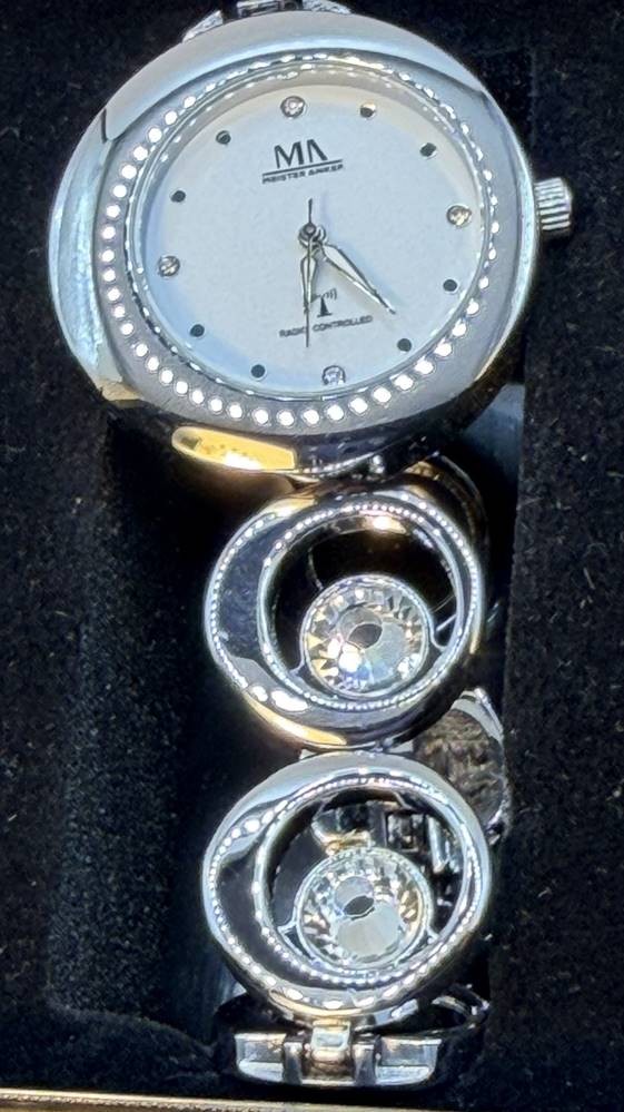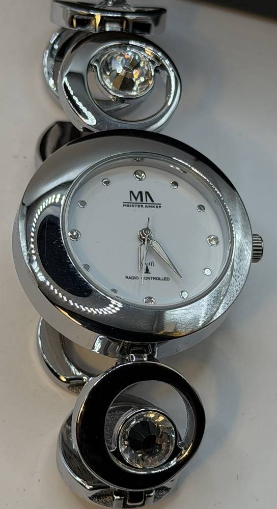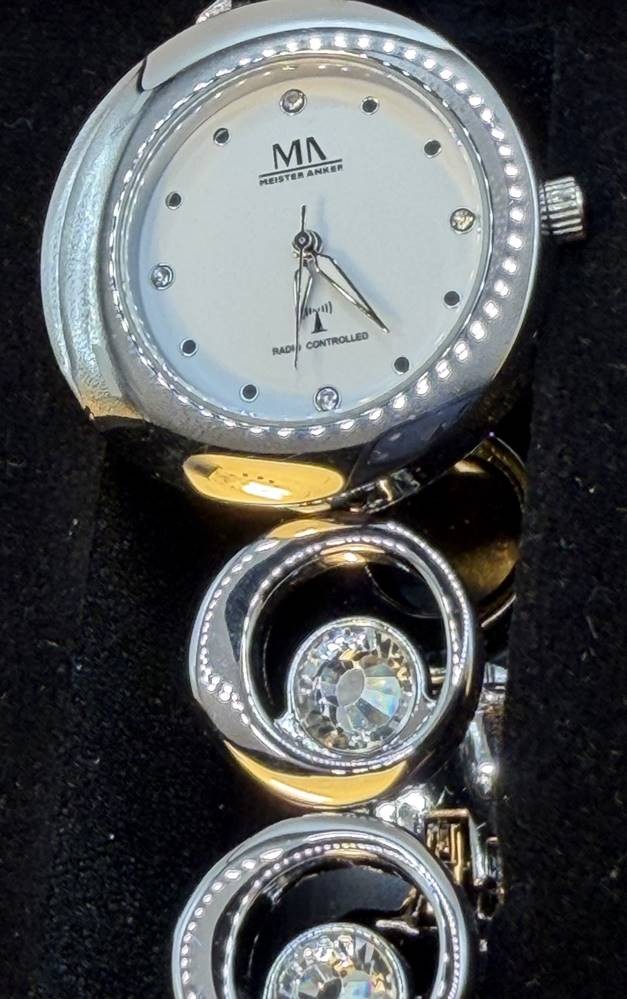 Funk Quarz Damen Lady Line, wohl ungetragen, Stahlband mit 4 grossen, klaren Steinen, Rückseite mit orig. Schutzfolie [1]