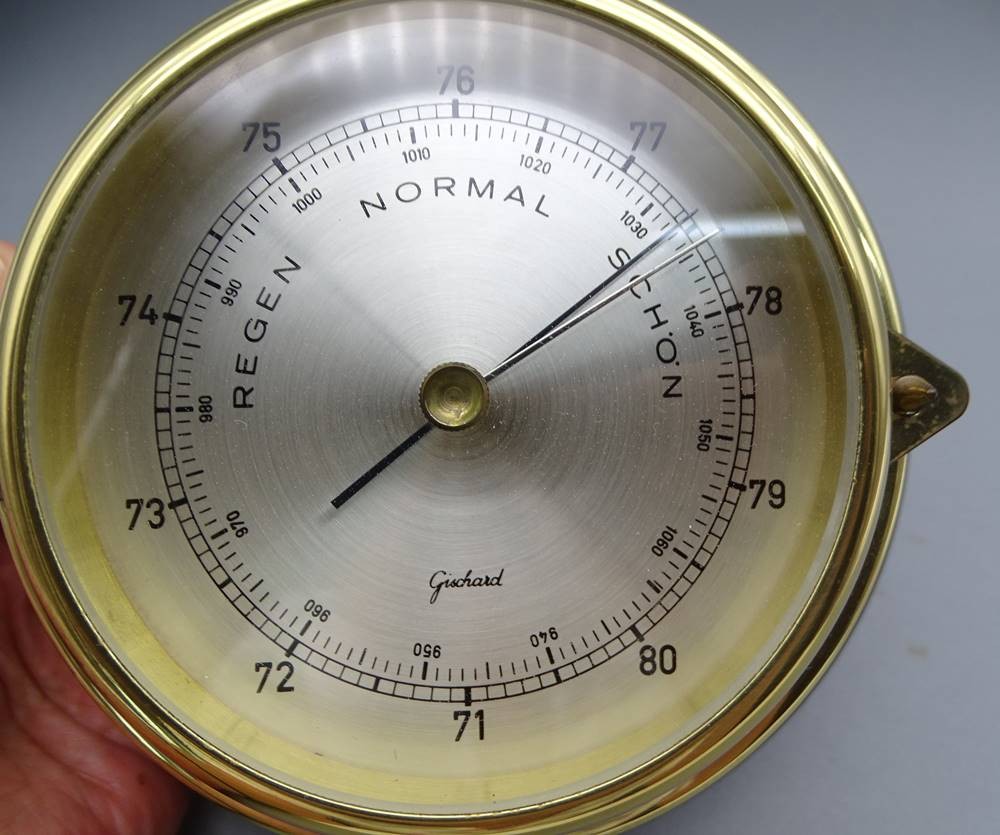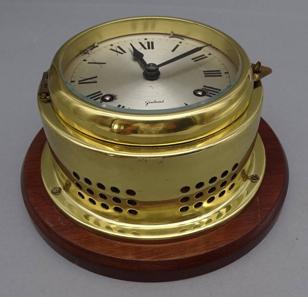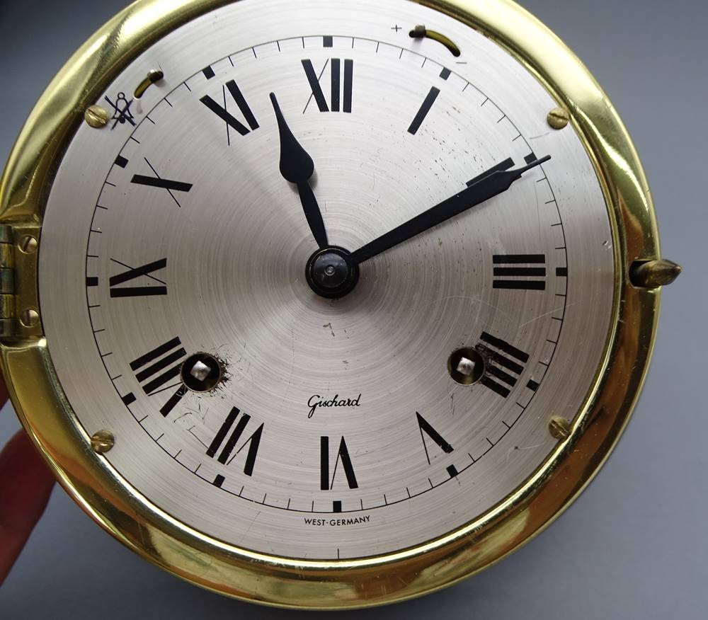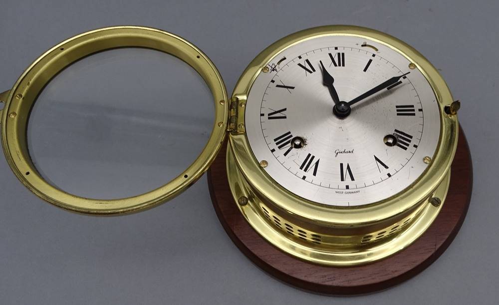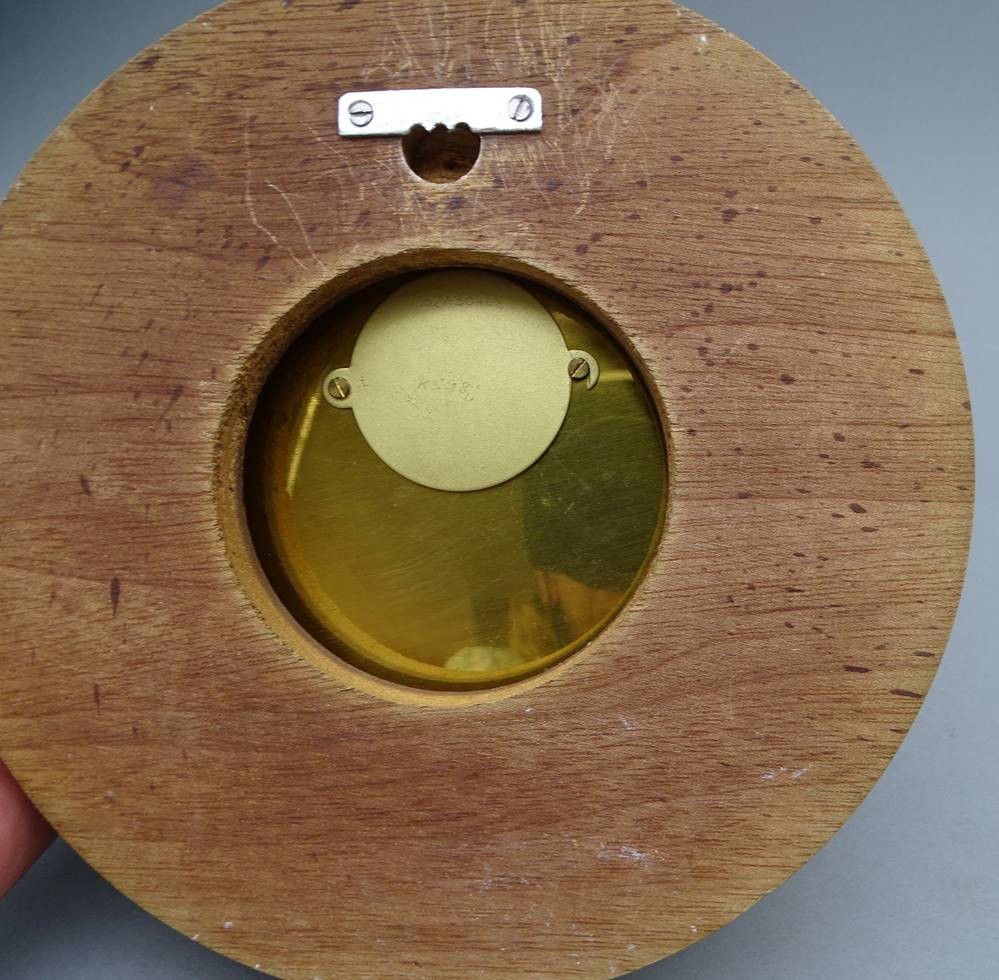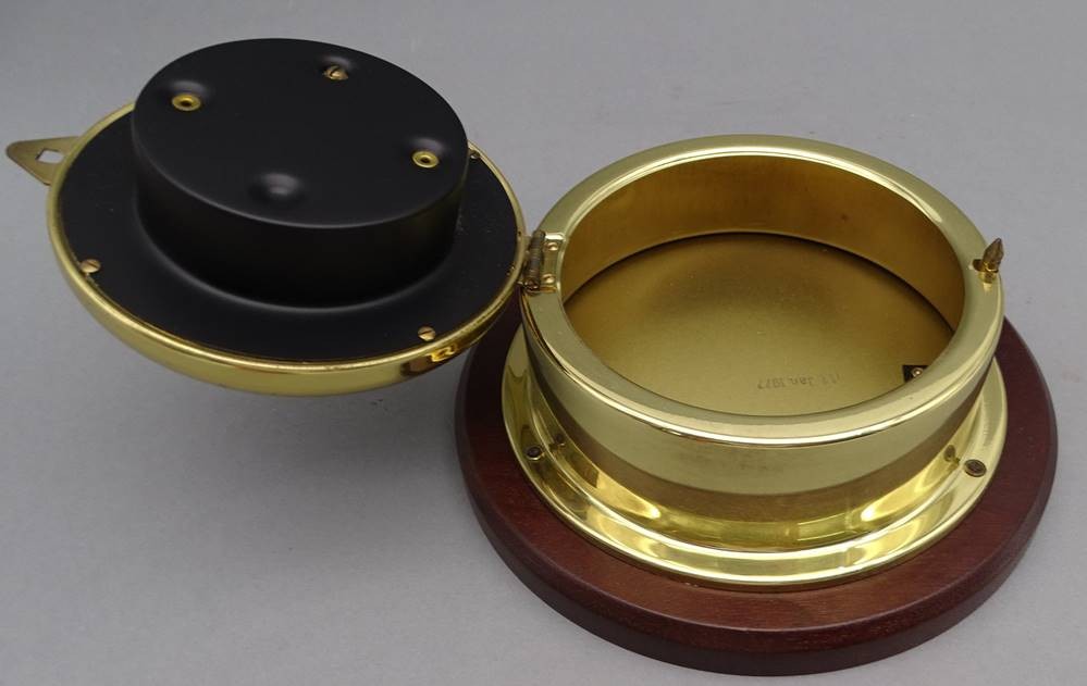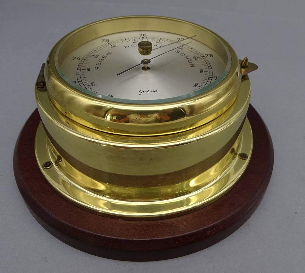 Glasenuhr "Gerhard" auf Holzbrett, Werk läuft, anbei Rechnung von2022 für Generalüberholung, H-8 cm, D-17 cm sowie passender Barometer, beide Messinggehäuse [1]