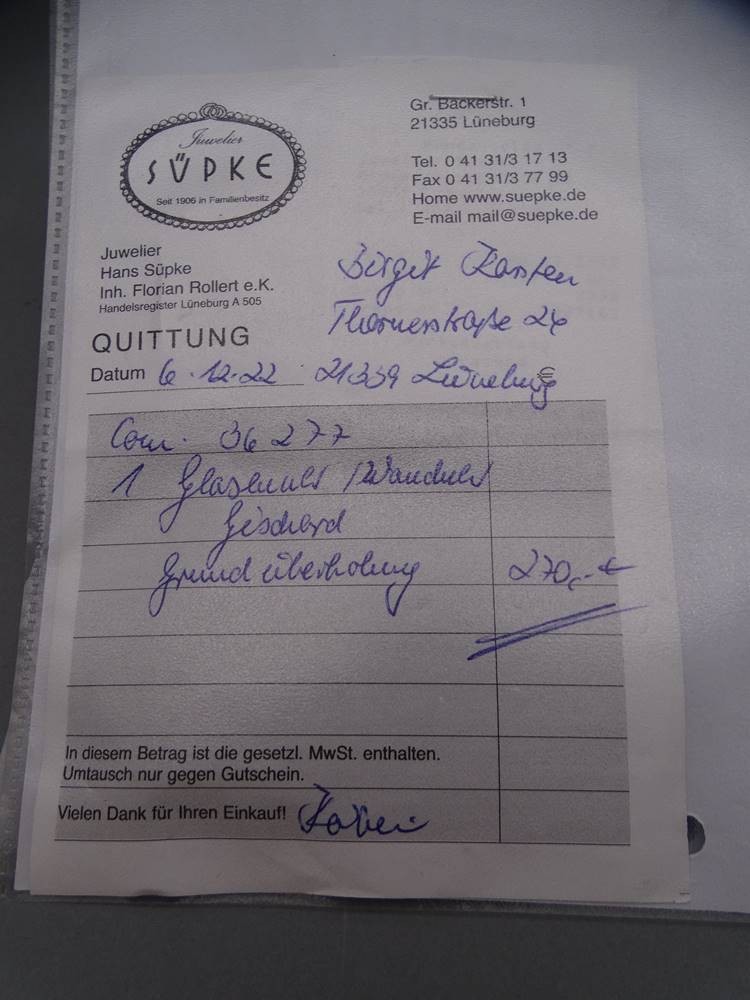 - Mit dem Zuschlag geht die Gefahr der Beschädigung, des Verlustes, der Verwechslung ect. an den Bieter über, Eigentümer der Sache wird dieser aber erst nach vollständiger Bezahlung. Der Zuschlag verpflichtet zur Abnahme und zur sofortigen Bezahlung in Euro.