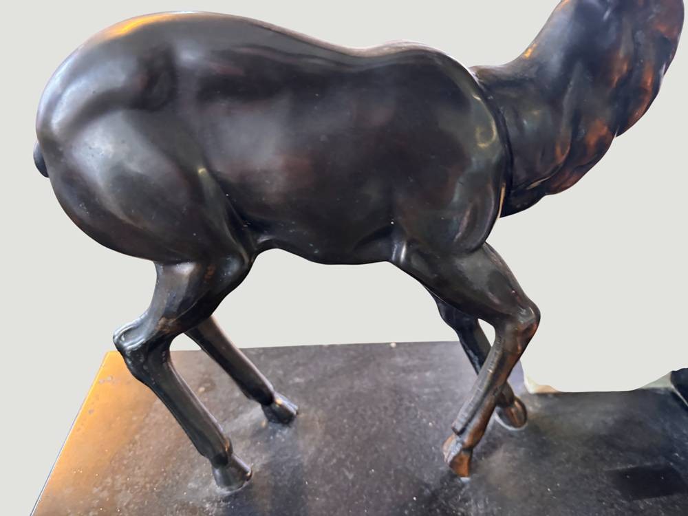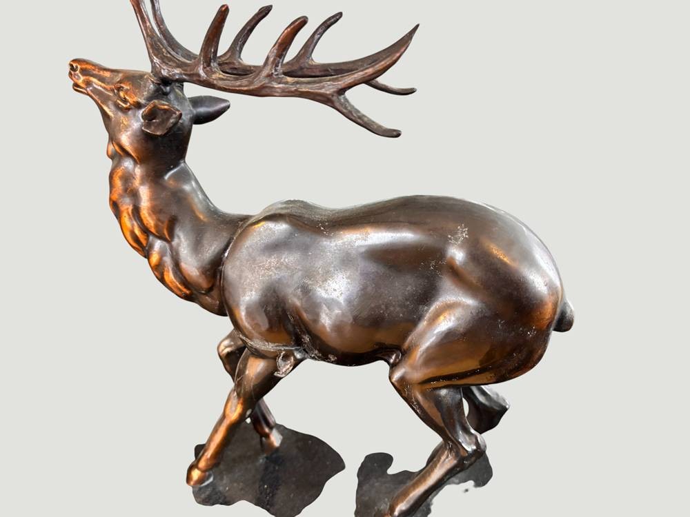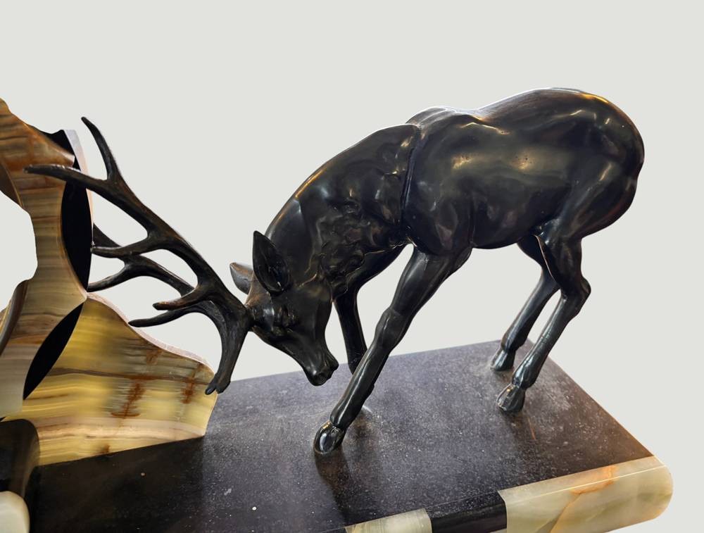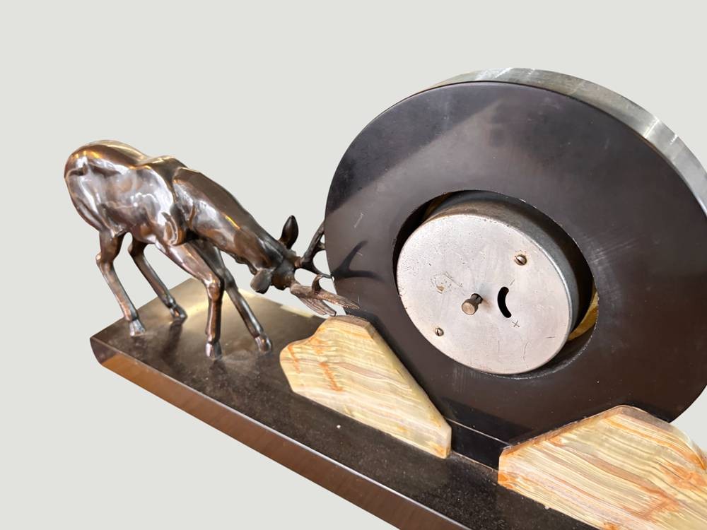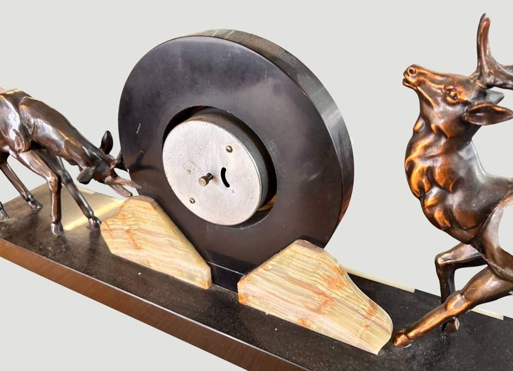 gr. Art Deco Kaminuhr, Marmor/Onyx mit Guss-Hirschen, 1x hinteres Bein mit Bruchstelle, Schlüsselwerk läuft, H-ca. 32 cm, B-ca. 79 cm [1]