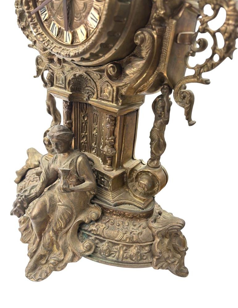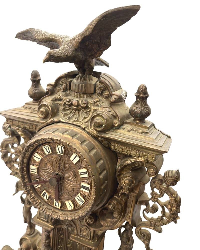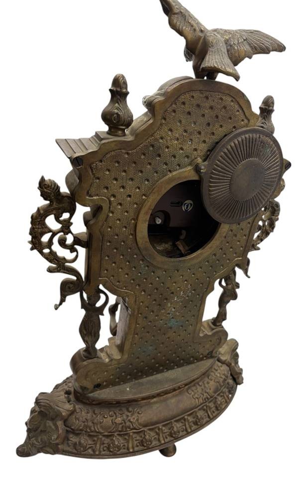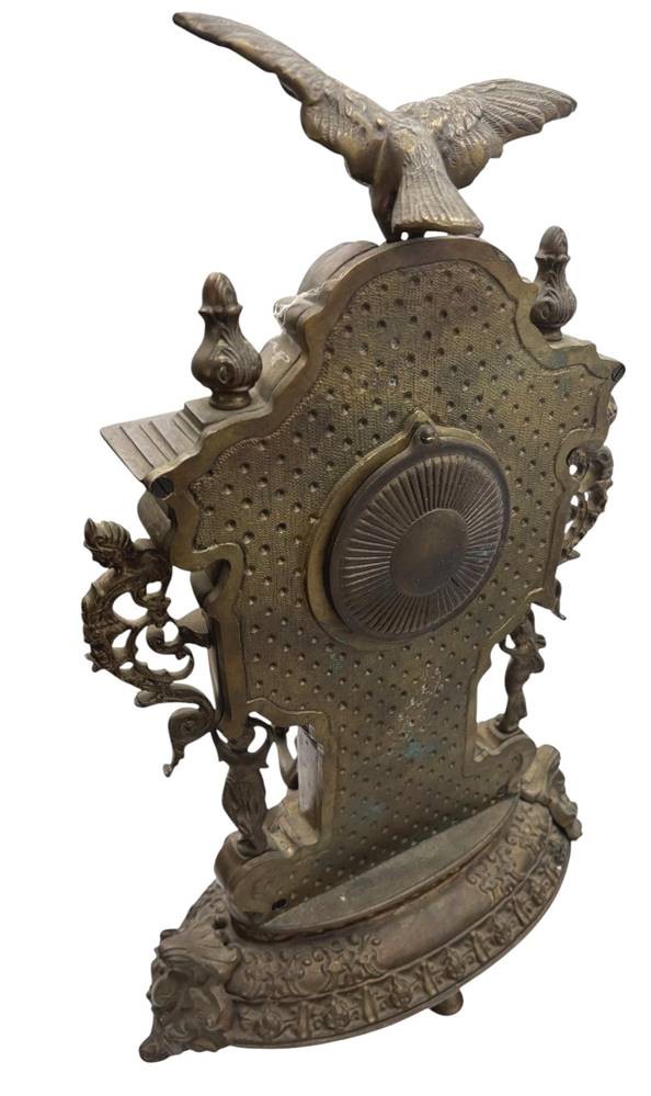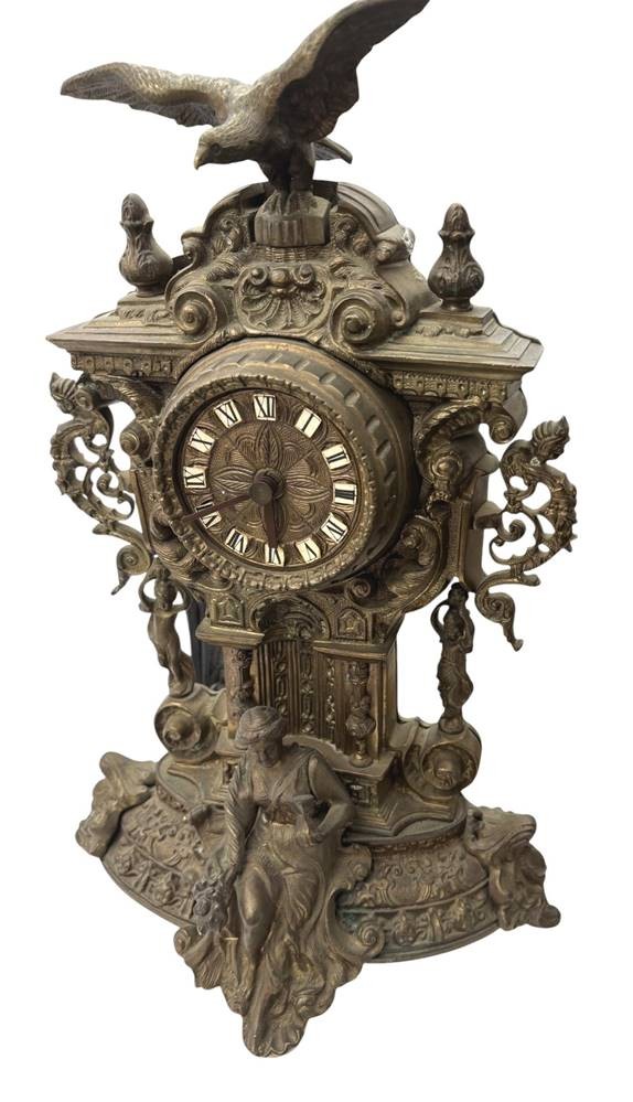 gr. Kaminuhrm Bronze, mit Frauenfigur und Adler als Bekrönung, neuzeitlich, innen Quartzwerk, H-45 cm, ca. 10 kg [1]