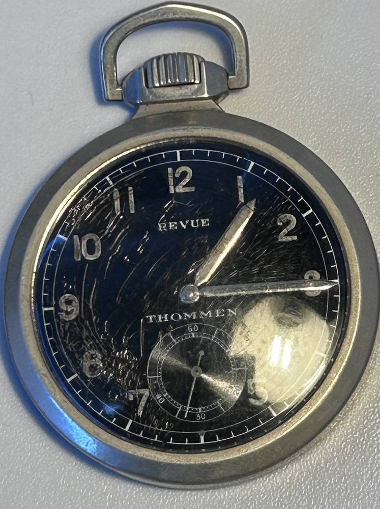 gr. mechan. Beobachteruhr, militärisch, 2.WK "Revue Thommen", Werk läuft, verso Monogramm HA, D-5 cm [1]