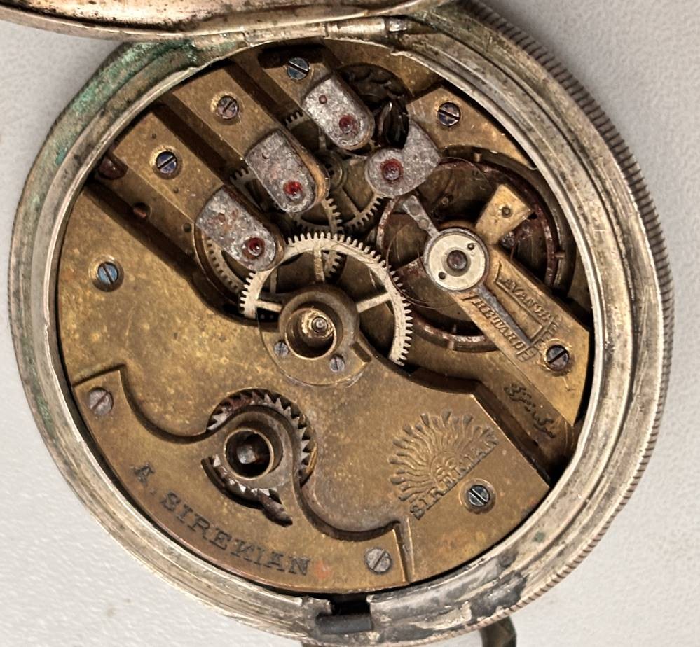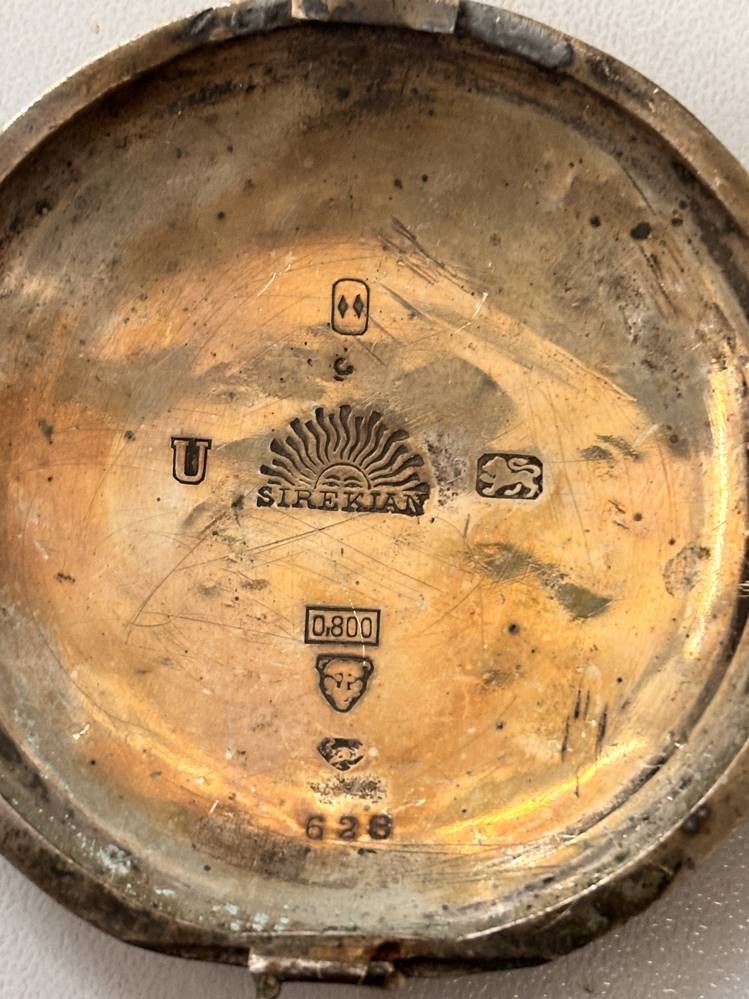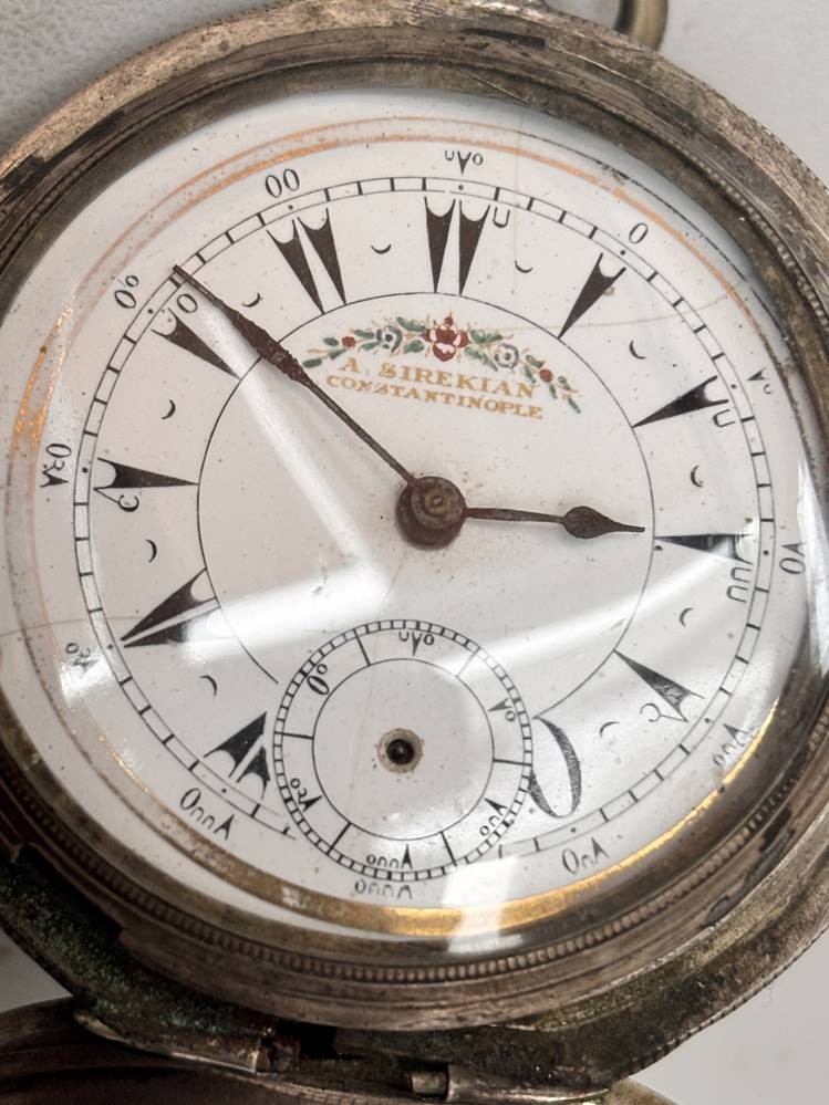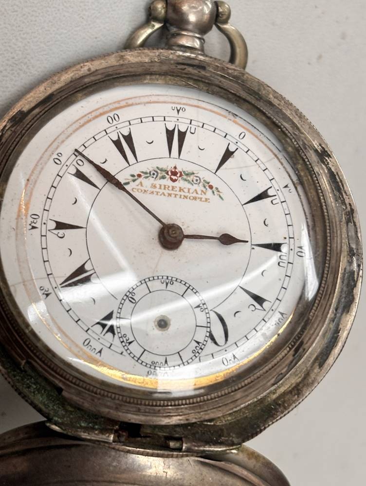 gr. Schlüsseltaschenuhr, Sirekan-Konstantinople, Silbergehäuse, Sprungdeckel und Glas-Ring lose anbei, Werk steht, Reste altes Etikett/Kleber?, ungepflegt, D-5,5 cm, zus. 152 gr. [1]