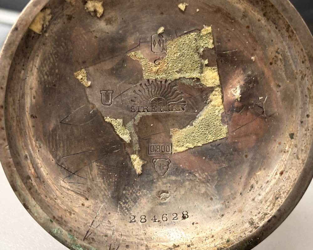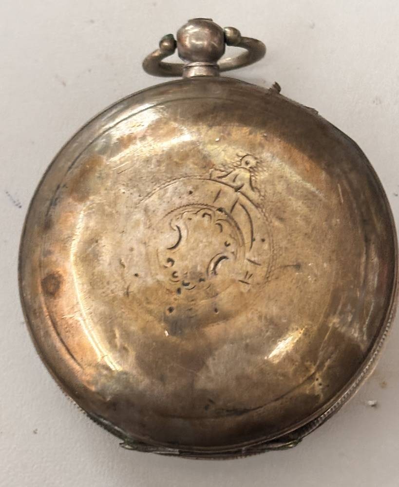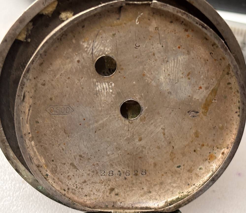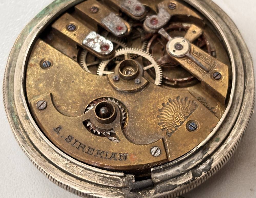 gr. Schlüsseltaschenuhr, Sirekan-Konstantinople, Silbergehäuse, Sprungdeckel und Glas-Ring lose anbei, Werk steht, Reste altes Etikett/Kleber?, ungepflegt, D-5,5 cm, zus. 152 gr. [1]