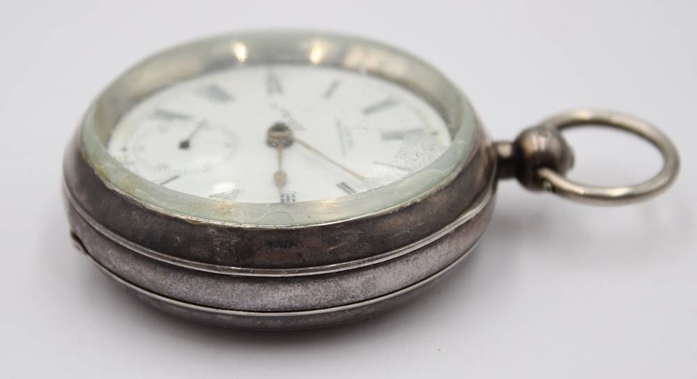 gr. Taschenuhr um 1900, Waltham, Silbergehäuse, Schlüsselwerk läuft, Glas lose, ca. D-5,7cm