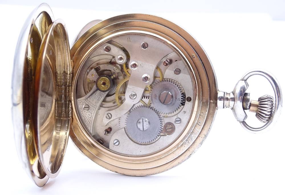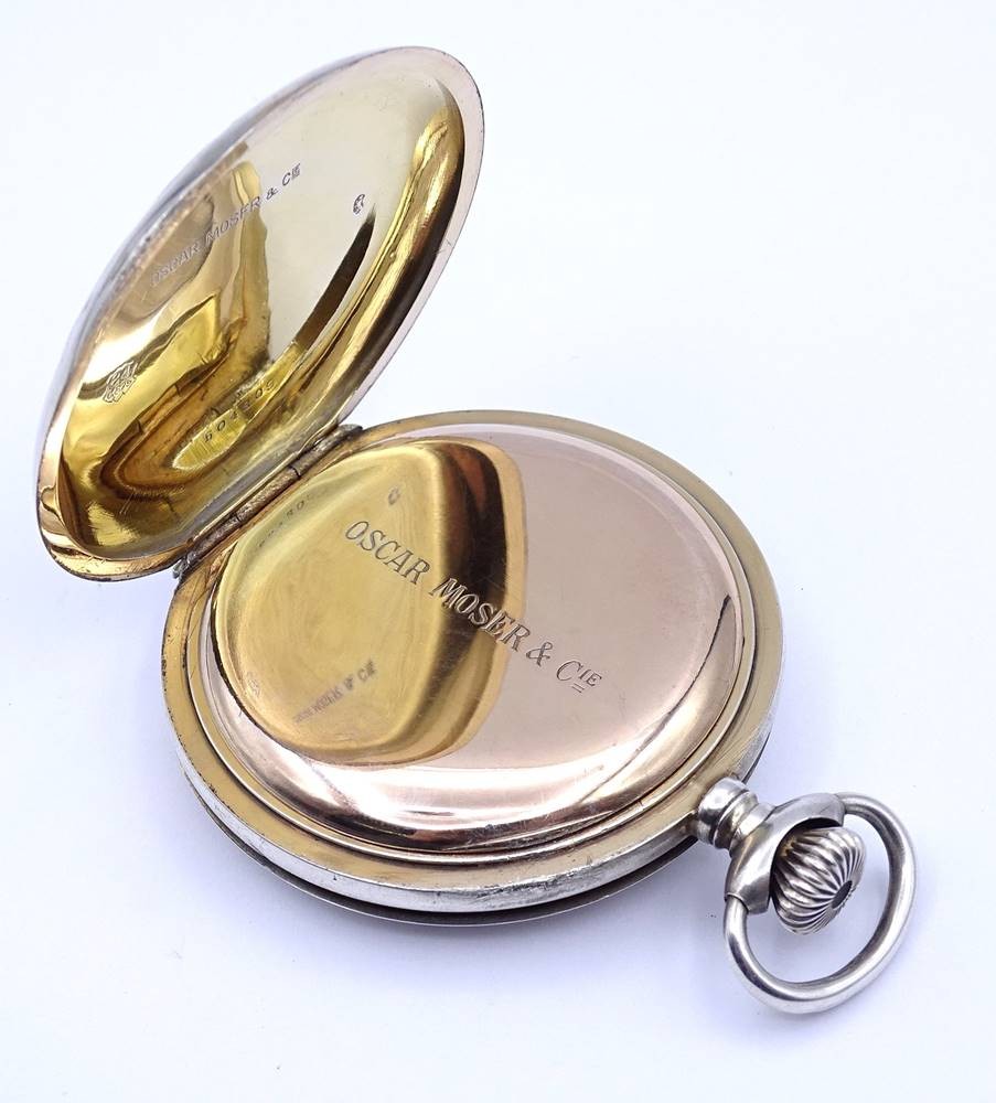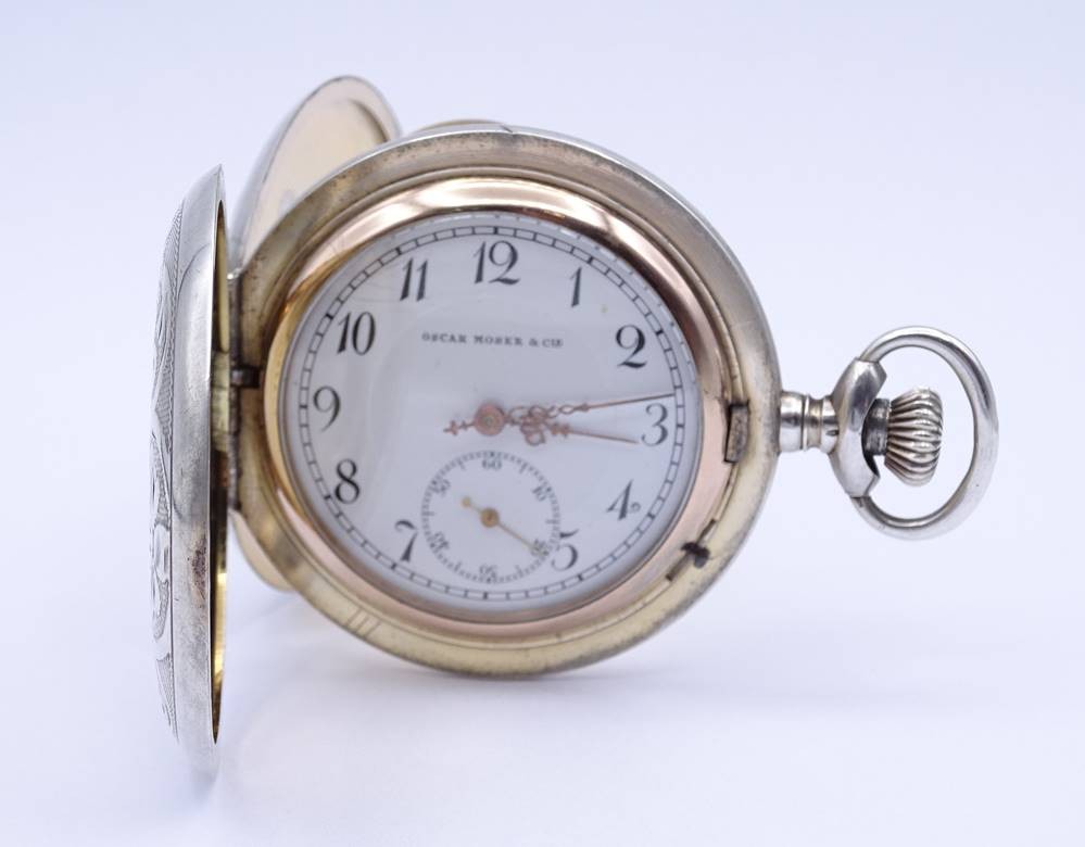 Große Herren Taschenuhr "Oscar Moser & Cie", Silber -84- 0.875, D. 59,5mm, mechanisch, Krone lose, daher nicht aufziehbar, Funktion nicht getestet,Optisch guter Zustand, durch schütteln bewegt sich der Sek. Zeiger [1]