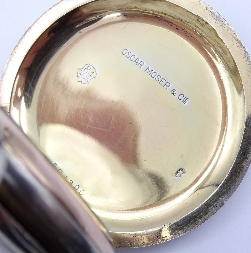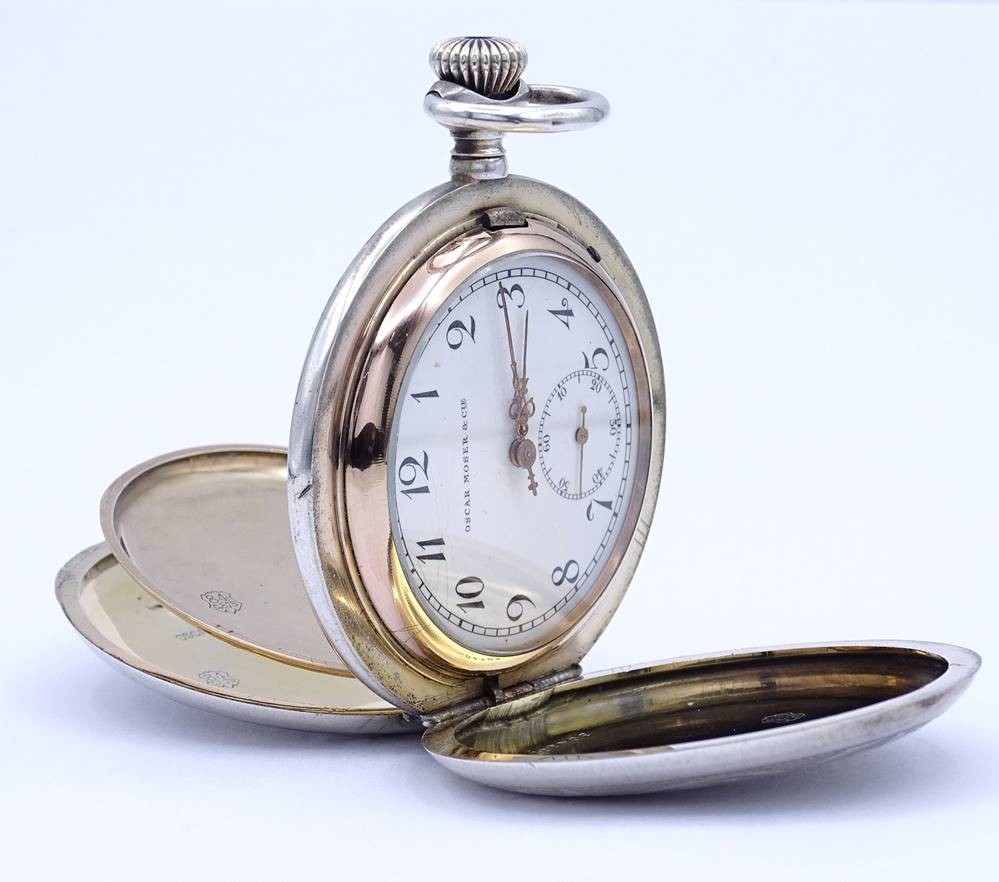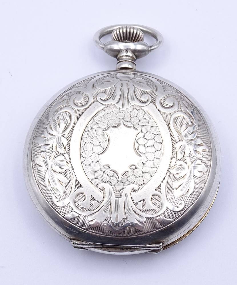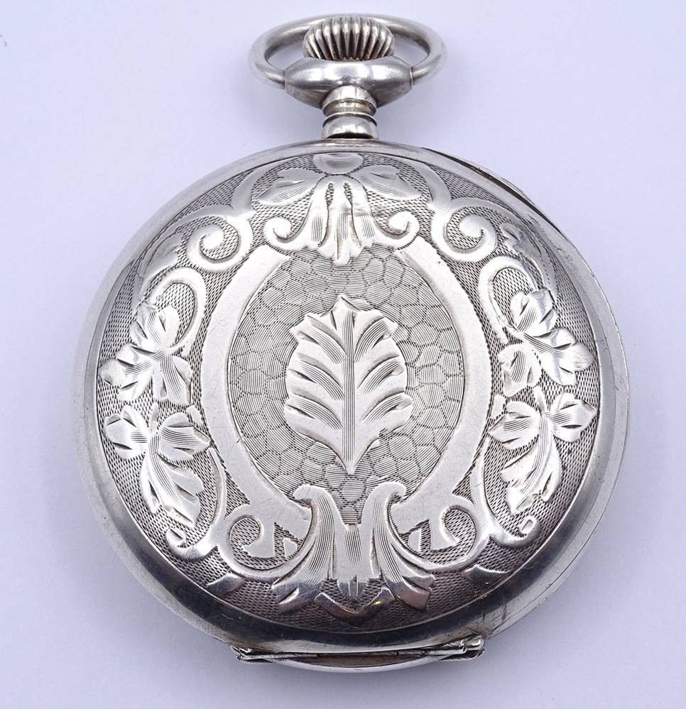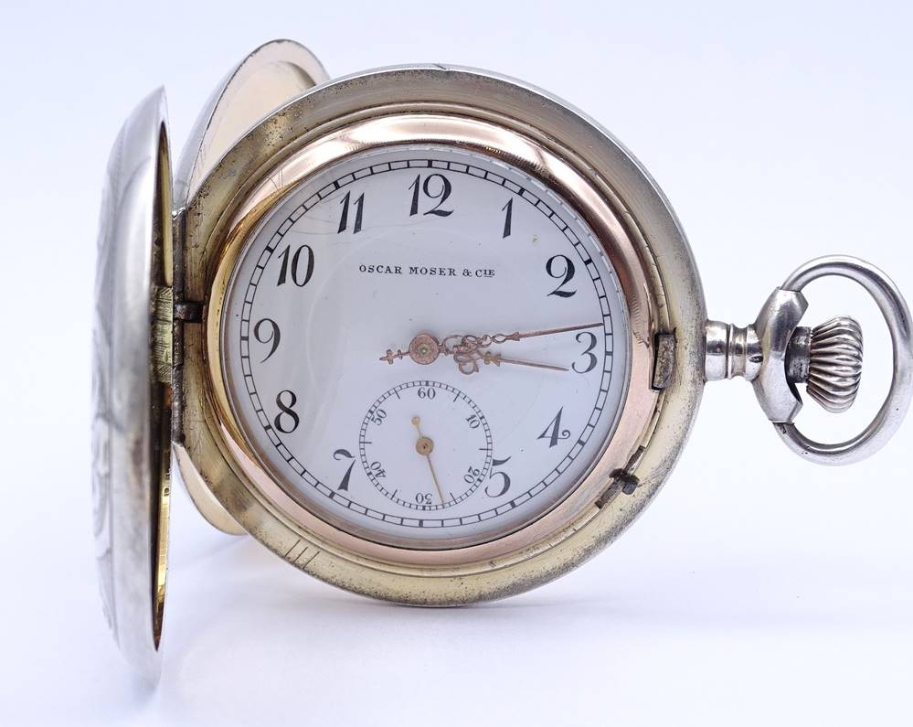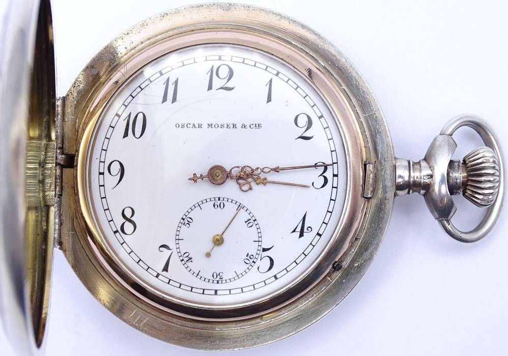 Große Herren Taschenuhr "Oscar Moser & Cie", Silber -84- 0.875, D. 59,5mm, mechanisch, Krone lose, daher nicht aufziehbar, Funktion nicht getestet,Optisch guter Zustand, durch schütteln bewegt sich der Sek. Zeiger