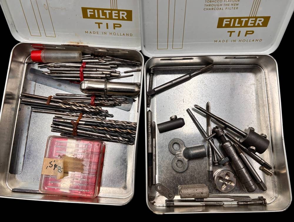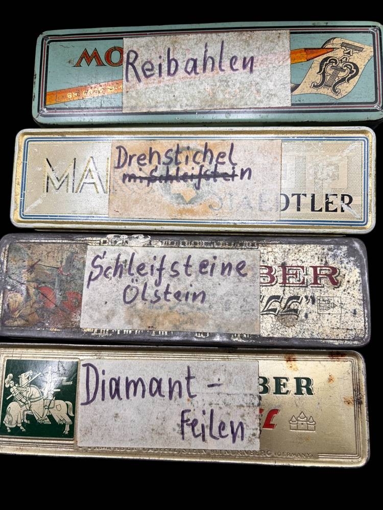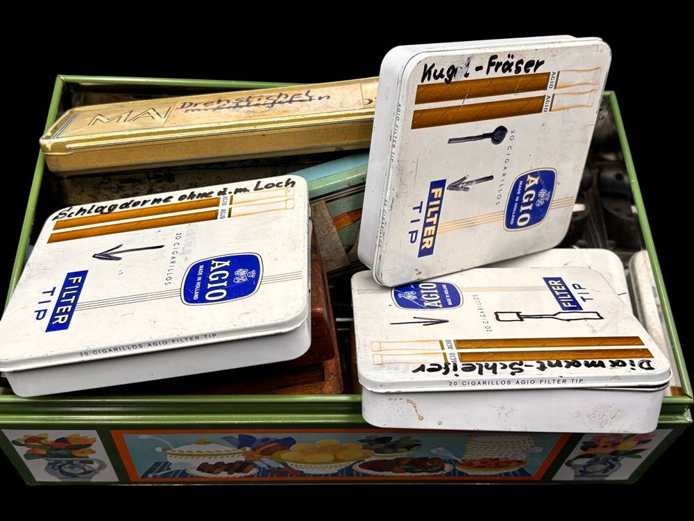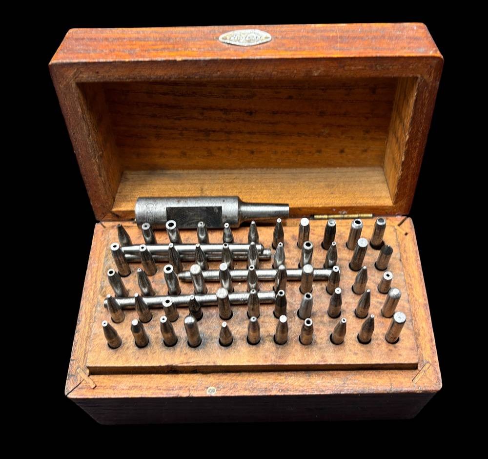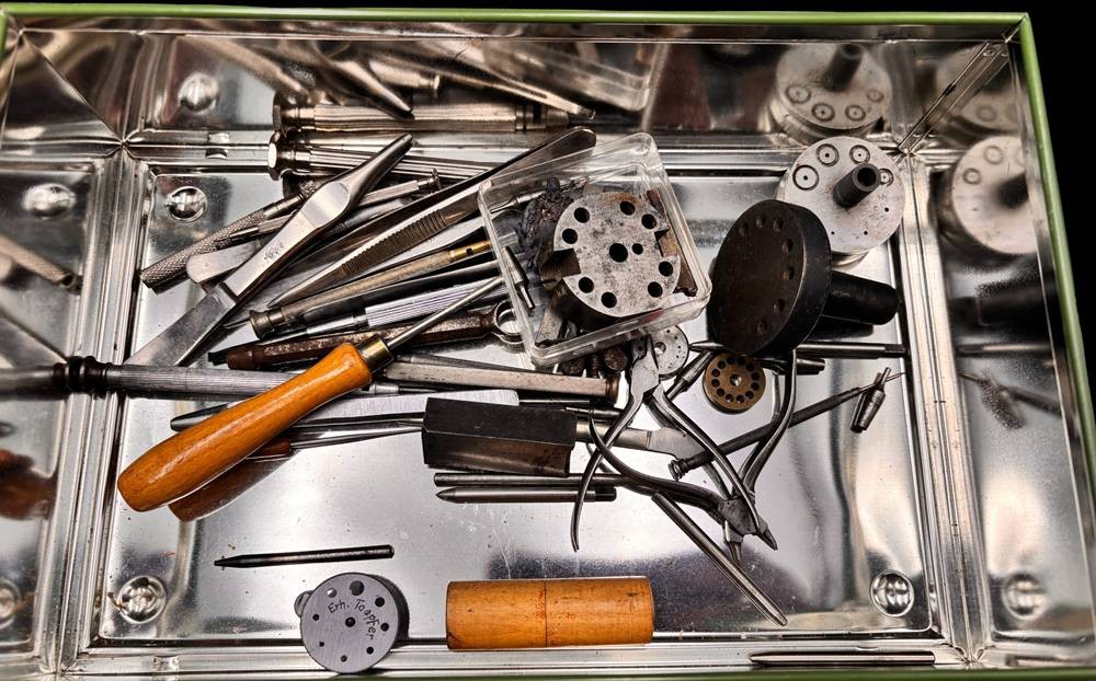 grosser Blechkasten mit Uhrmacherwerkzeug und Zubehör, 1 Holzkasten von Boley mit Stempellocher [1]
