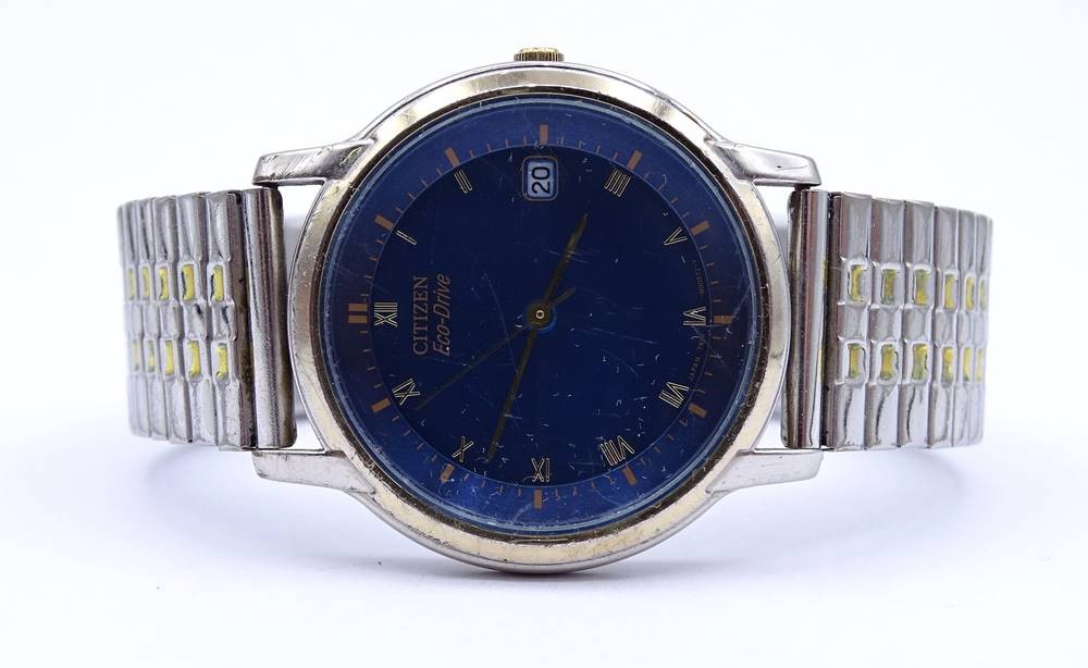 Herren Armbanduhr "Citizen" Eco Drive, Quartzwerk, D. 3,4cm, Batterie fast leer, starke Tragespuren [1]