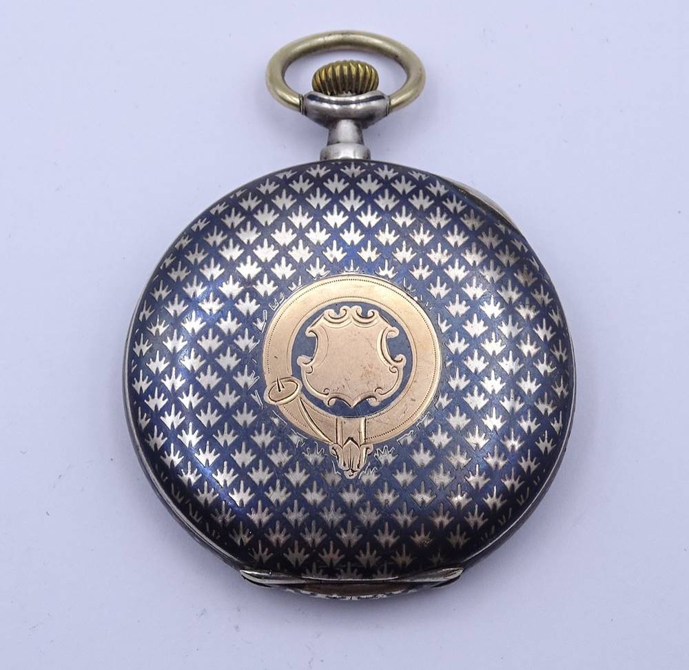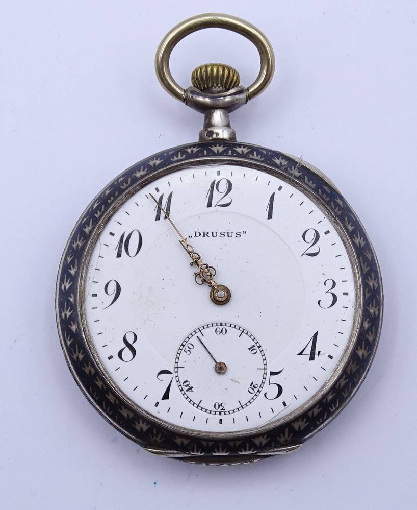 Herren Taschenuhr "Drusus", Silbergehäuse, Niello Technik, Glas fehlt