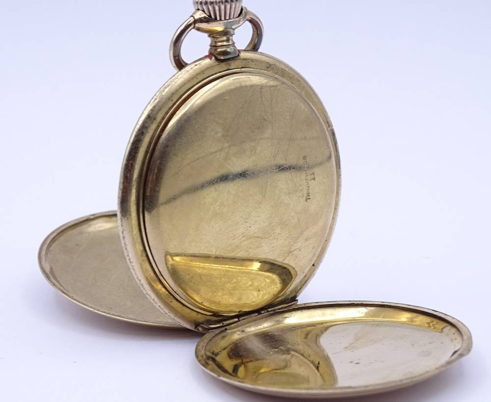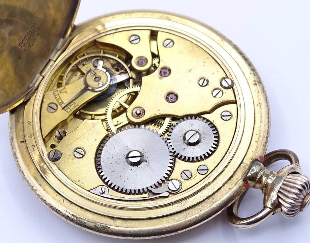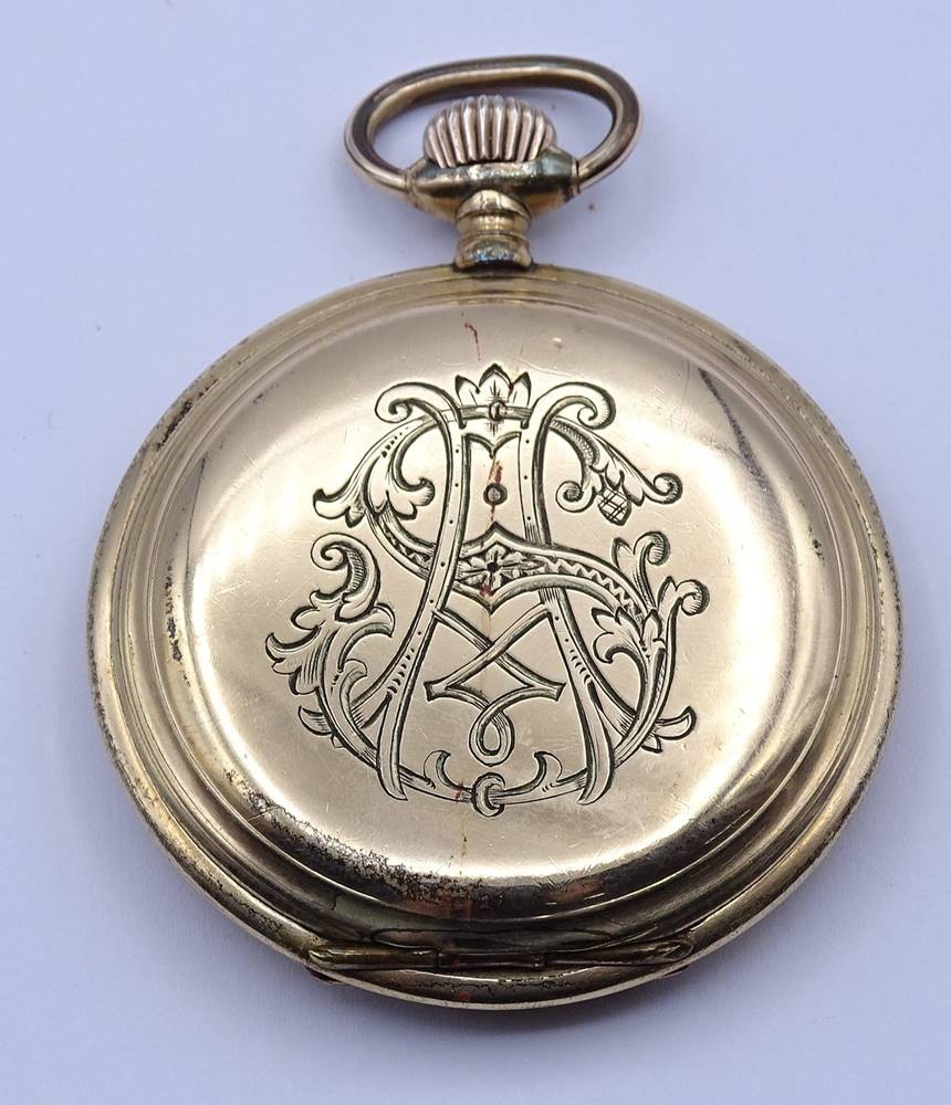 Herren Taschenuhr, mechanisch, Werk läuft, D. 53mm, Zifferblatt defekt, Deckel mit Monogramm, goldfarben,