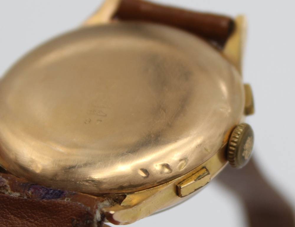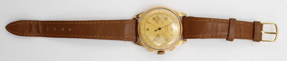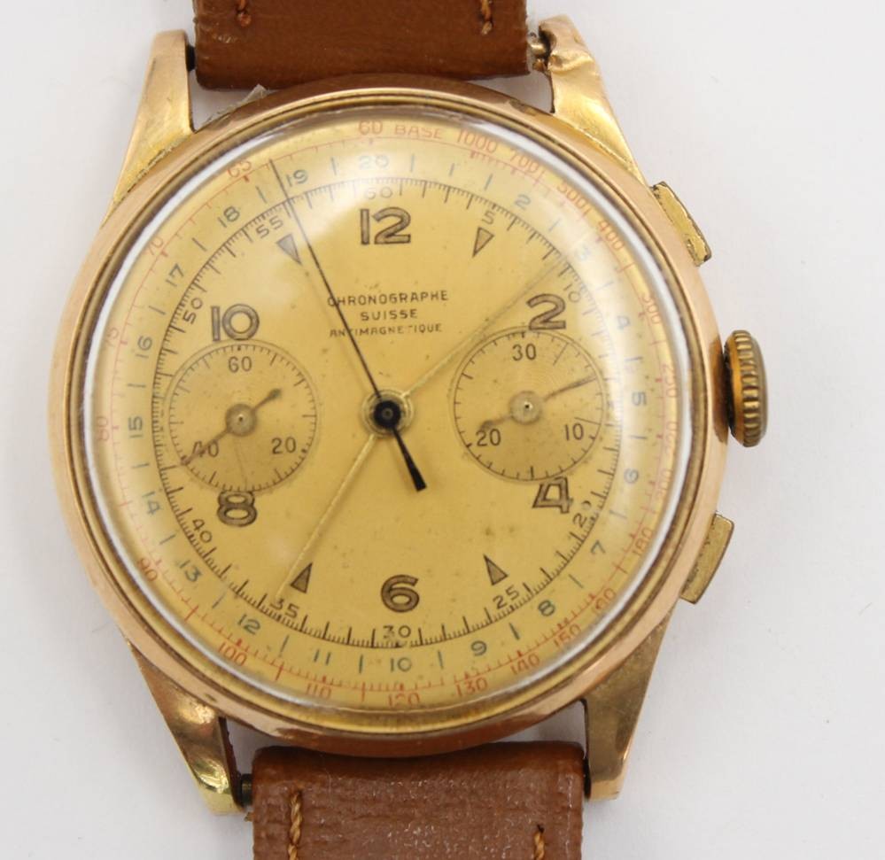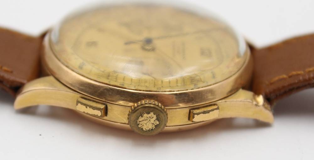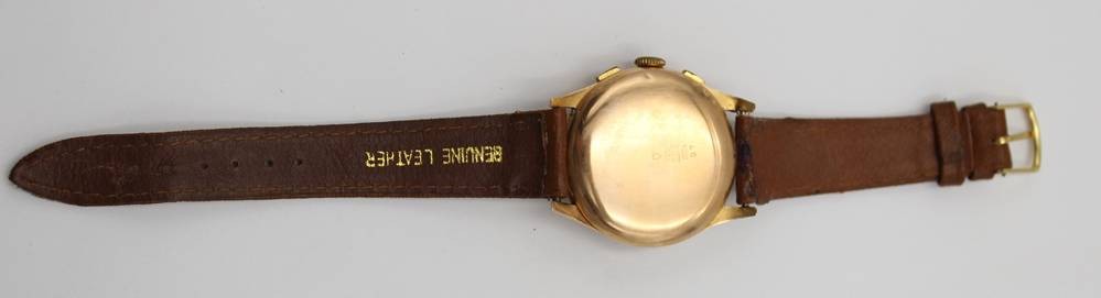 Herrenarmbanduhr, Chronographe Suisse, 750/000 GG, Handaufzug, Werk läuft, Gehäuse mit div. Druckstellen, Lederband, D-3,5cm [1]