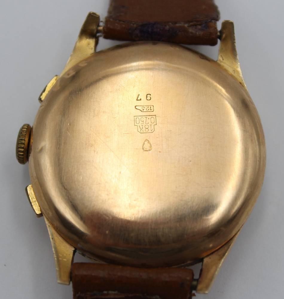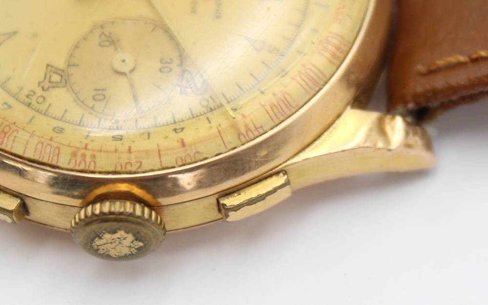 Herrenarmbanduhr, Chronographe Suisse, 750/000 GG, Handaufzug, Werk läuft, Gehäuse mit div. Druckstellen, Lederband, D-3,5cm