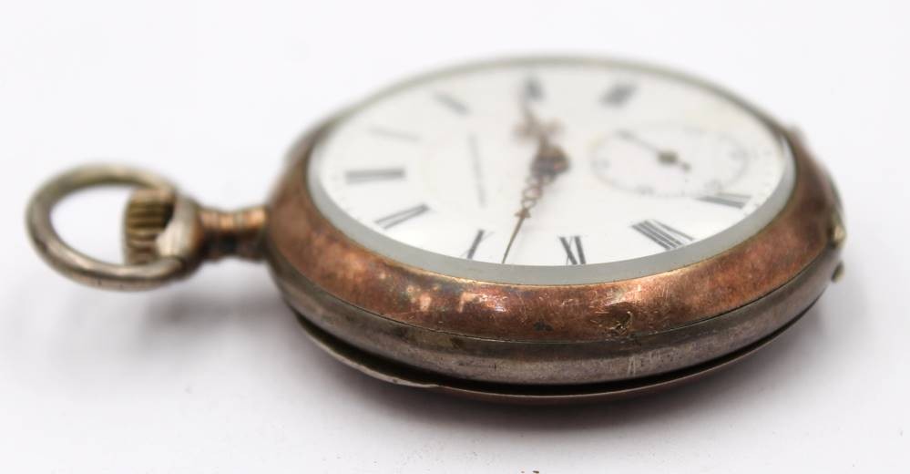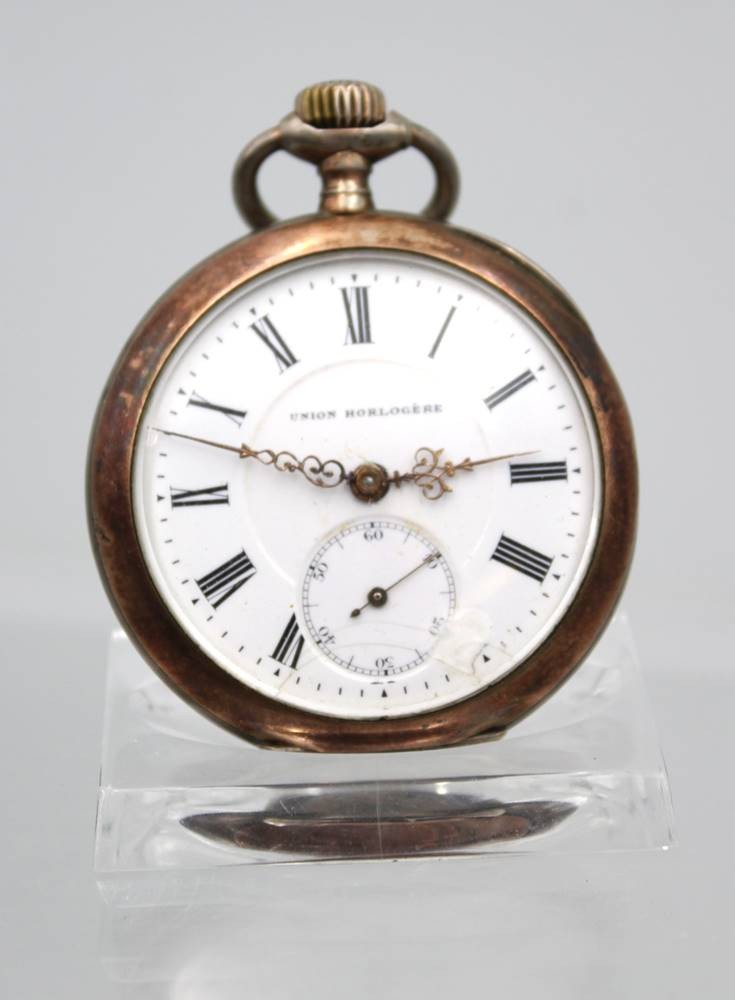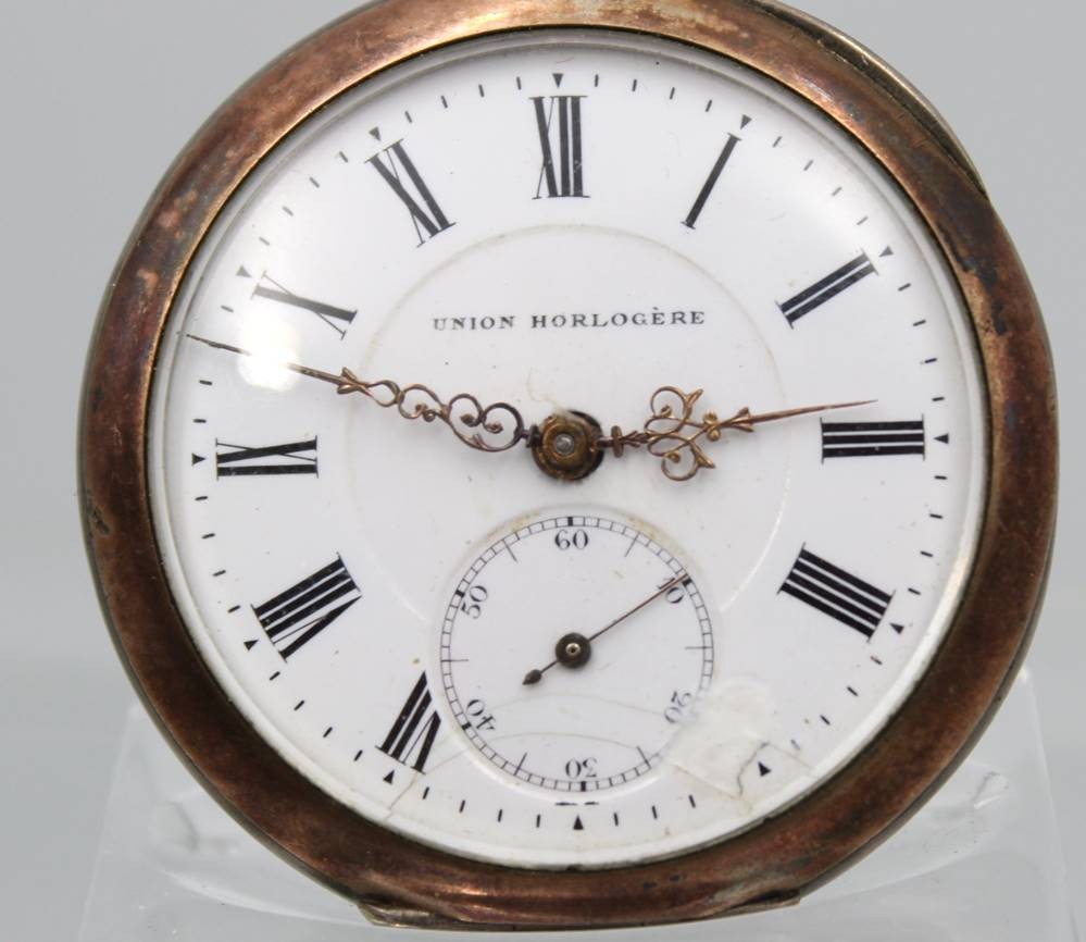 Herrentaschenuhr, 800er Silbergehäuse, Union Hologéré, Kronenaufzug, Werk überzogen, Rückendeckel lose, Ziffernblatt altrissig, D-4,8cm