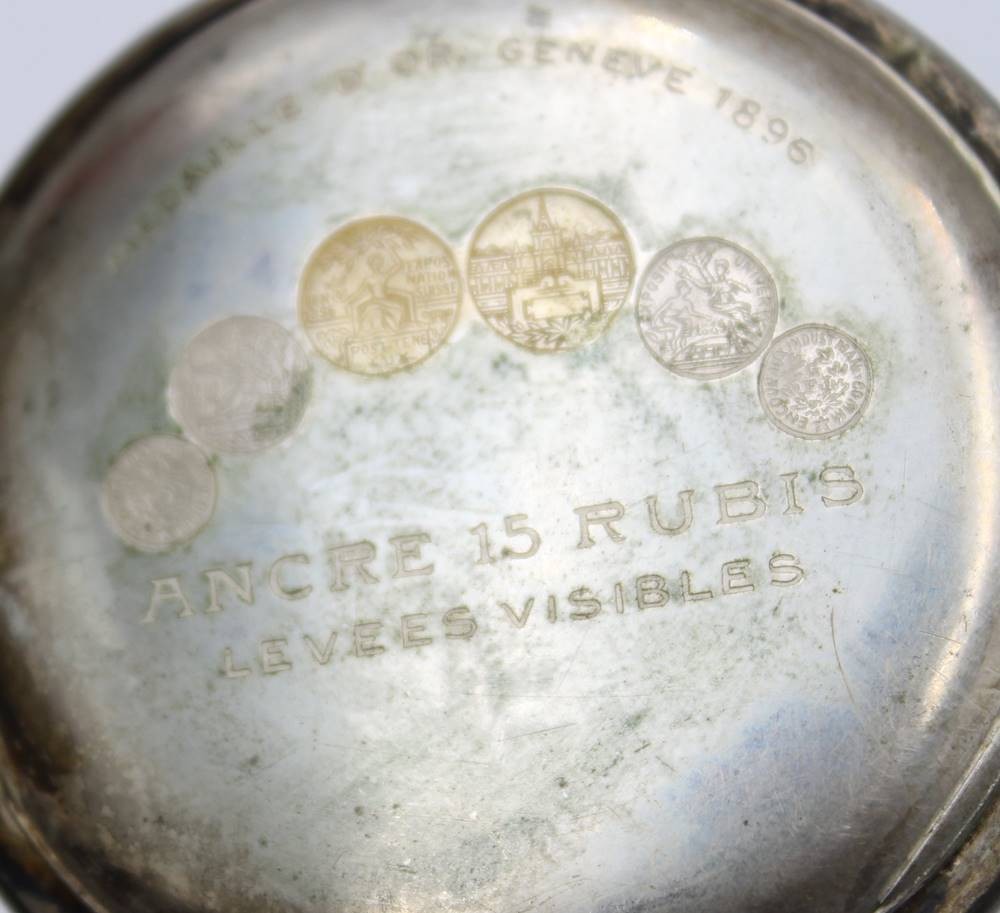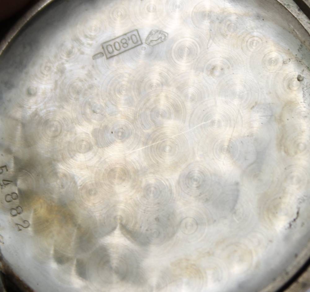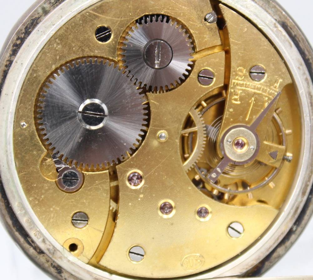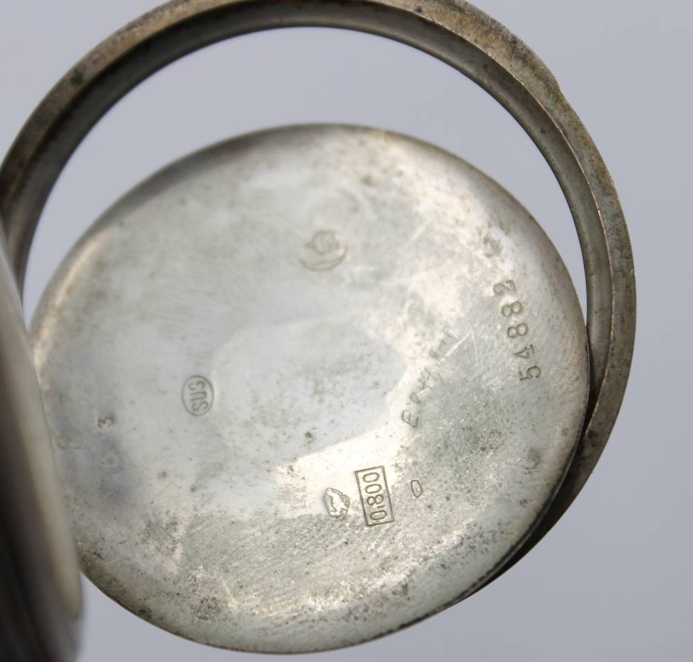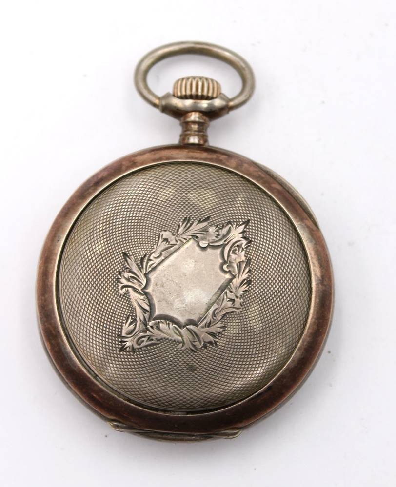 Herrentaschenuhr, 800er Silbergehäuse, Union Hologéré, Kronenaufzug, Werk überzogen, Rückendeckel lose, Ziffernblatt altrissig, D-4,8cm [1]