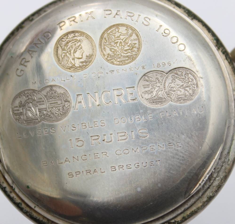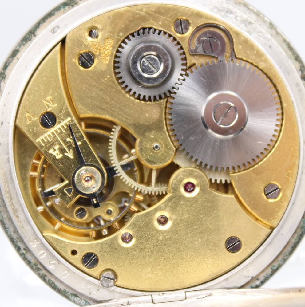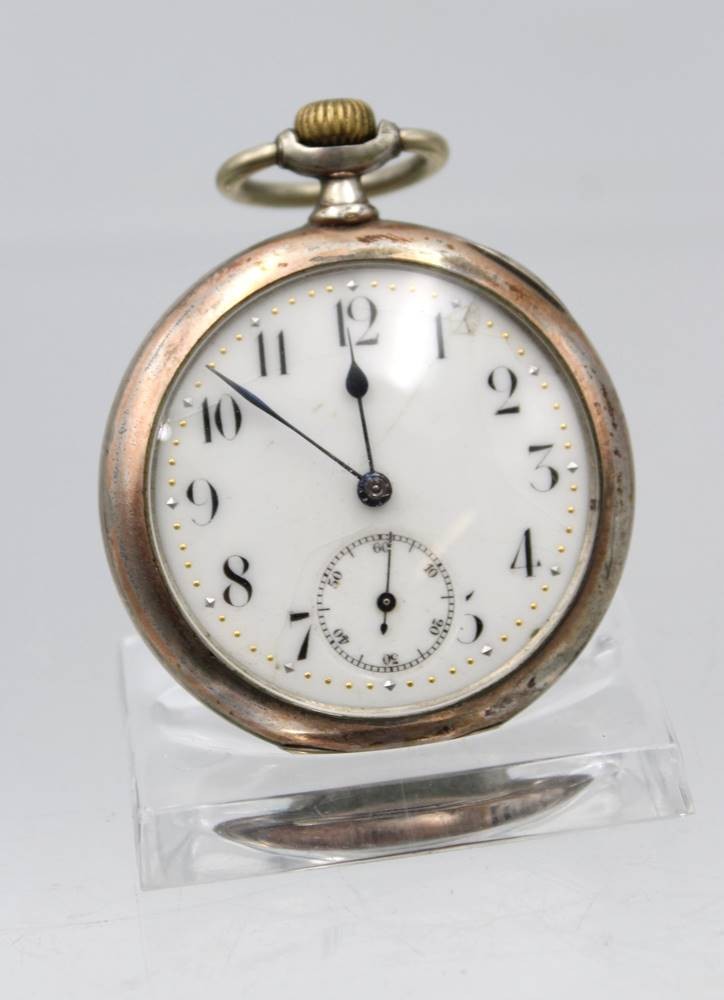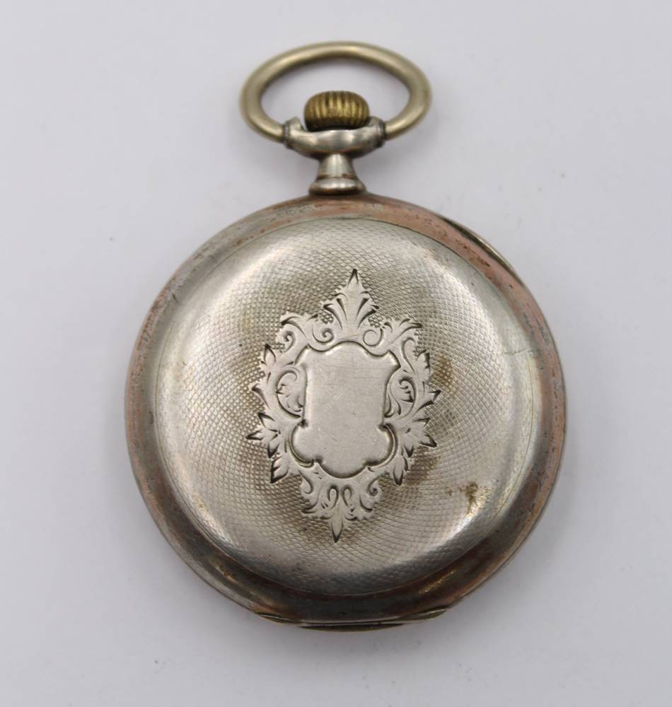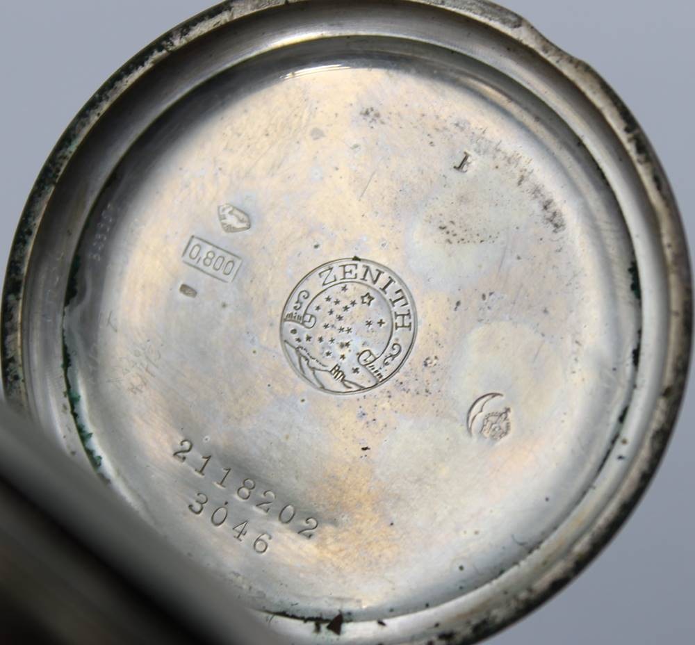 Herrentaschenuhr, 800er Silbergehäuse, Zenith, Kronenaufzug, Werk läuft an, Ziffernblatt altrissig, ca. D-4,8cm [1]