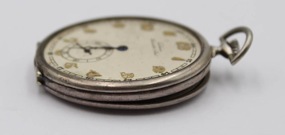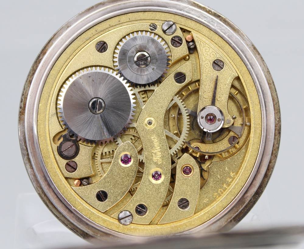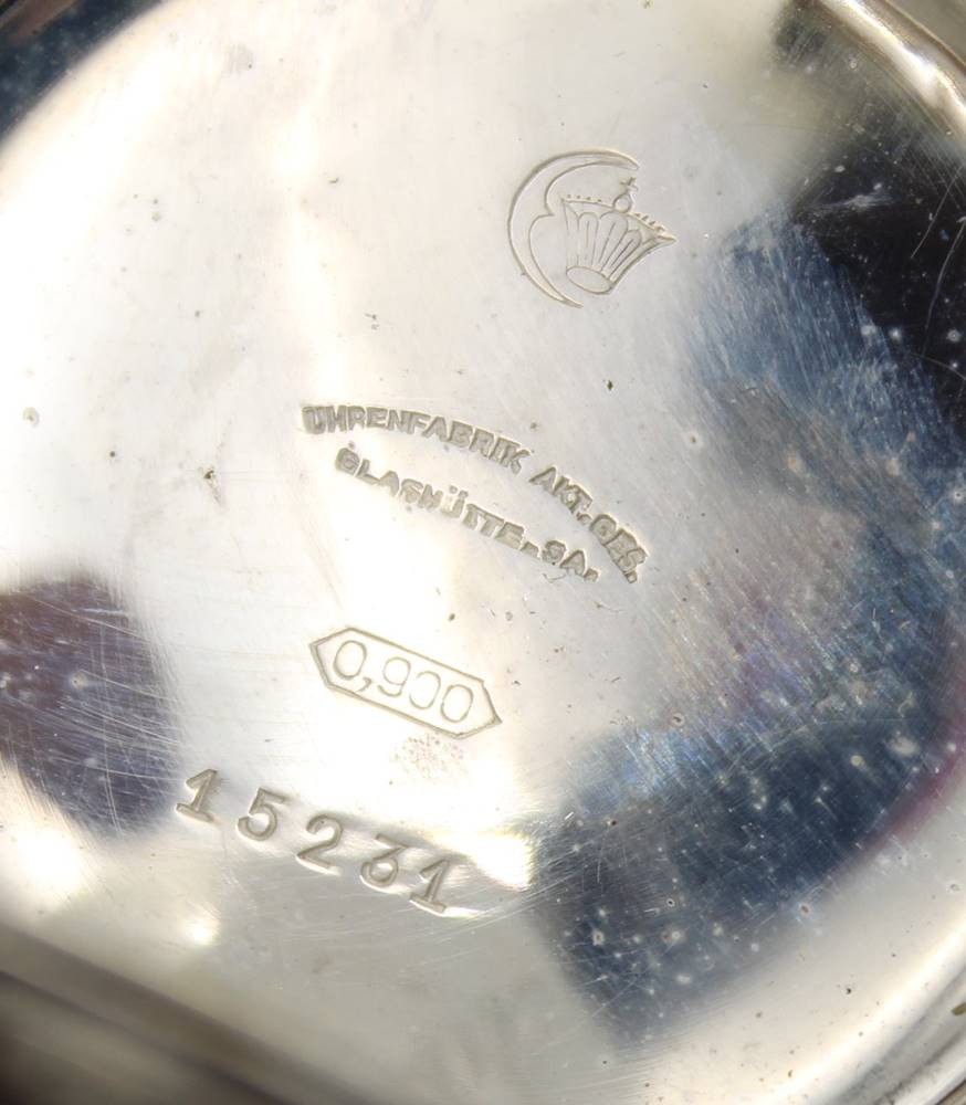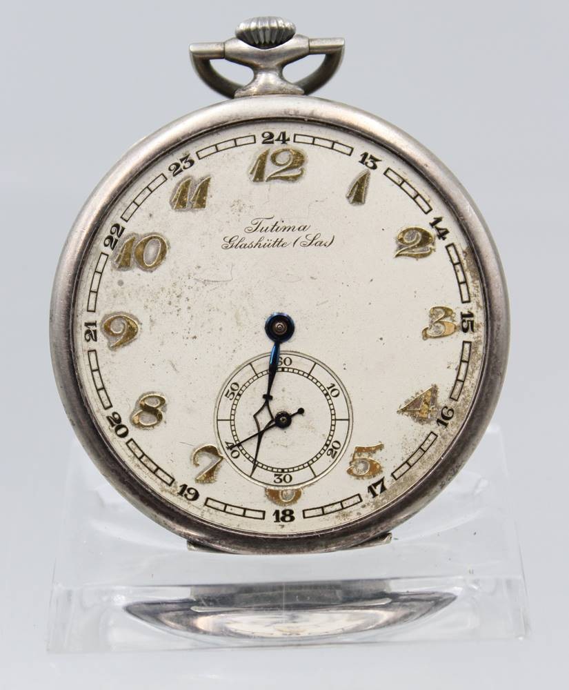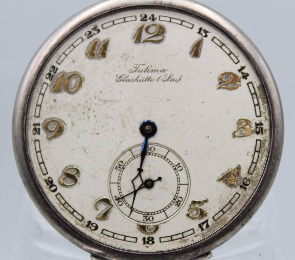 Herrentaschenuhr, Tutima Glashütte, 900er Silbergehäuse, Kronenaufzug, Werk läuft, Glas fehlt, D-4,8cm, innen Namensgravur. [1]