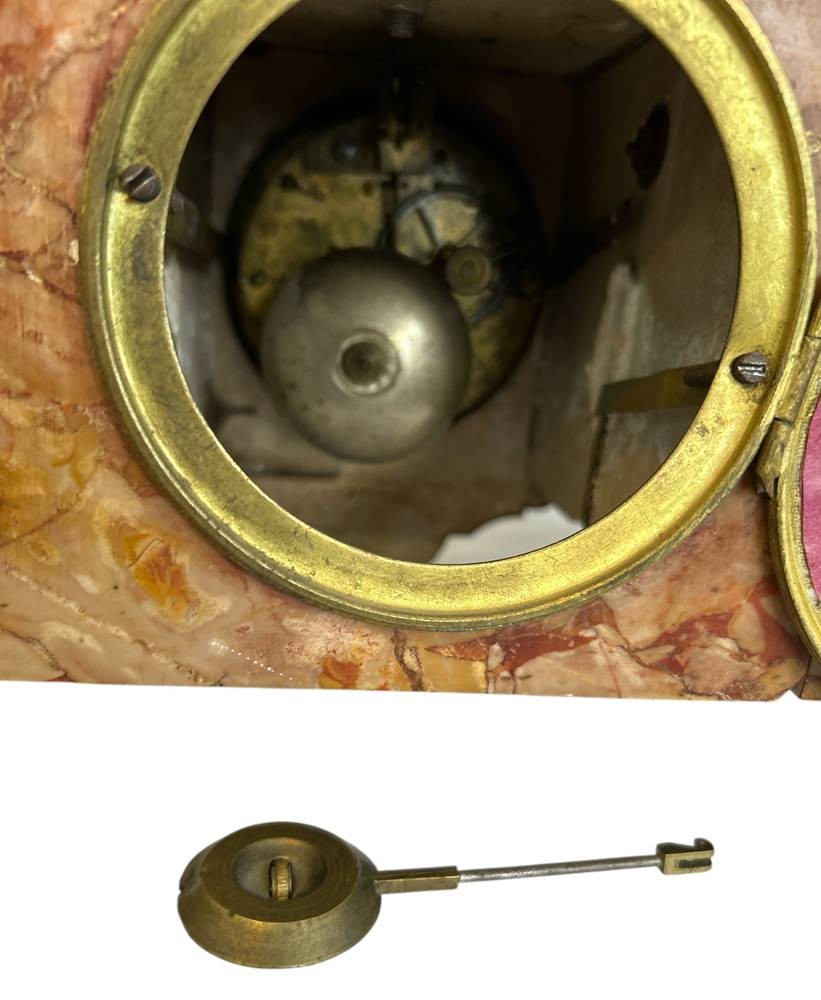 hohe Kaminuhr, Marmor, Zinkguss-Figur beschriftet "Belle Fermier", Werk nicht geprüft, H-66 cm [1]