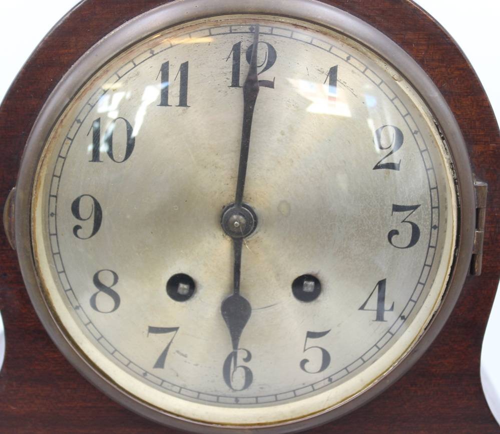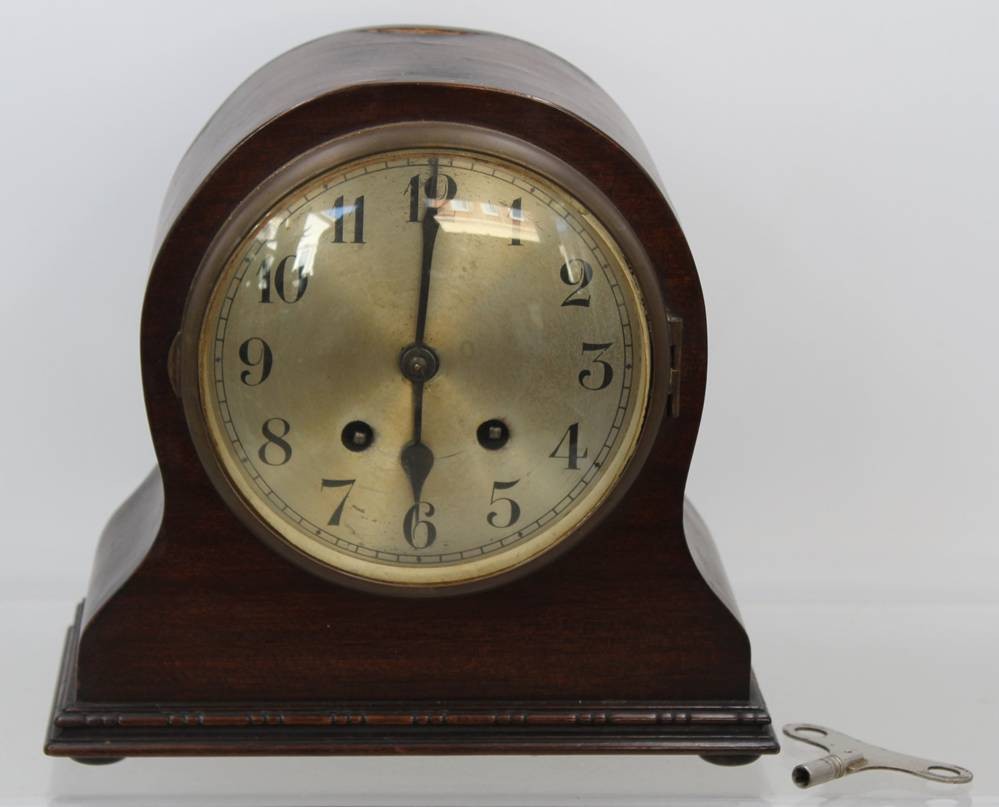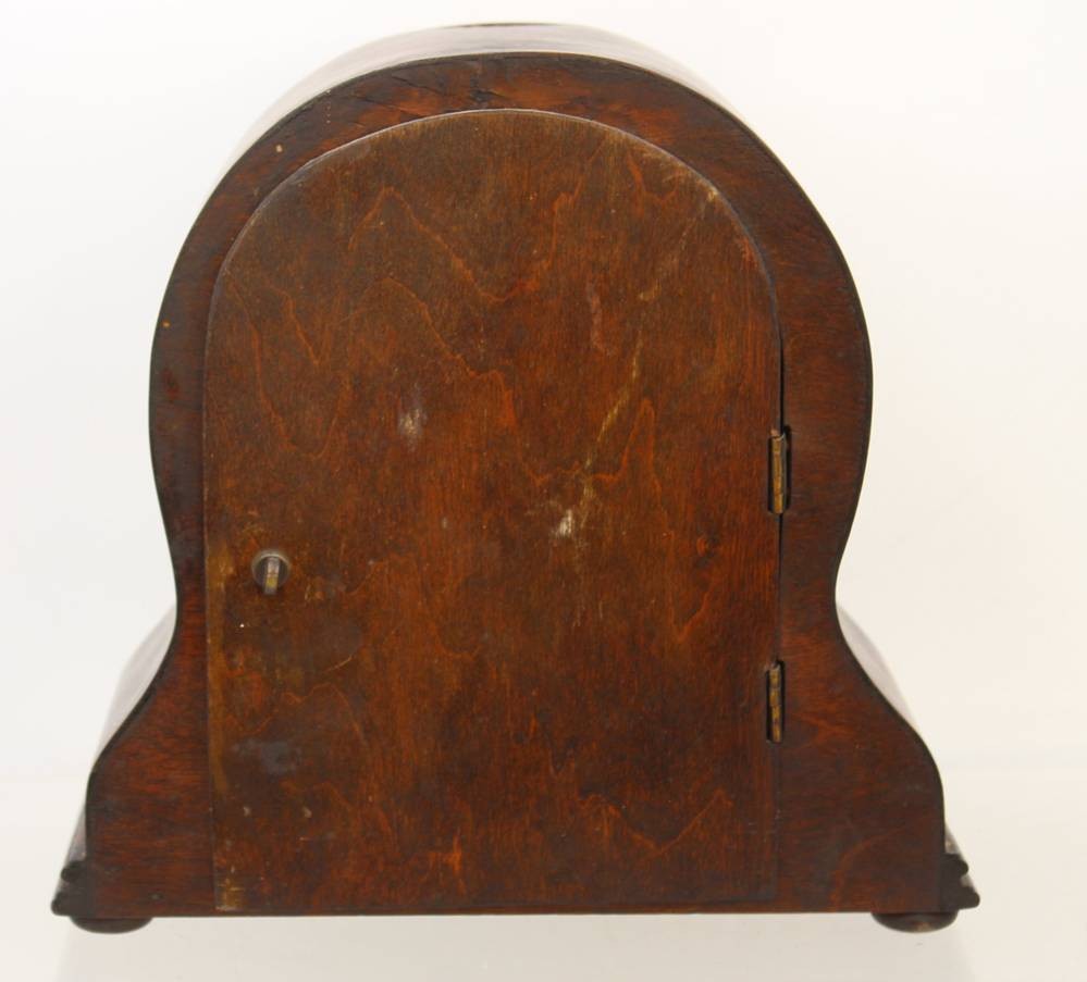 Kaminuhr um 1930, Holzgehäuse, dieses beschädigt, Schlüsselwerk läuft kurz an, ca. H-23cm B-24cm [1]