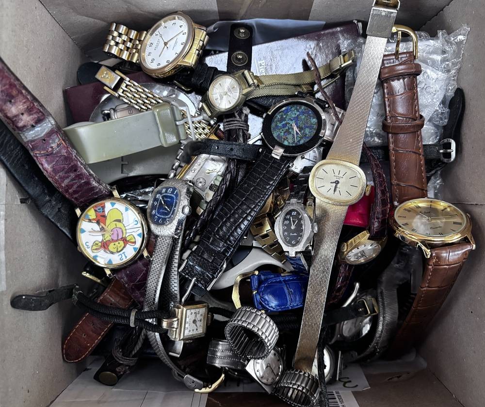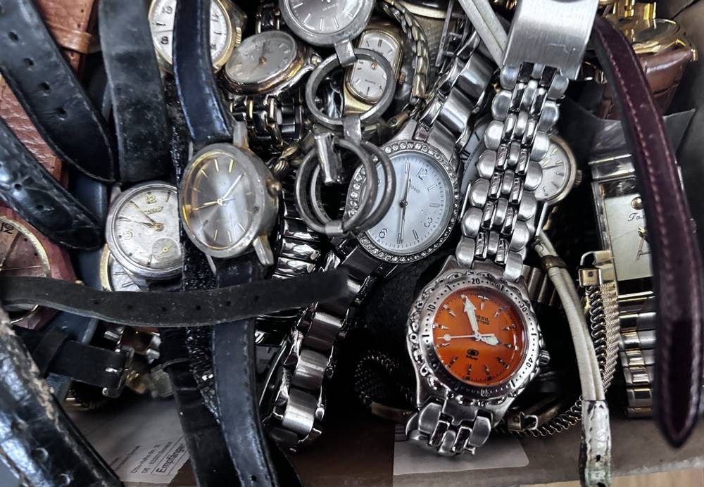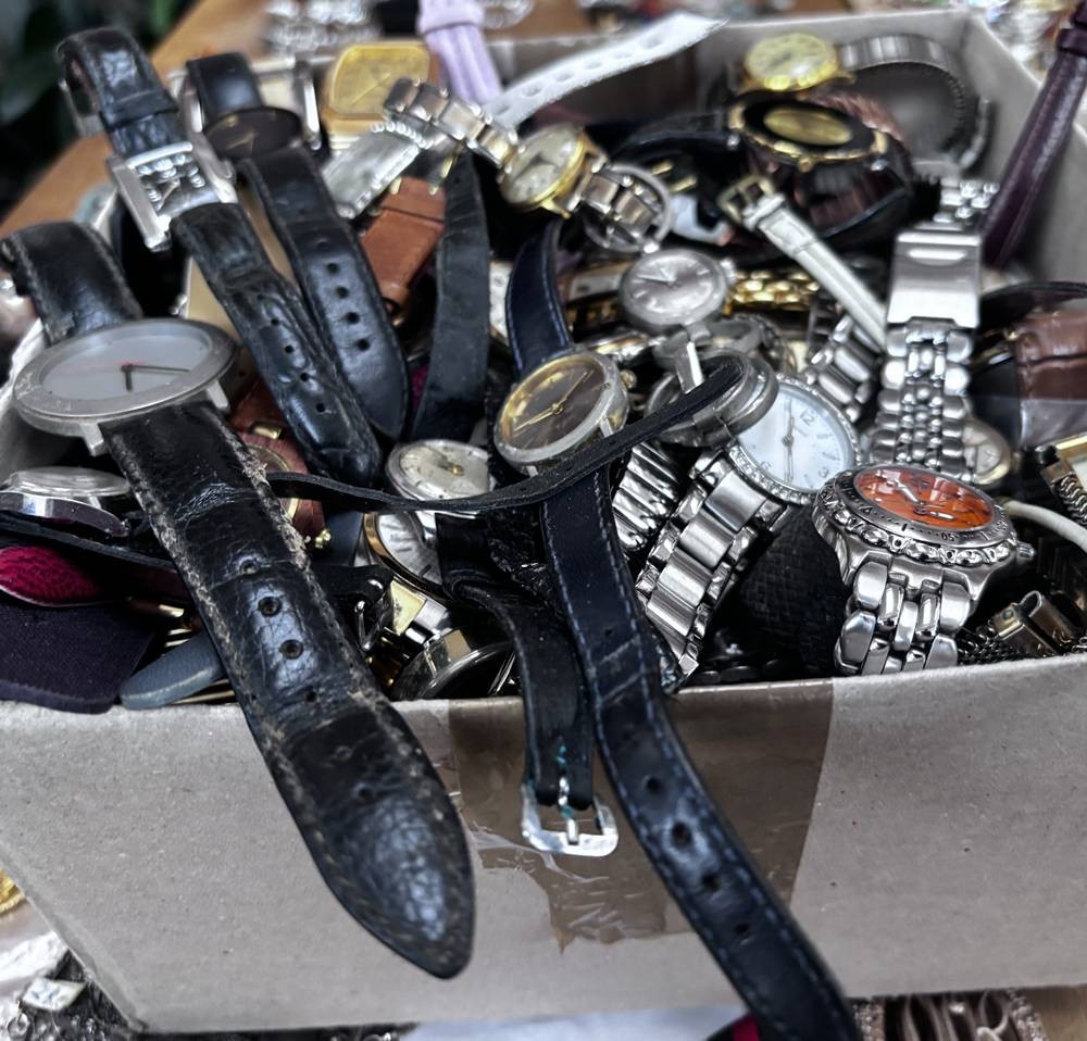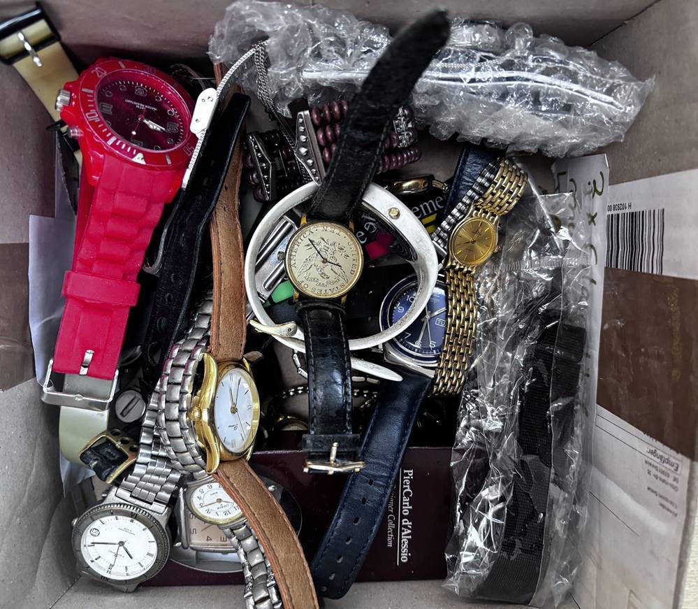 Karton voller Damenuhren, Quartz und mechanisch, auch Dugena, Seiko, Fossil etc. Nicht überprüft, ca. 50 Teile [1]